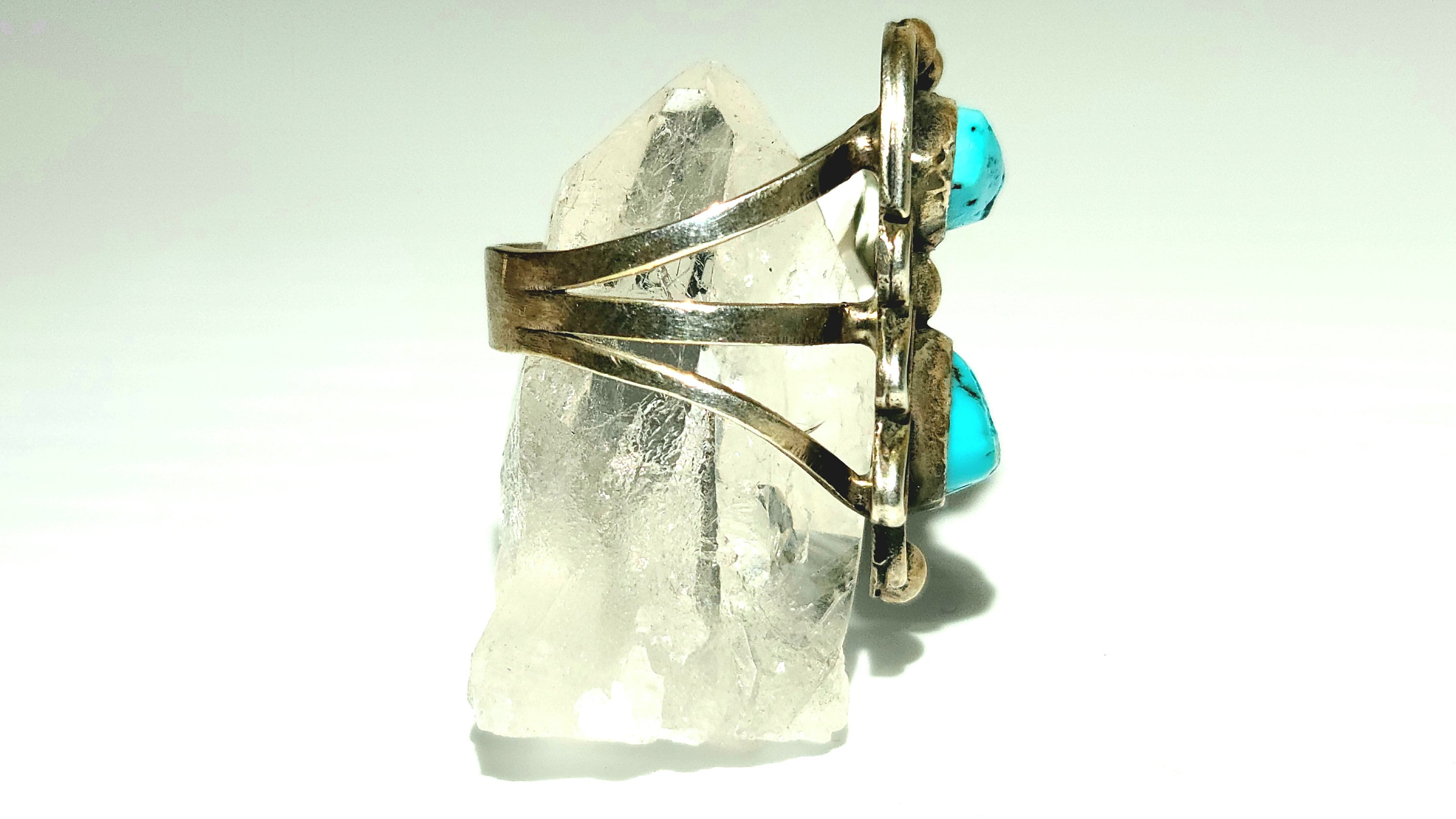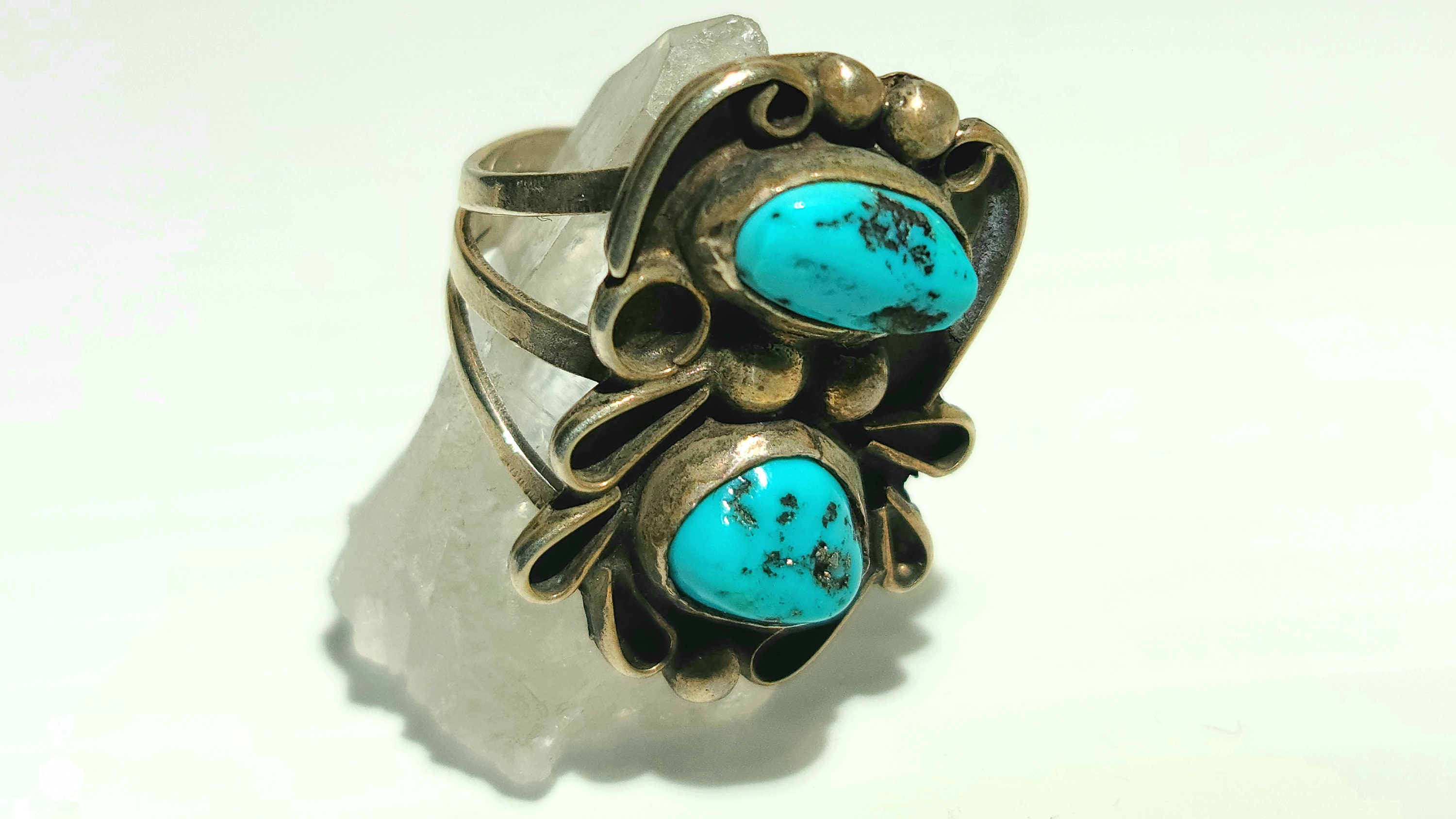 This is a beautiful vintage Navajo sterling silver ring, featuring two pieces of genuine turquoise and a beautiful patina.