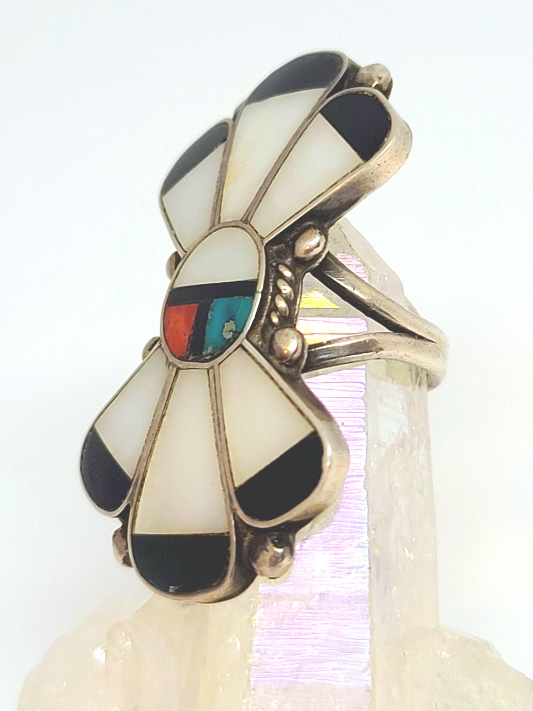 This is a beautiful vintage sterling silver ring, featuring Mother of Peal, Coral, Turquoise and obsidian inlay.Ring is a size 7, but can be resized. Please send us an inquiry if you are interested in having the ring resized.