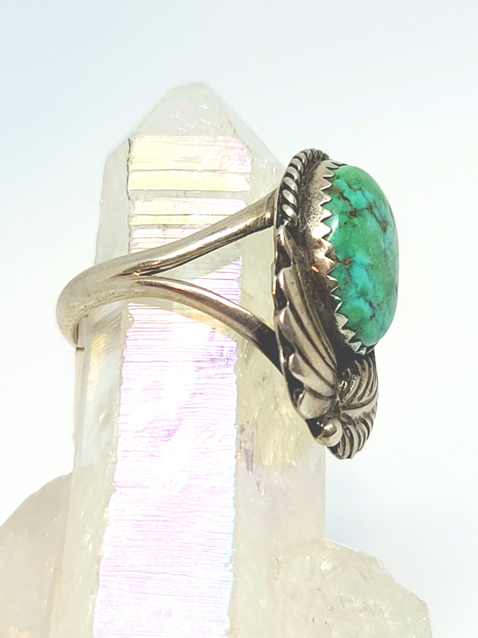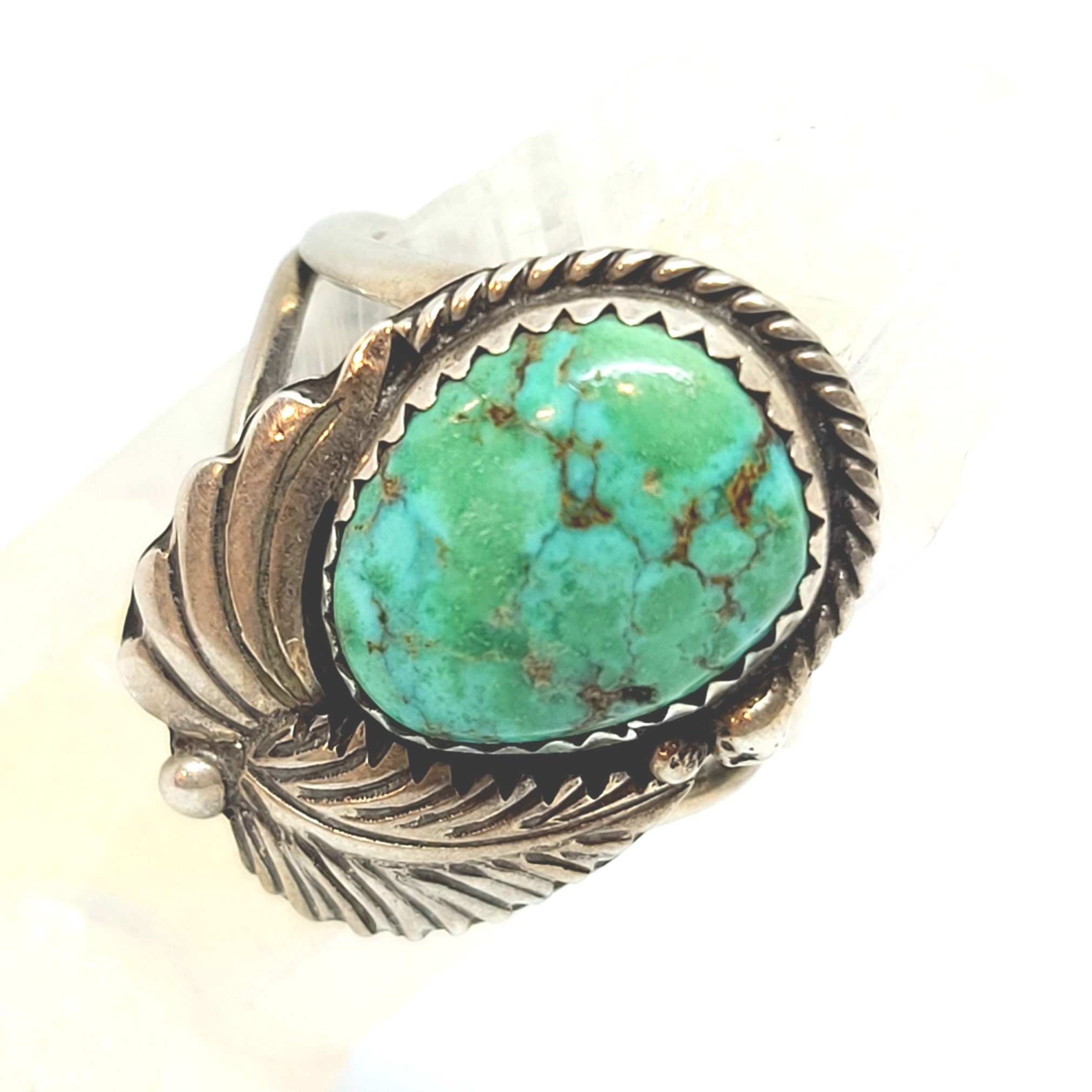 This beautiful vintage ring features a stunning natural turquoise cabochon. This is a one of a kind ring.