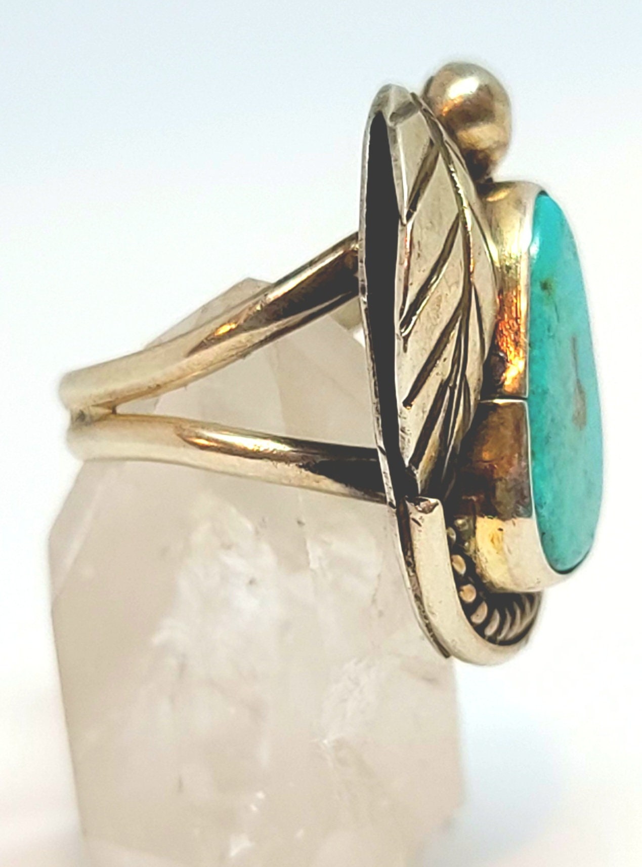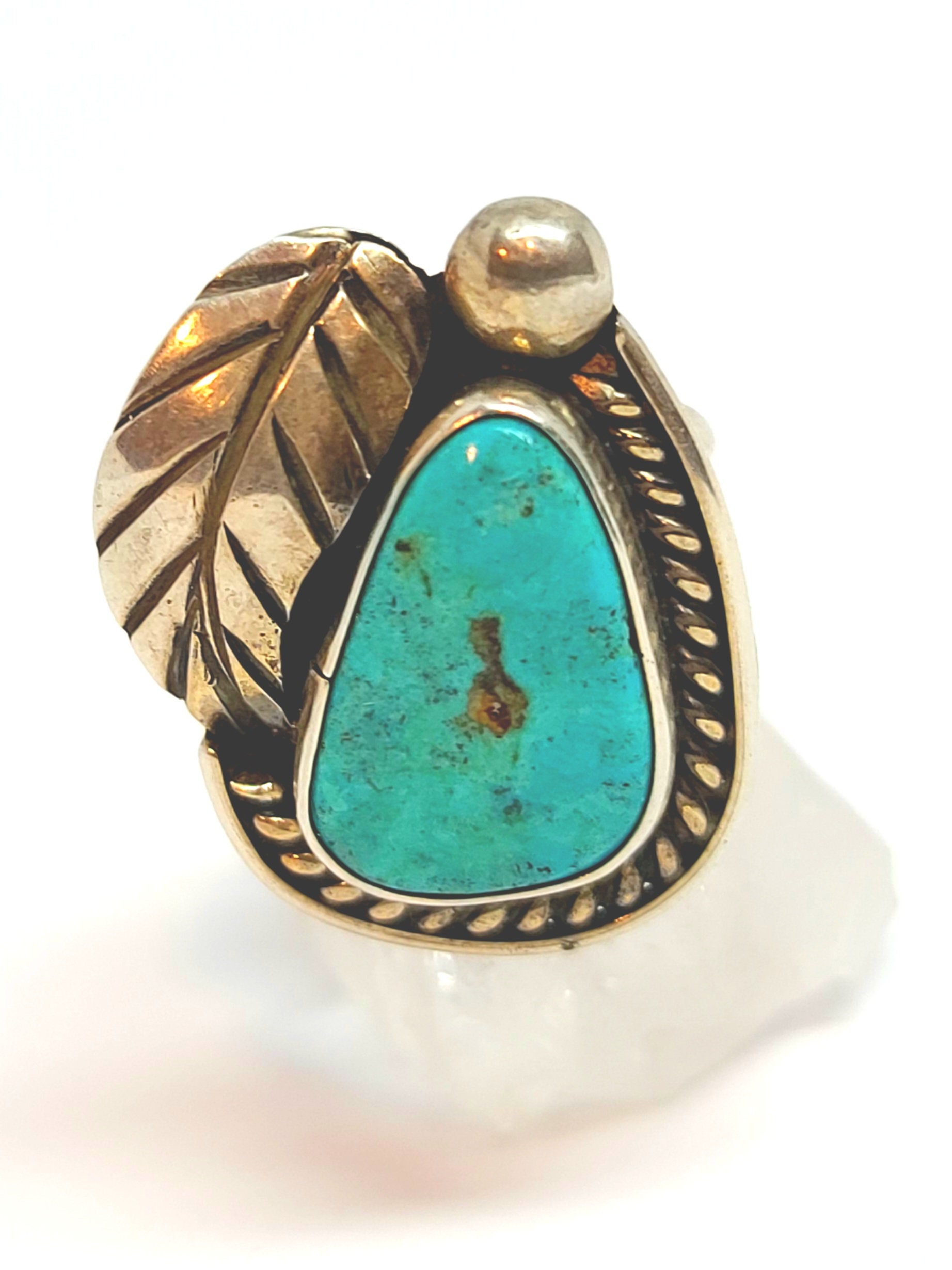 This vintage, handmade, Native American Silver ring is the perfect addition to your collection! Size 4.5, features a beautiful Turquoise cabochon with a decorative etched leaf curling around it.
