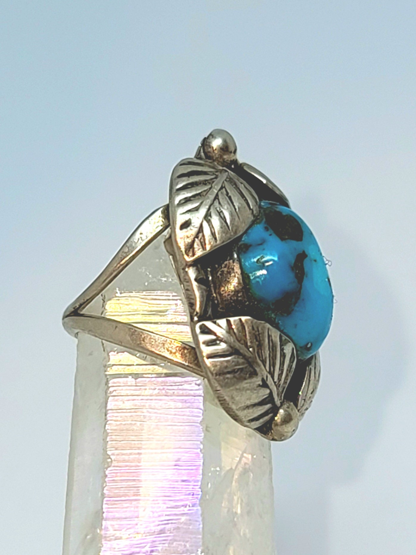This beautiful vintage ring features a stunning natural turquoise cabochon. This is a one of a kind ring.