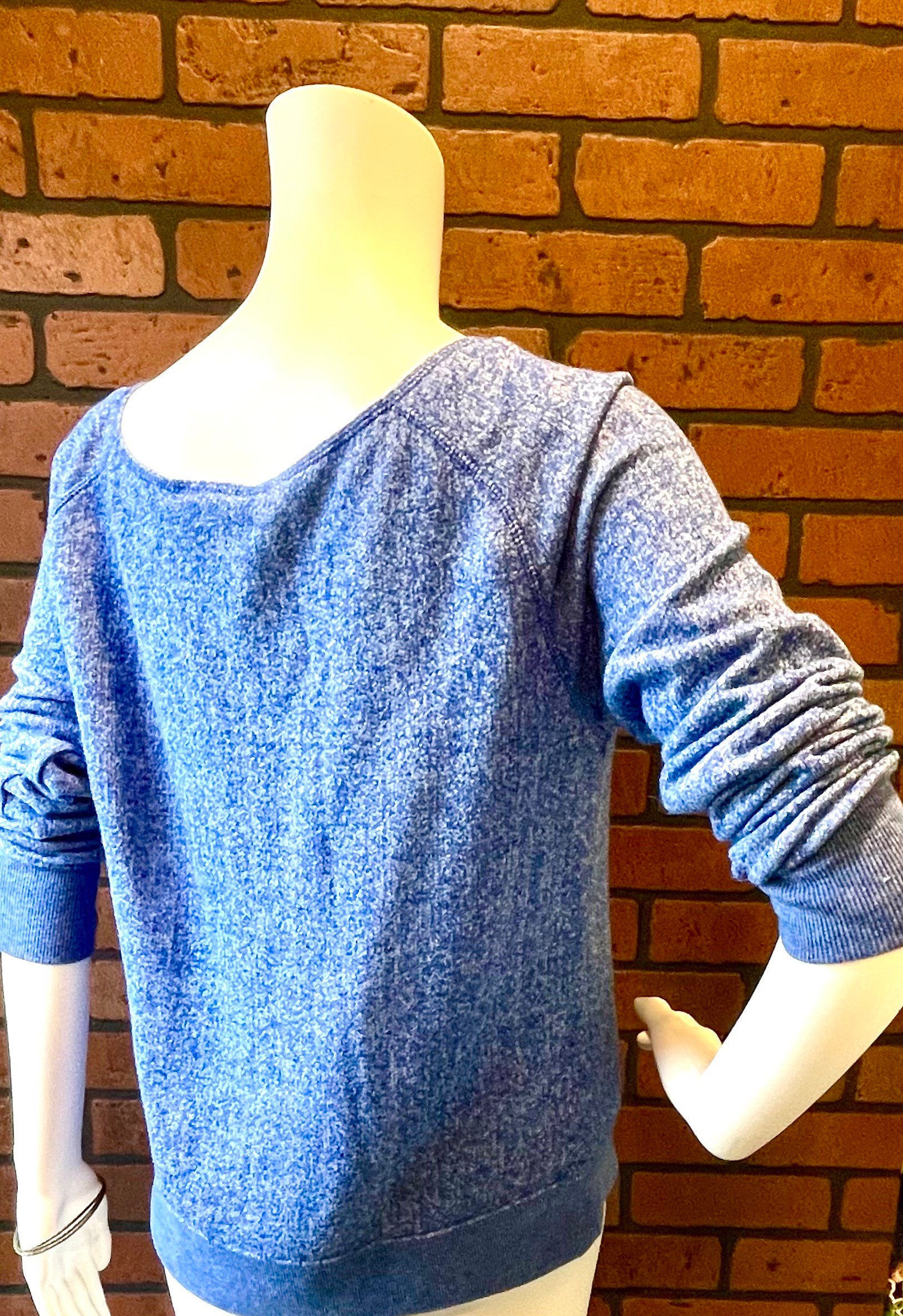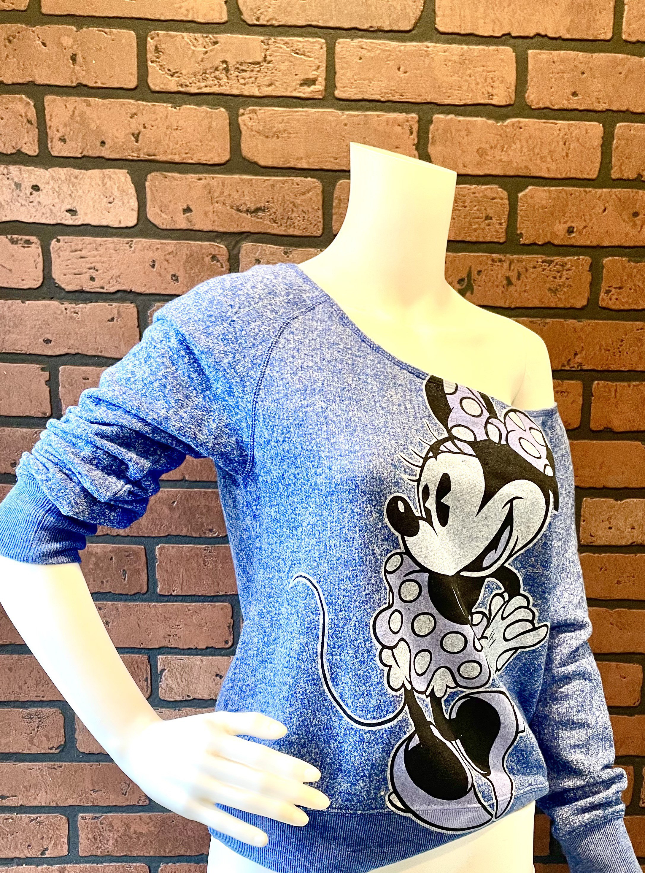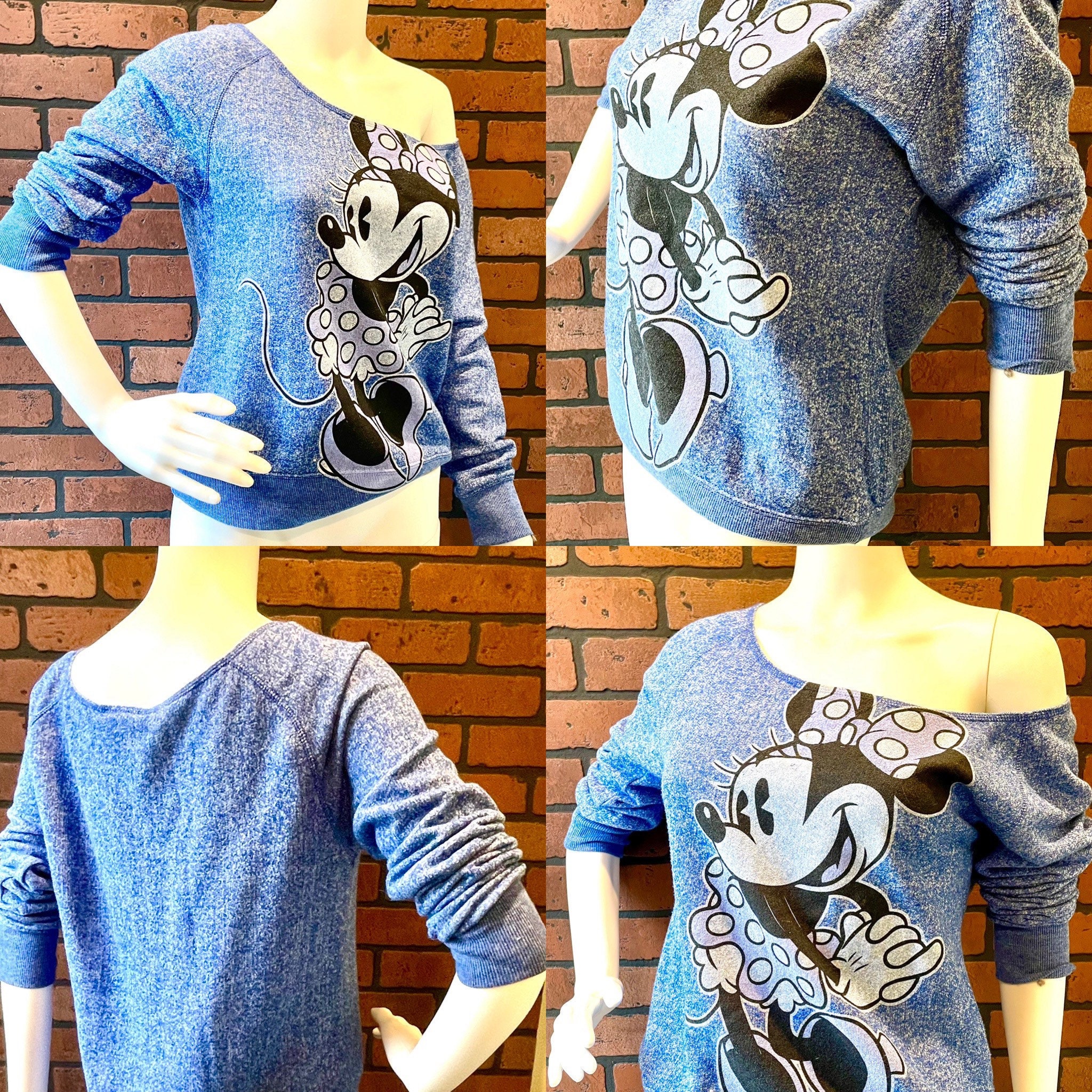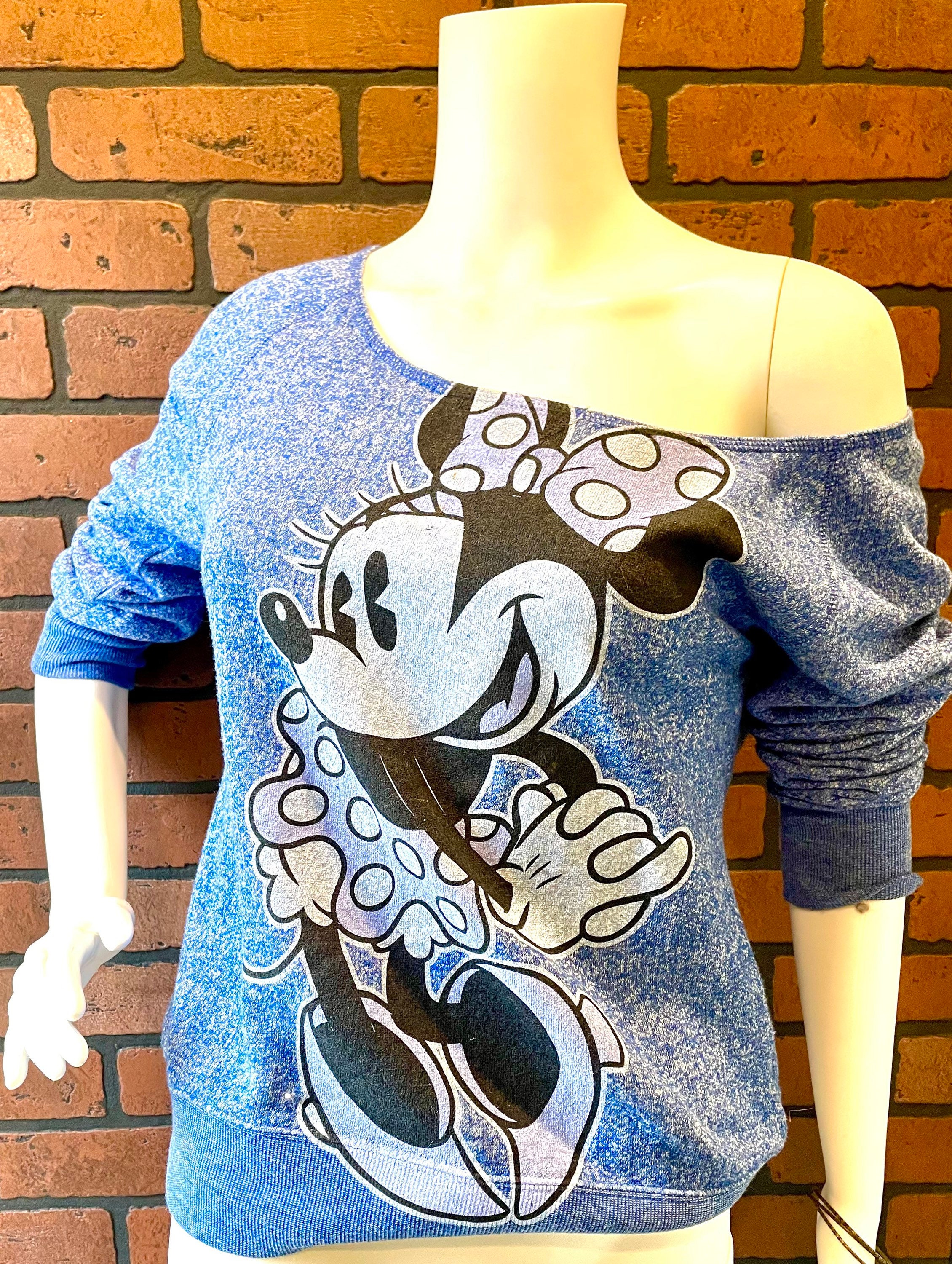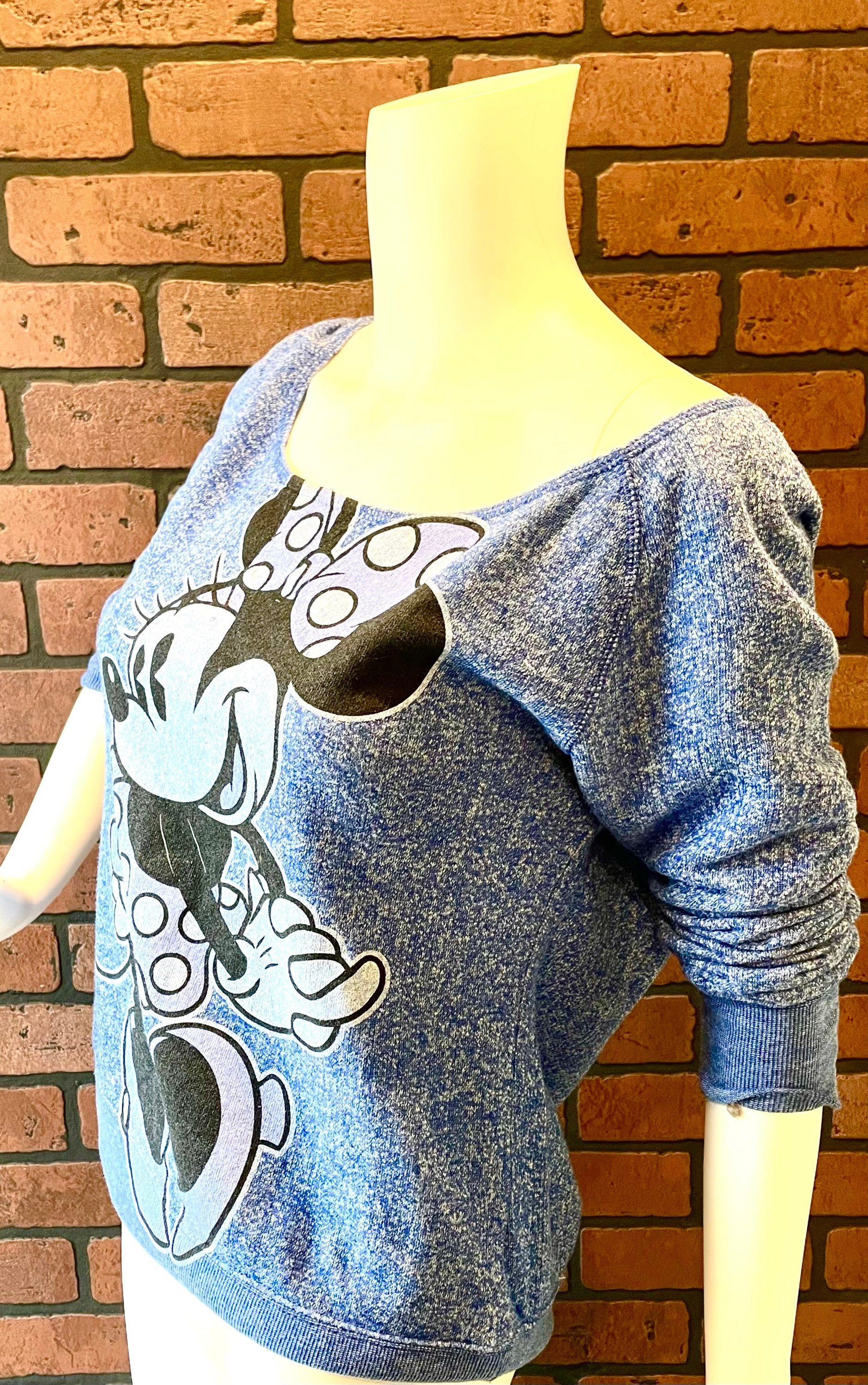 This vintage blue heathered Minnie Mouse scoop neck sweatshirt is a very rare piece of officially licensed Disney merchandise.