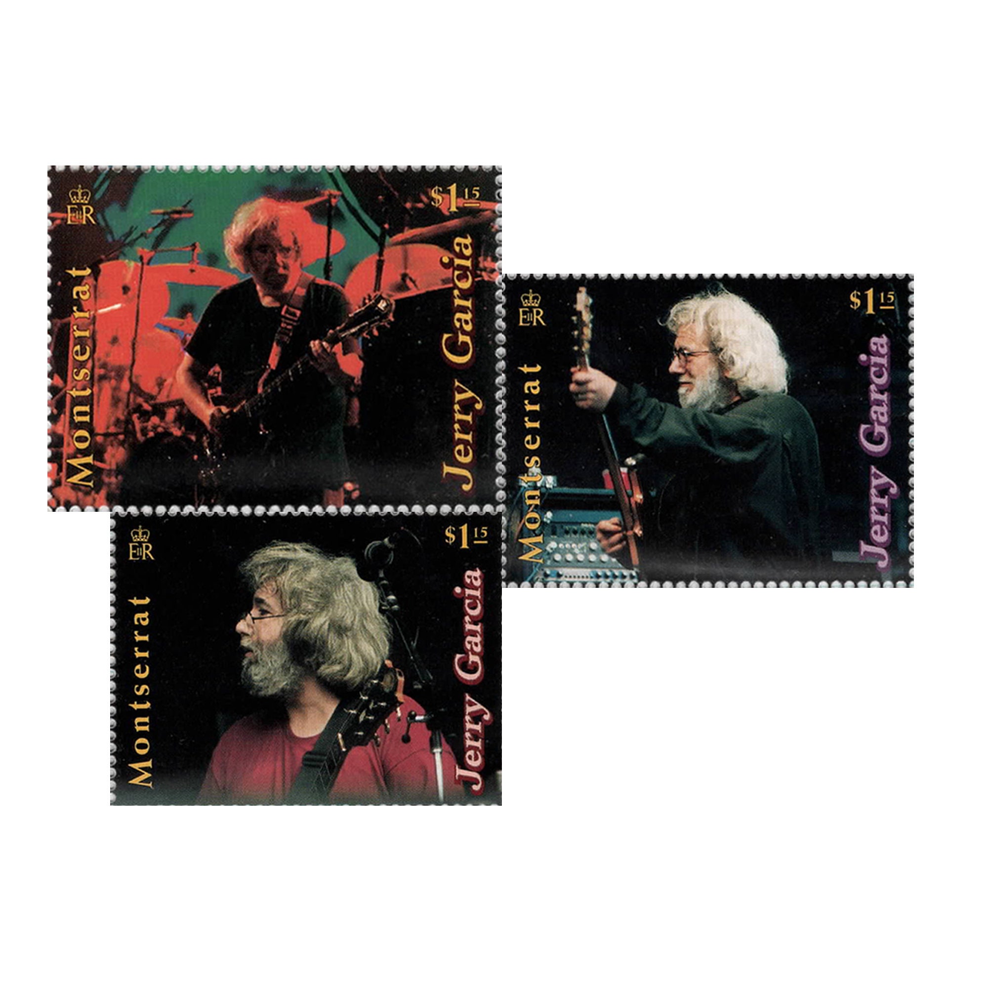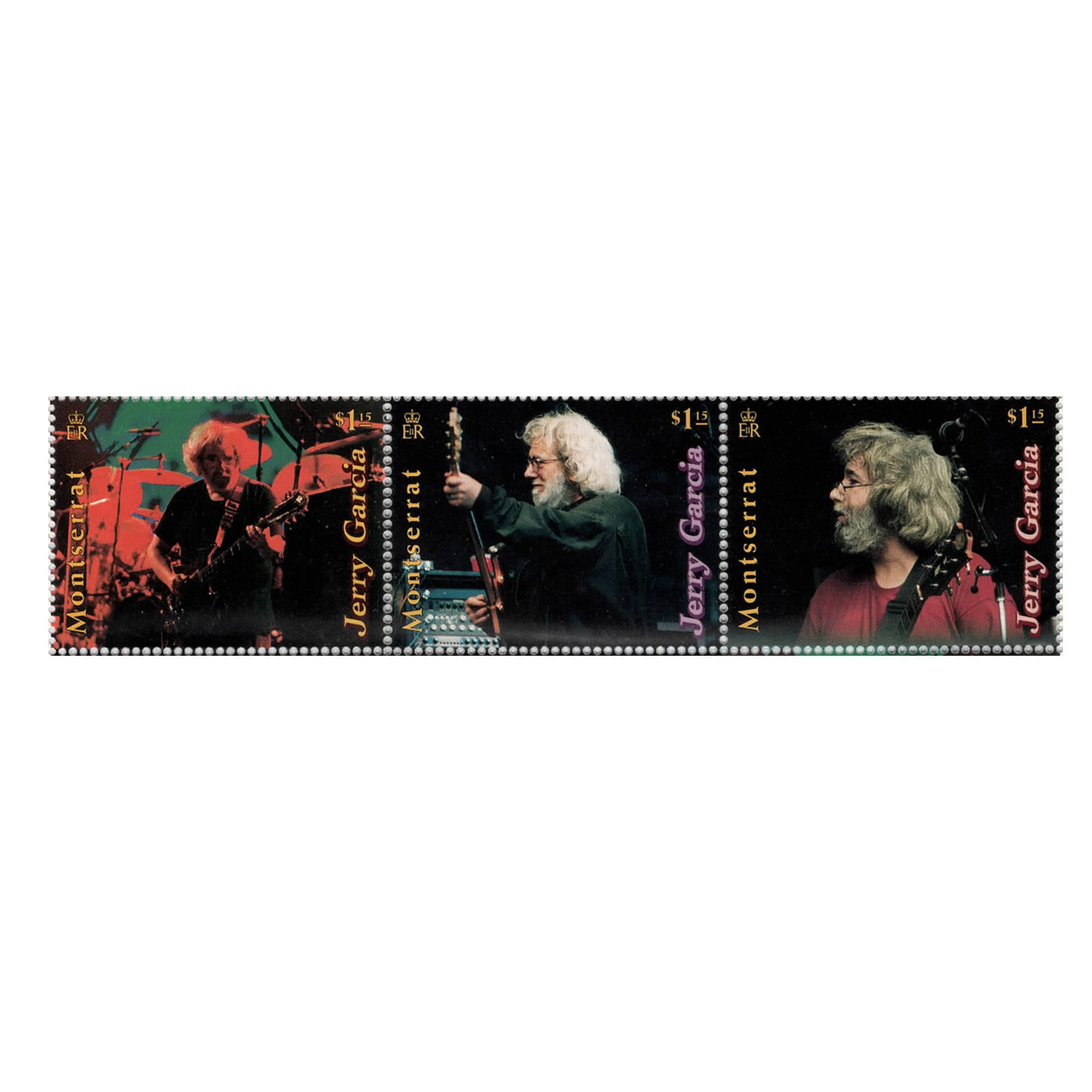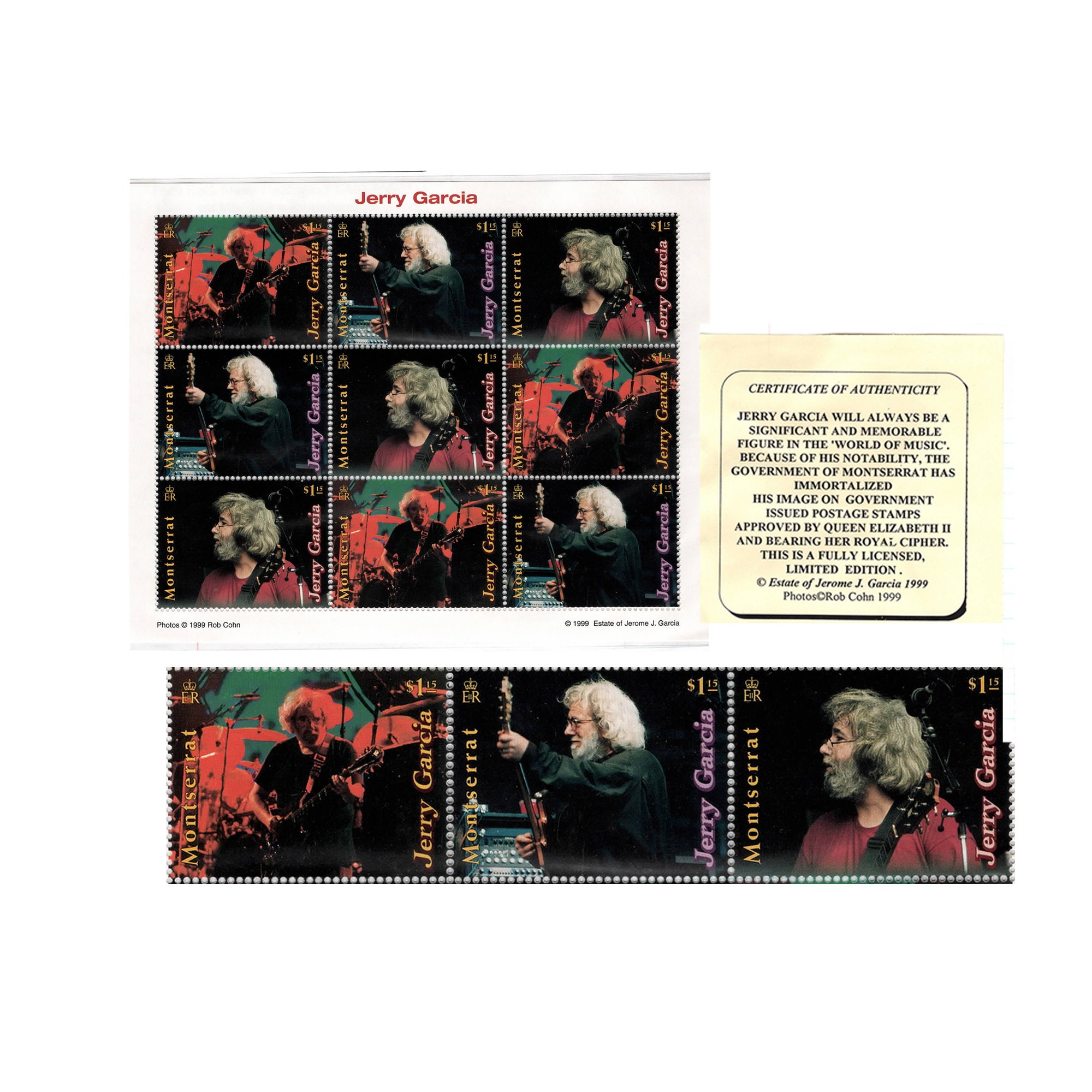 Rare official Mongolpost postage stamps featuring three iconic photographa of Jerry Garcia, performing with the Grateful Dead. This series was released 1999 and is licensed by the estate of Jerome J. Garcia. Sheet includes protective plastic and Certificate of Authenticity.