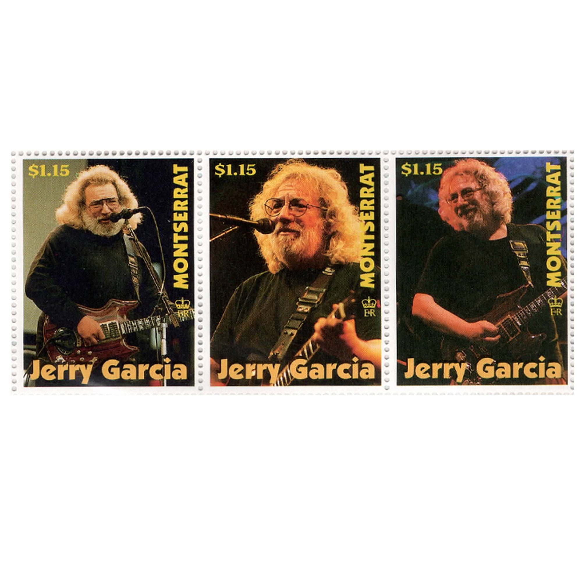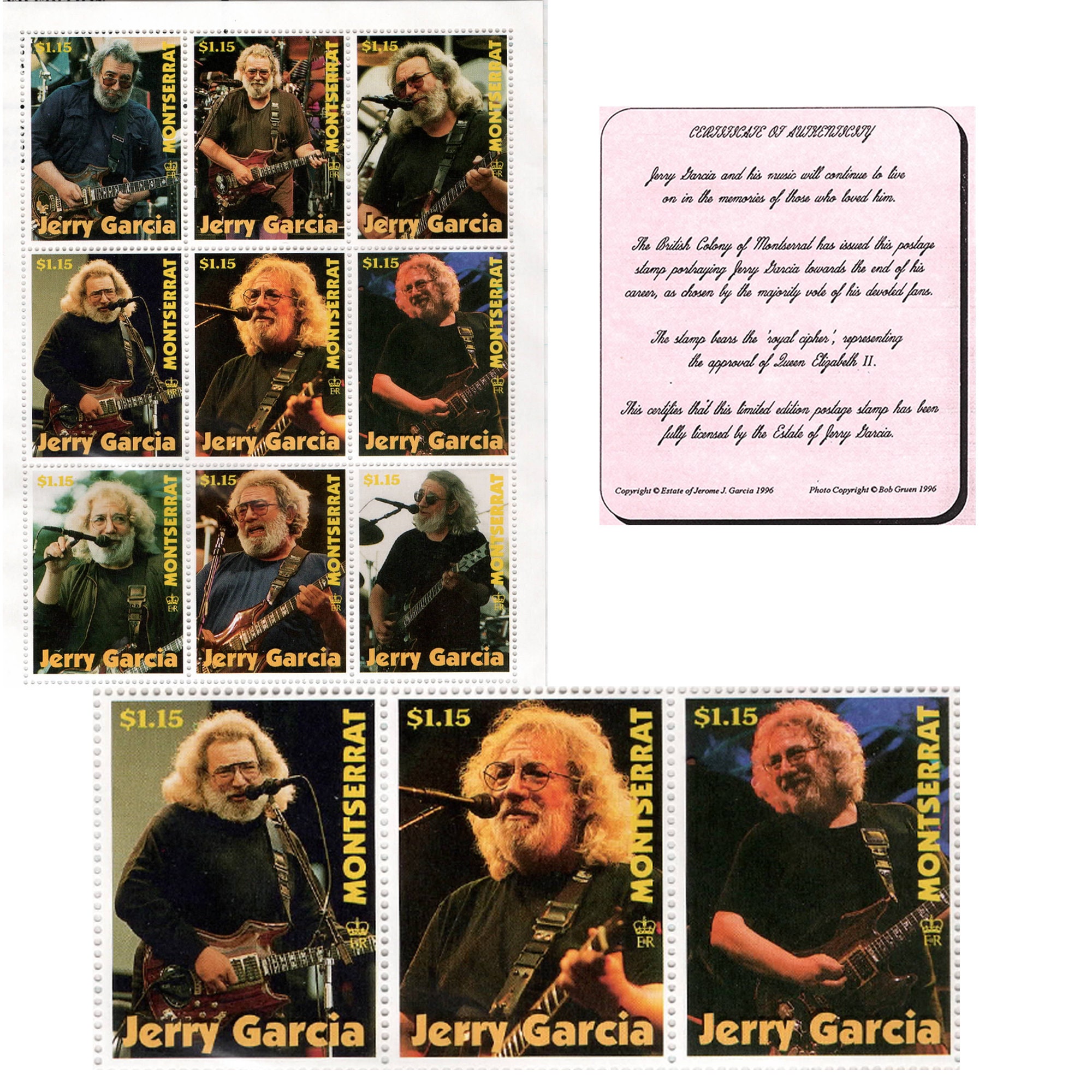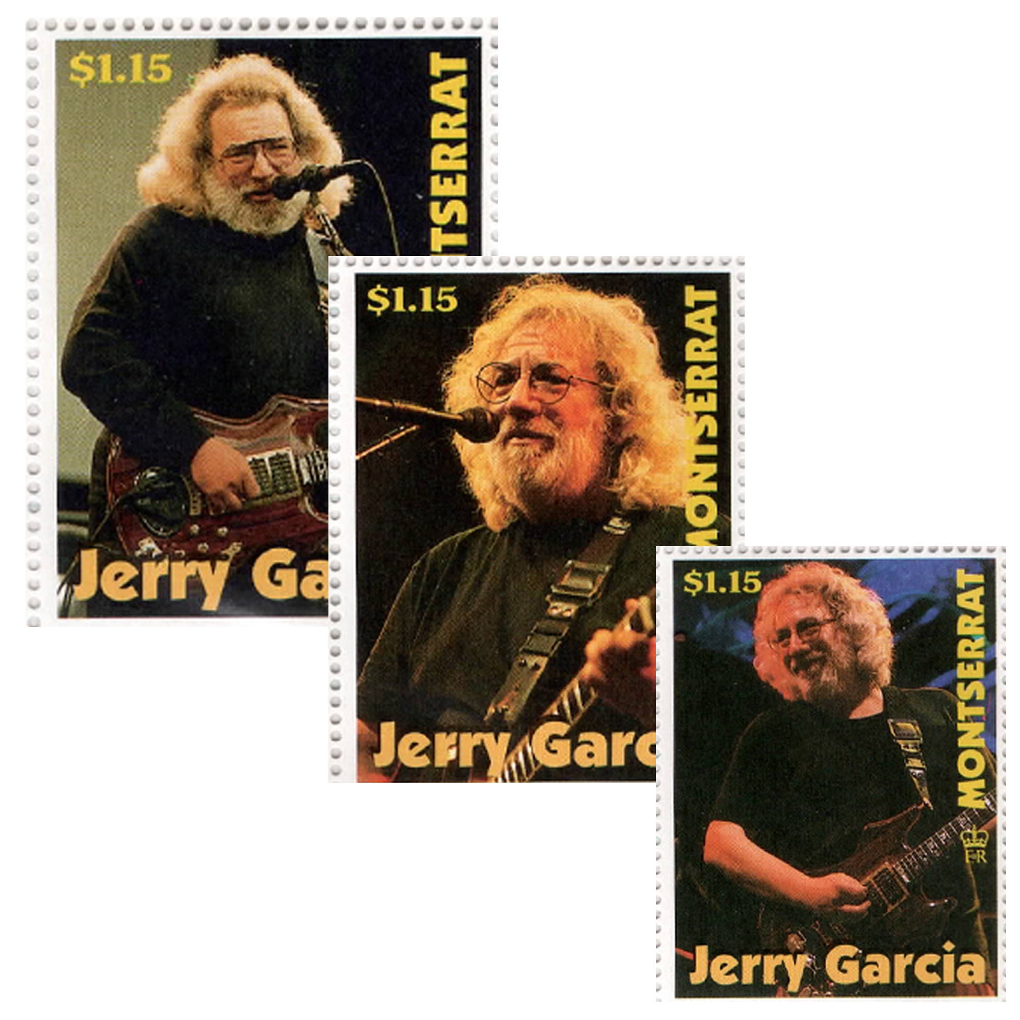 Rare official Mongolpost postage stamps featuring three iconic photographa of Jerry Garcia, performing with the Grateful Dead. This series was released 1999 and is licensed by the estate of Jerome J. Garcia. Sheet includes protective plastic and Certificate of Authenticity.