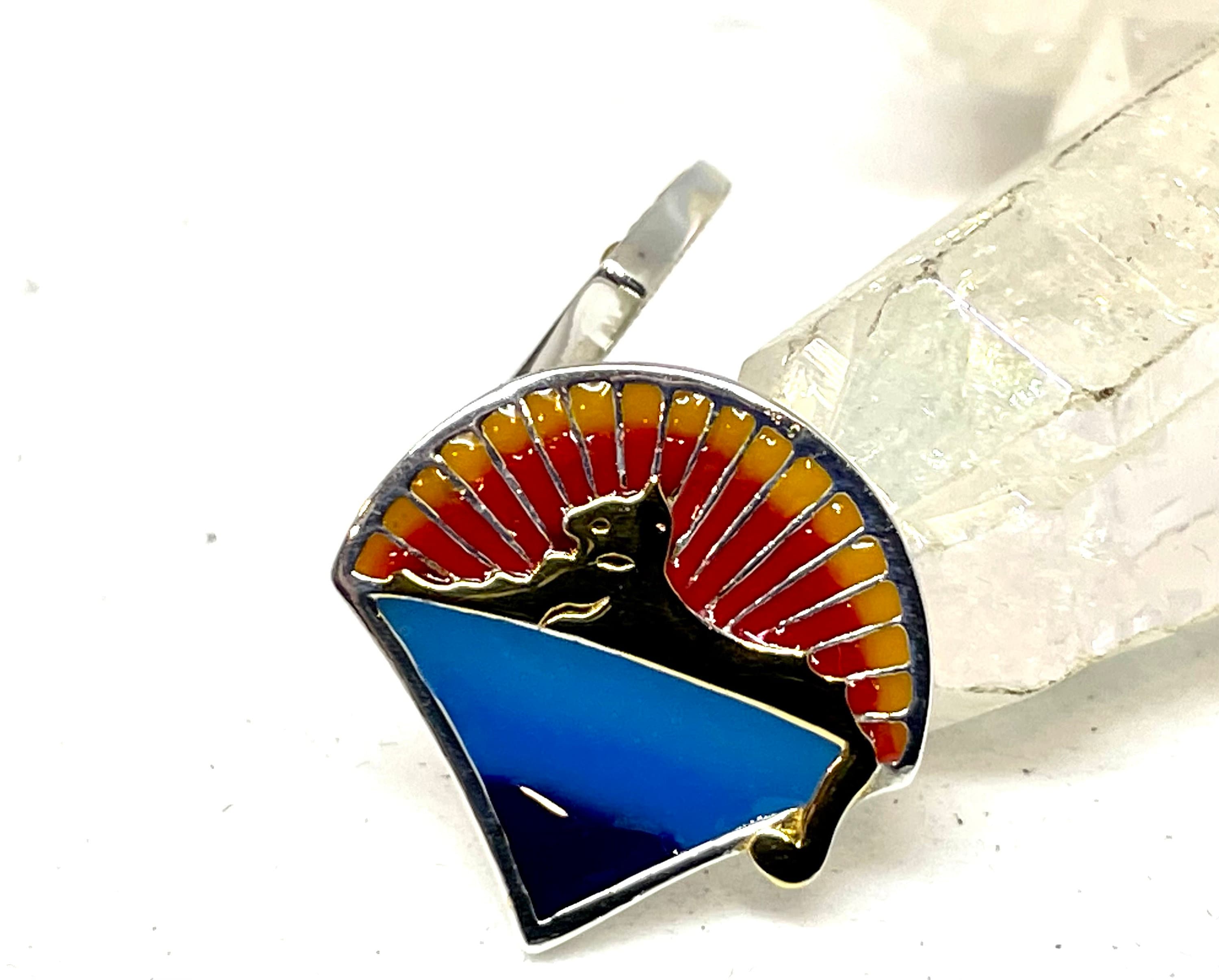 For sale here we have a lovely pair of hand-cast, Cats Down Under the Stars stud earrings, crafted entirely of .925 sterling silver, featuring gold accents and jeweler’s grade enamel. This is one of the most recognizable pieces of Jerry Garcia insignia!