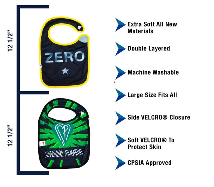 "Bring home one of the country's top-selling American Alternative bands in style with the Smashing Pumpkins bibs 2 pack. Featuring both the band logo and “Zero” album cover designs, protect your young one's clothes with one of the soft cotton bibs.