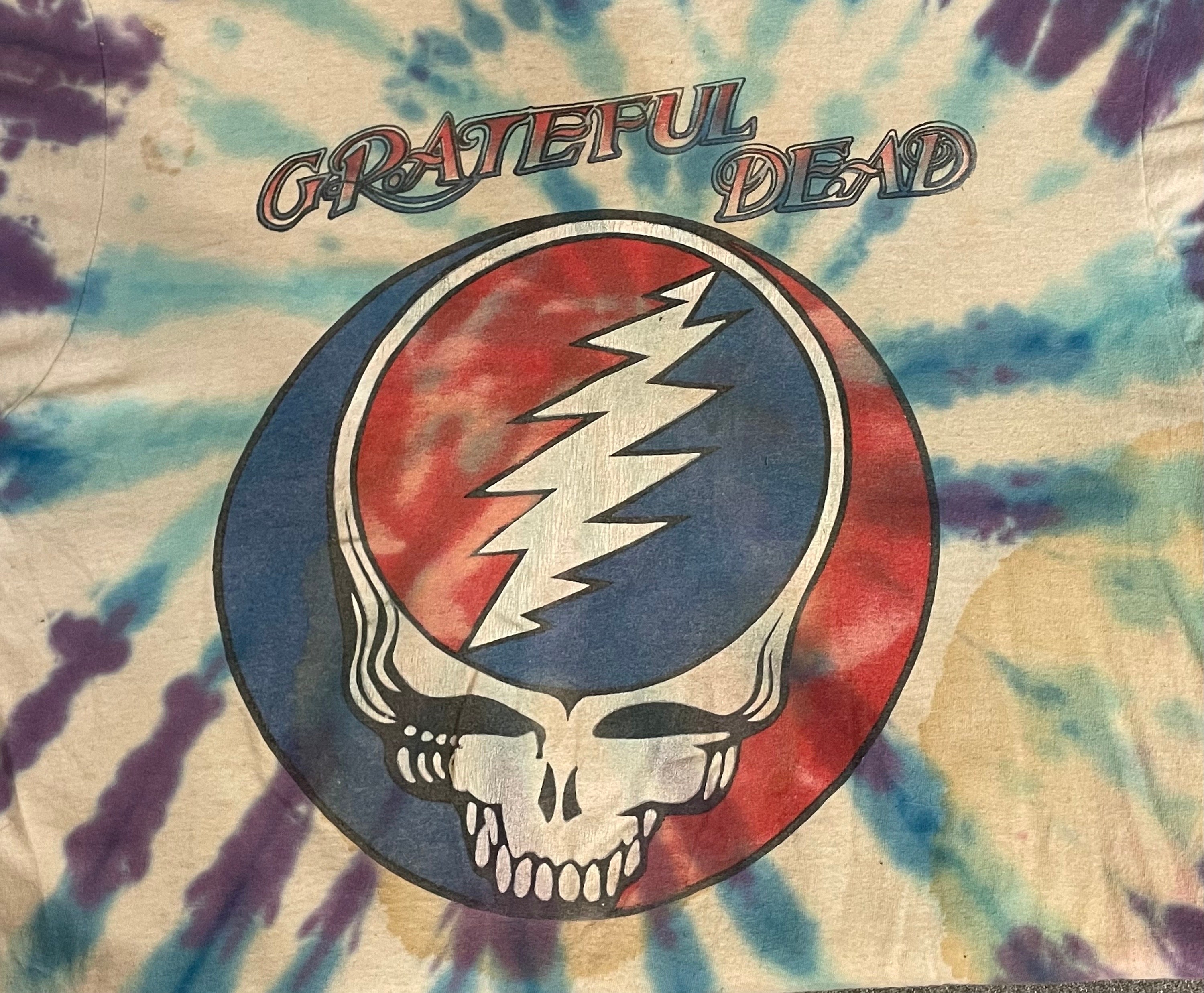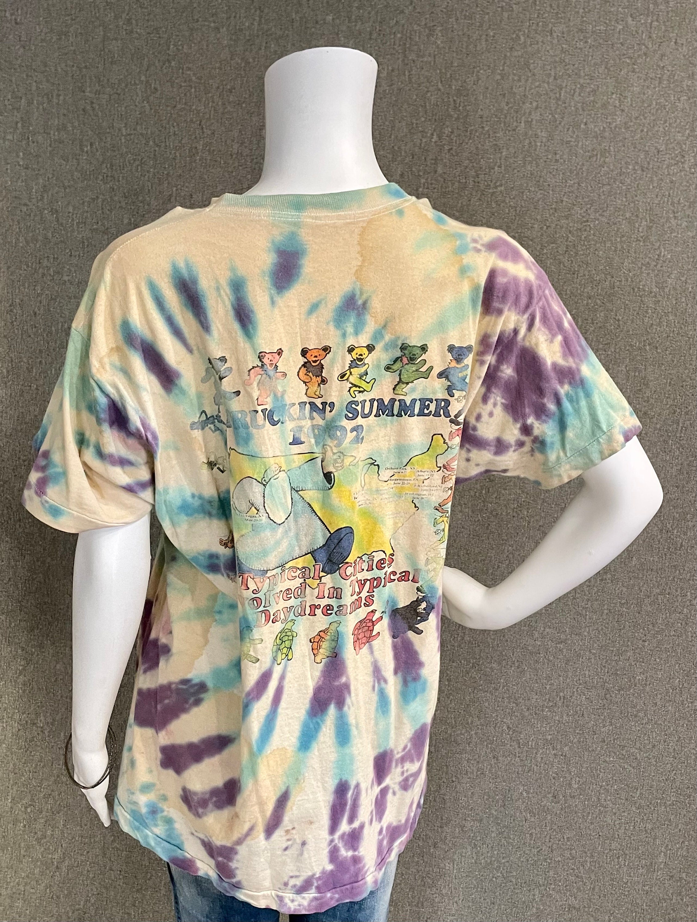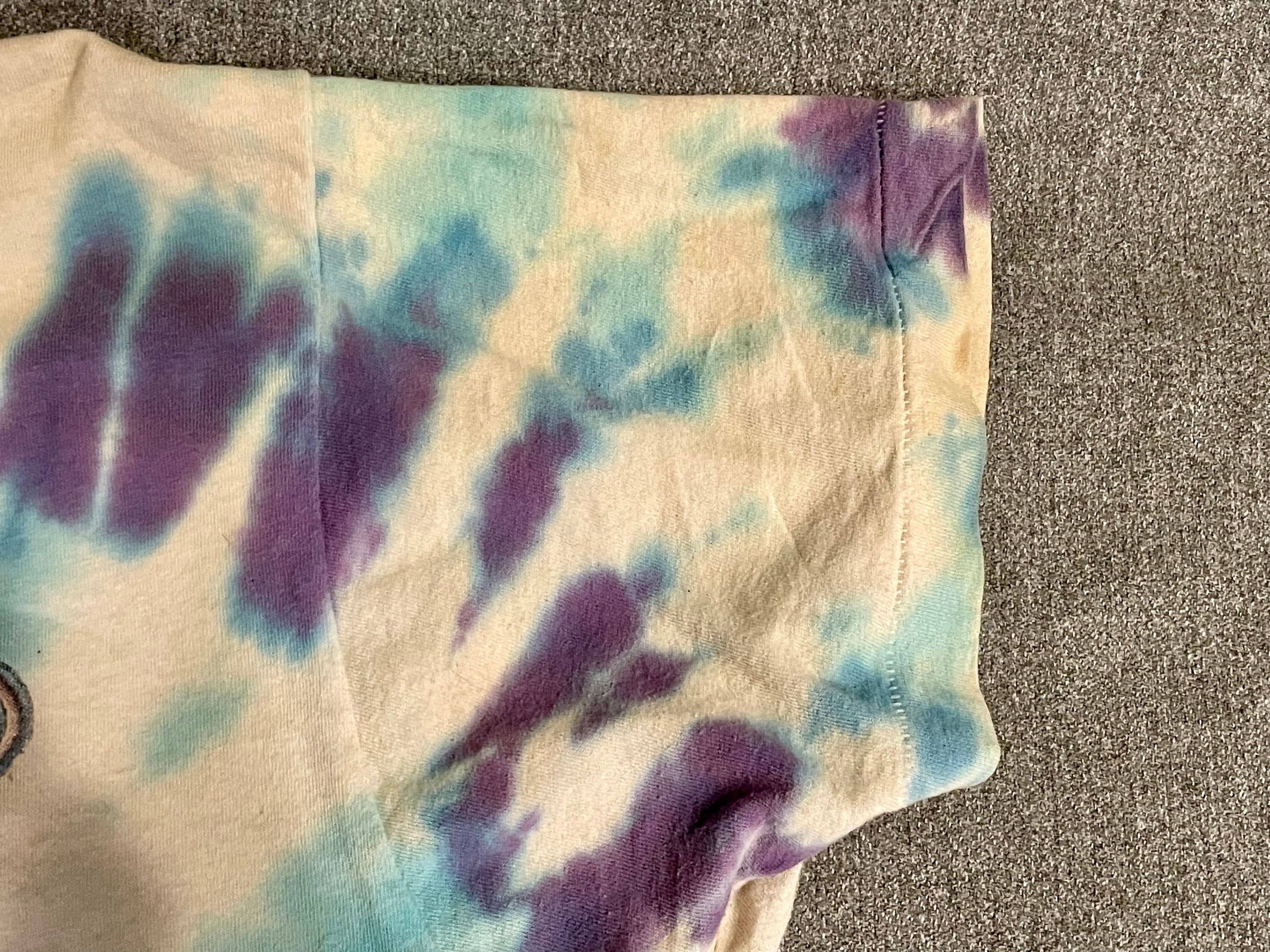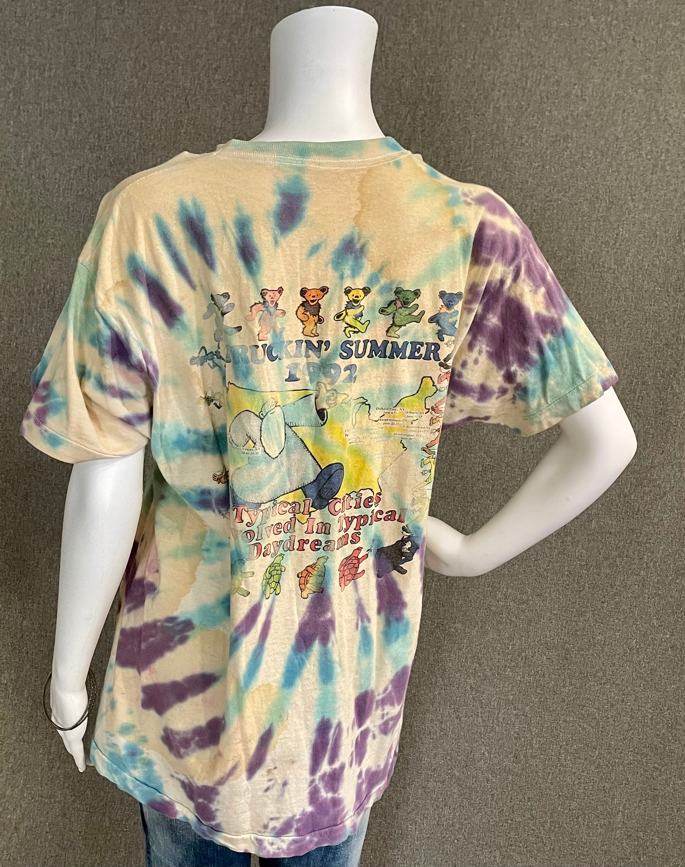 This is a rare vintage well-worn official Grateful Dead tour t-shirt from the summer of 1992. Shirt features a steal your face printed on the front, with dancing bears dancing across the US on the back. Shirt is White with blue and purple tie-dye. Shows signs of being well loved at many shows since 1992. Fruit of the Loom size XL.