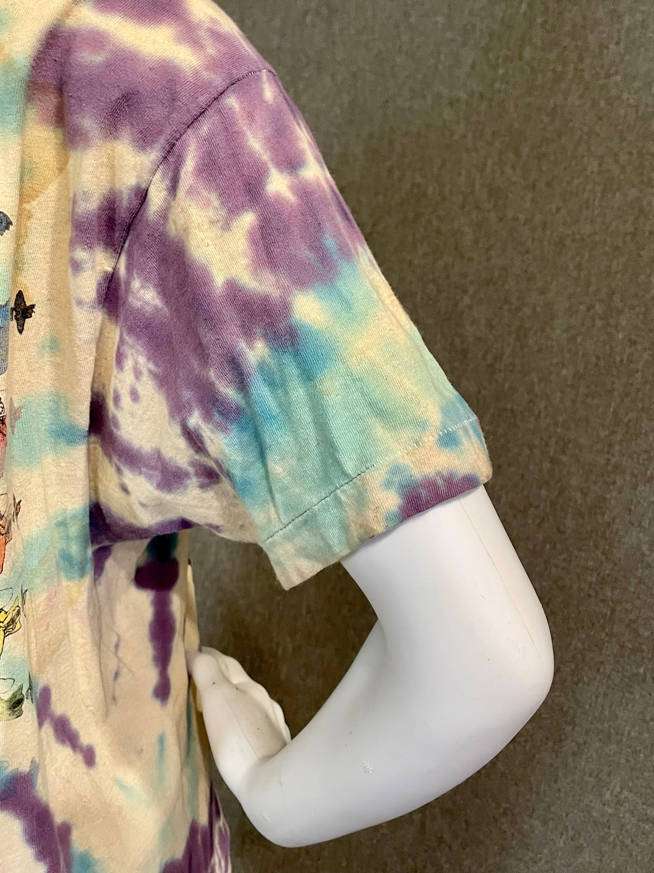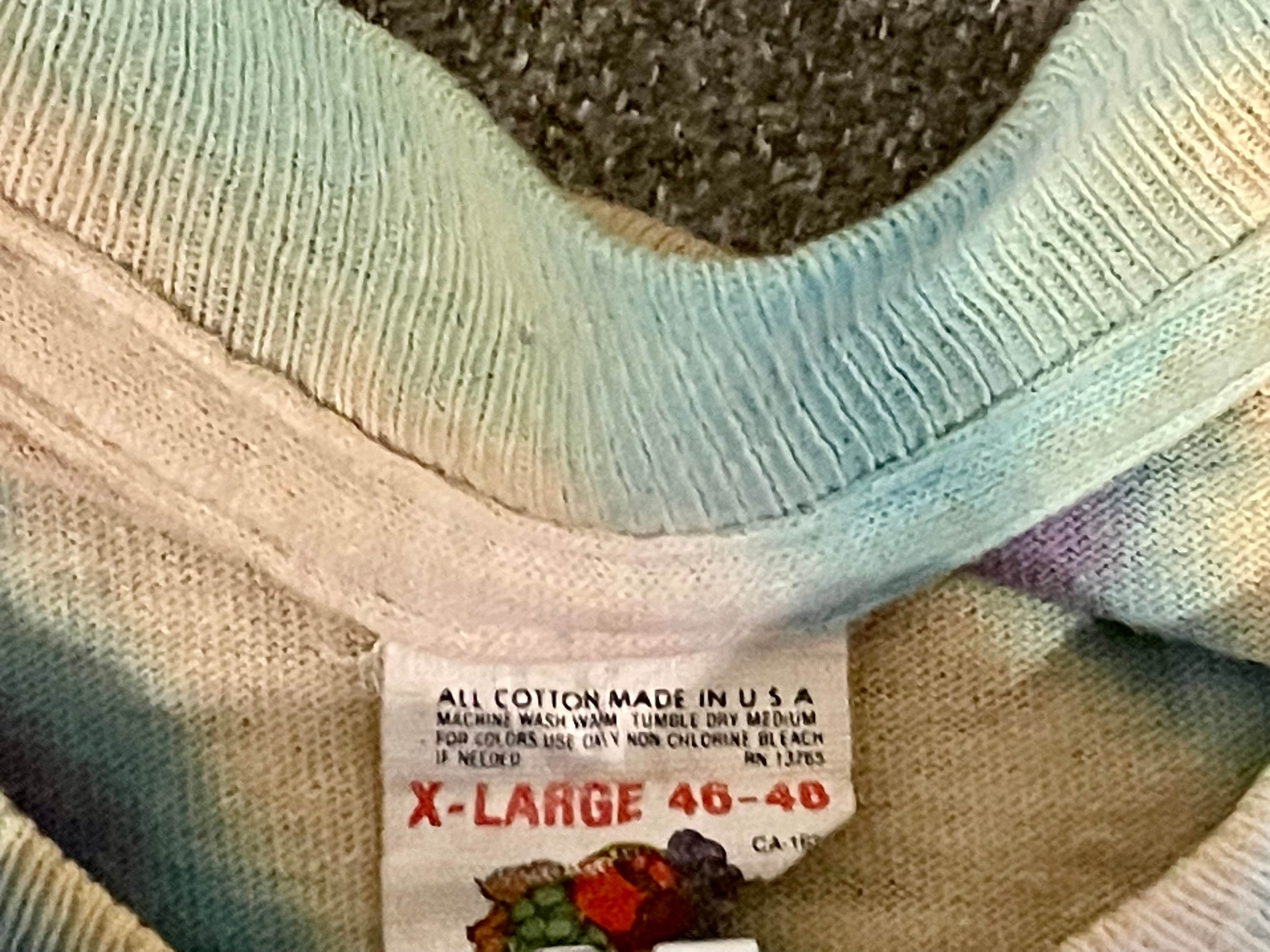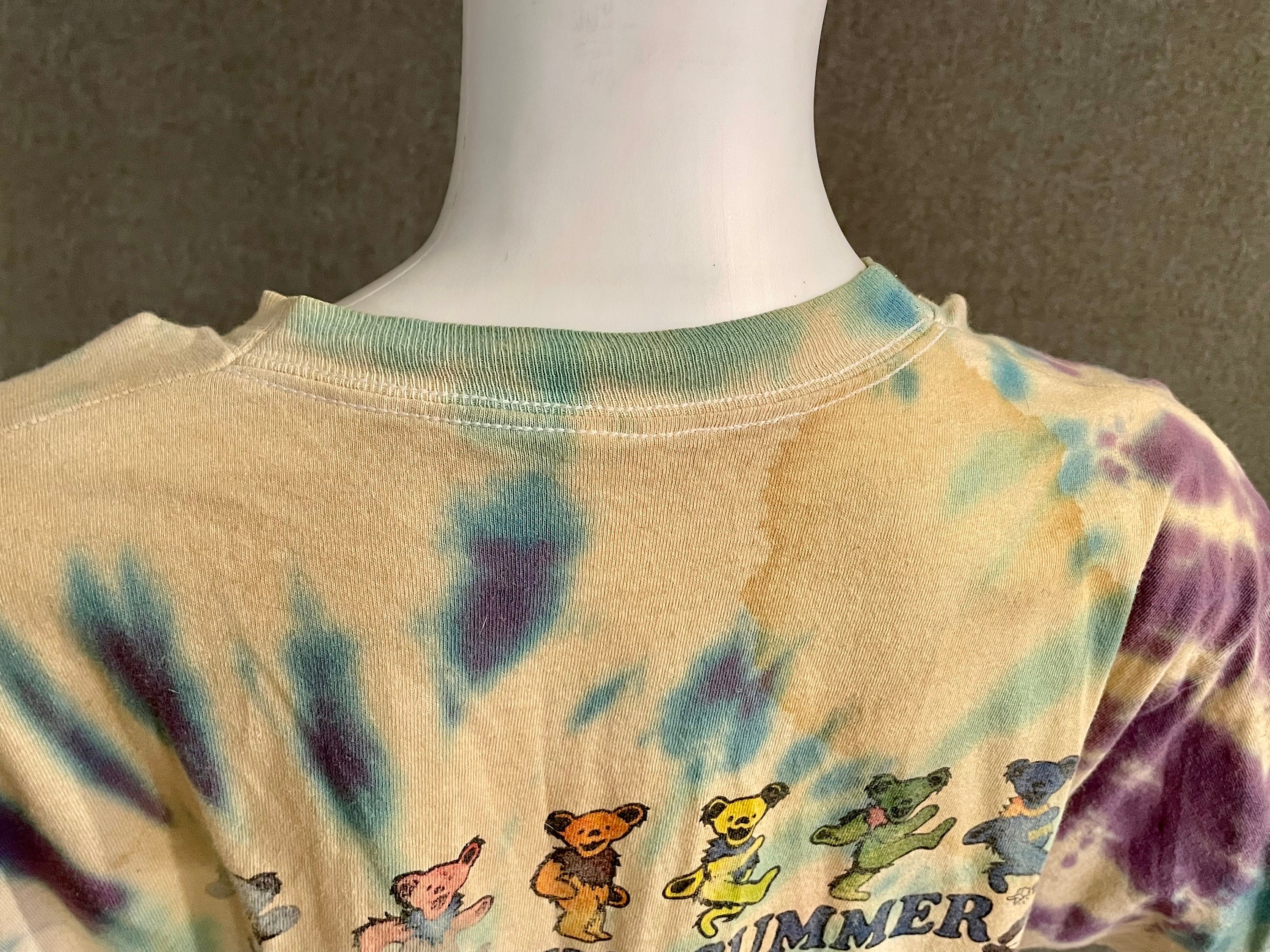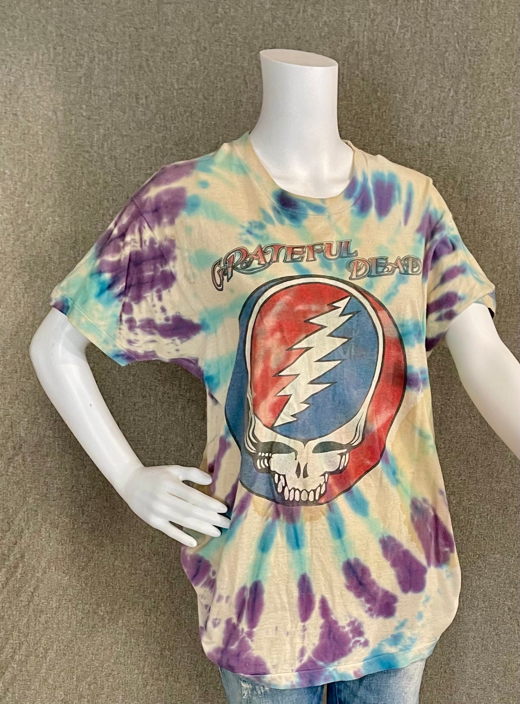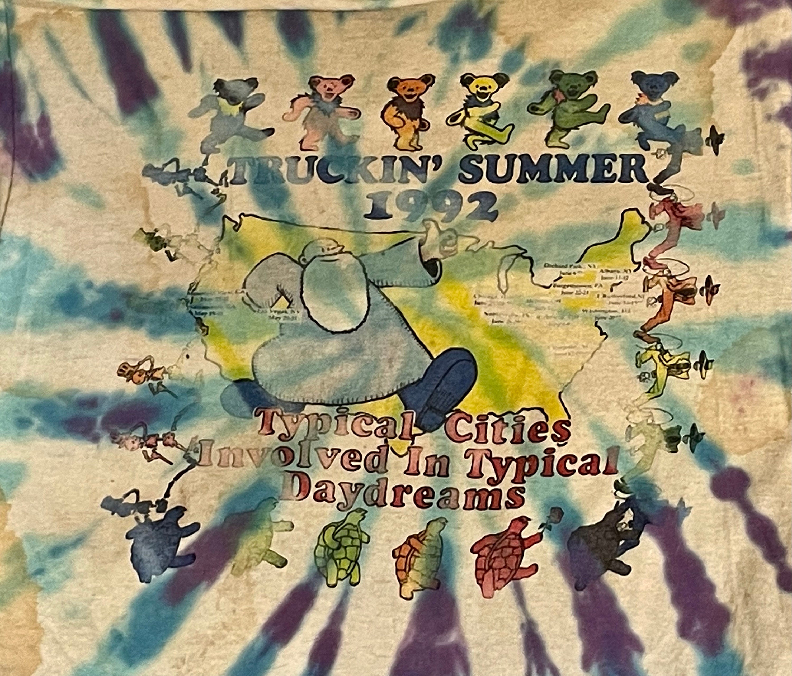 This is a rare vintage well-worn official Grateful Dead tour t-shirt from the summer of 1992. Shirt features a steal your face printed on the front, with dancing bears dancing across the US on the back. Shirt is White with blue and purple tie-dye. Shows signs of being well loved at many shows since 1992. Fruit of the Loom size XL.