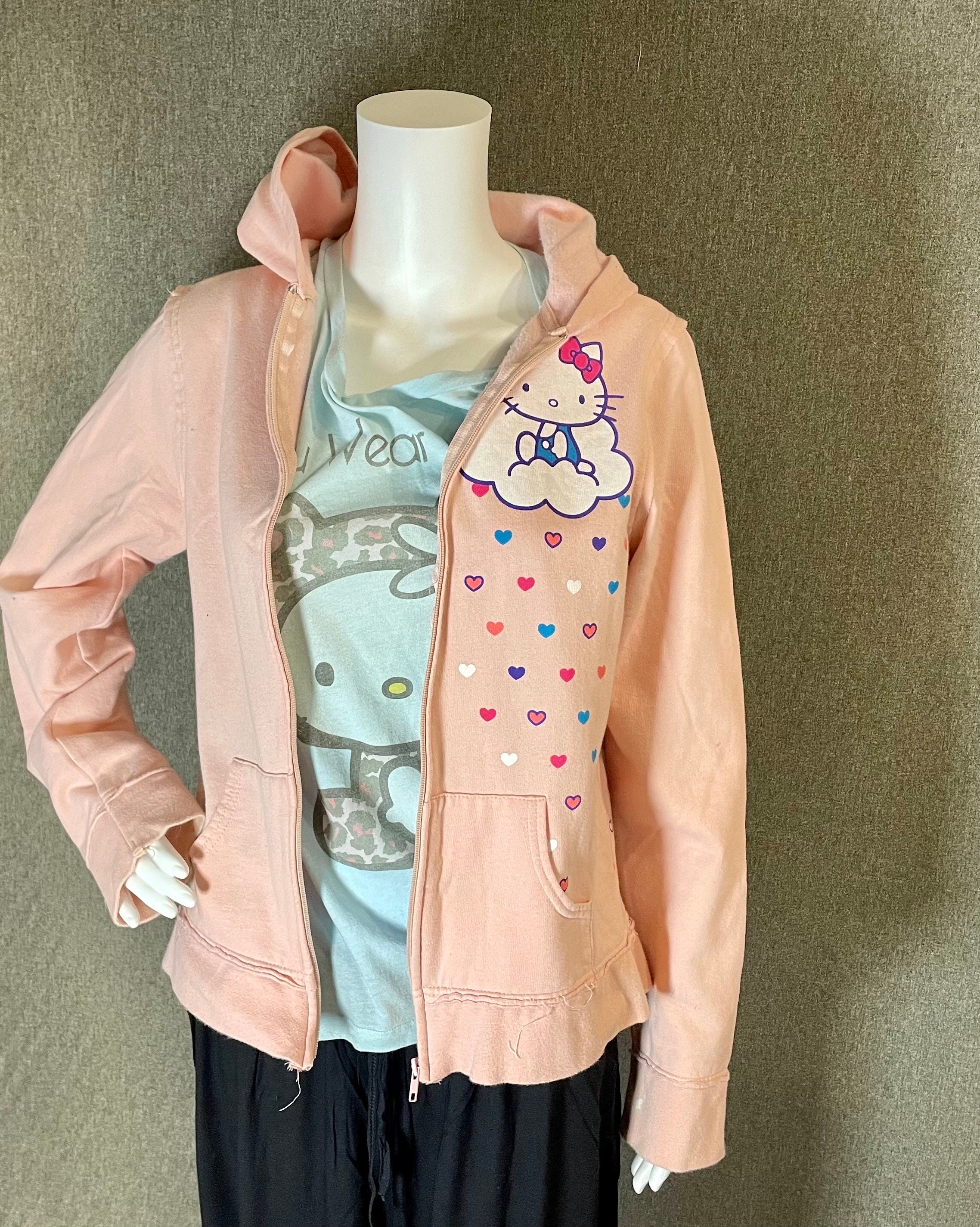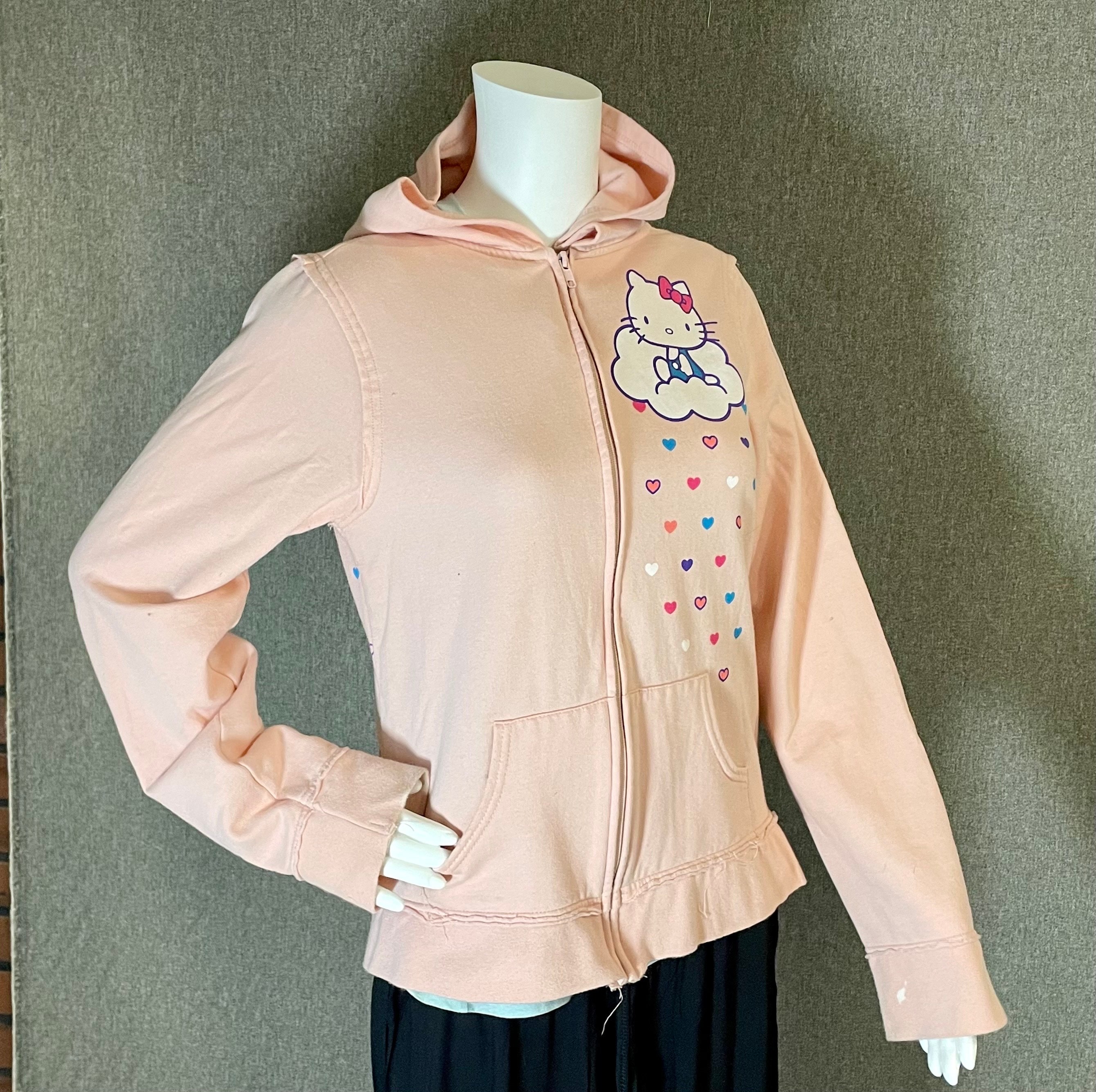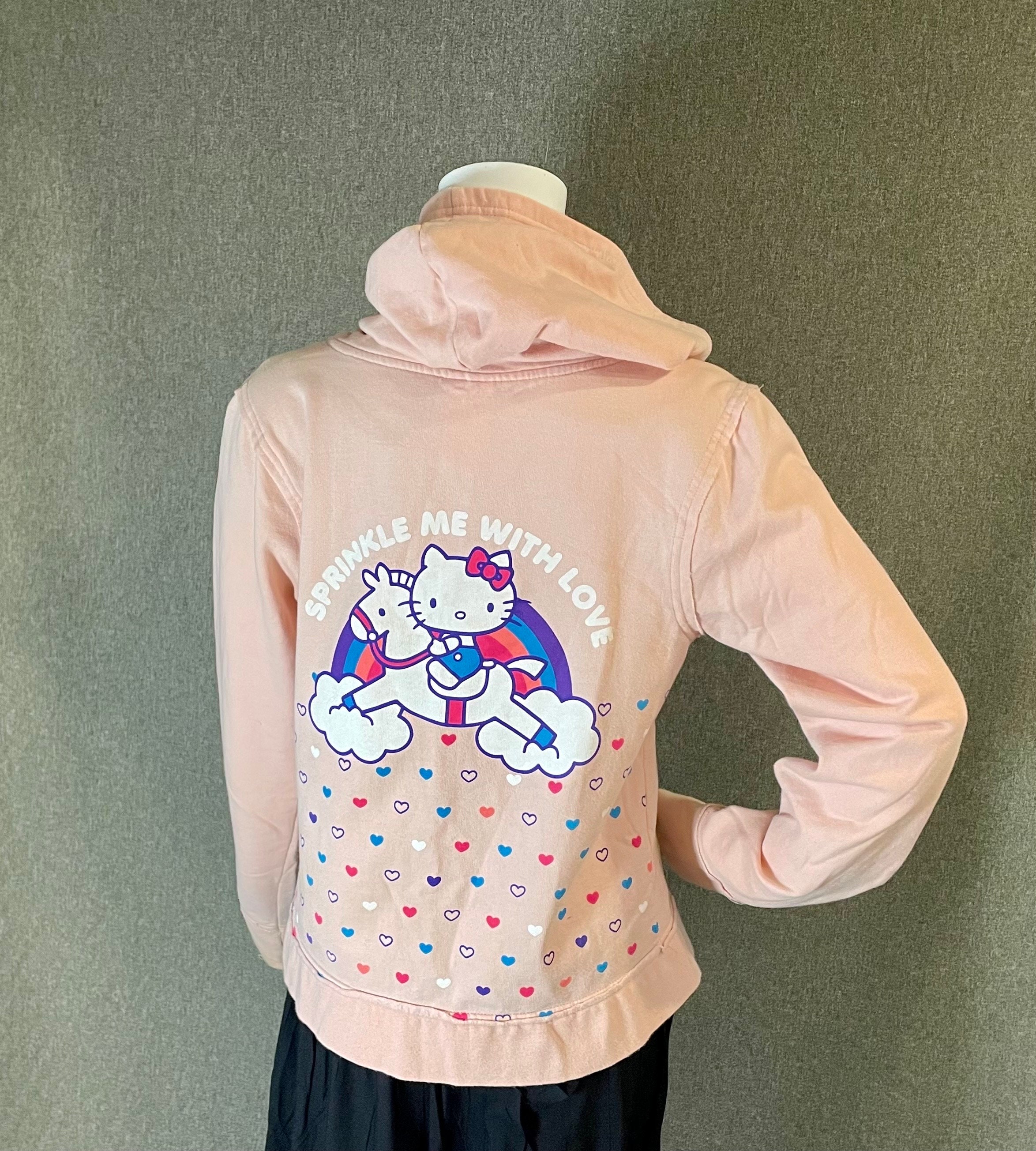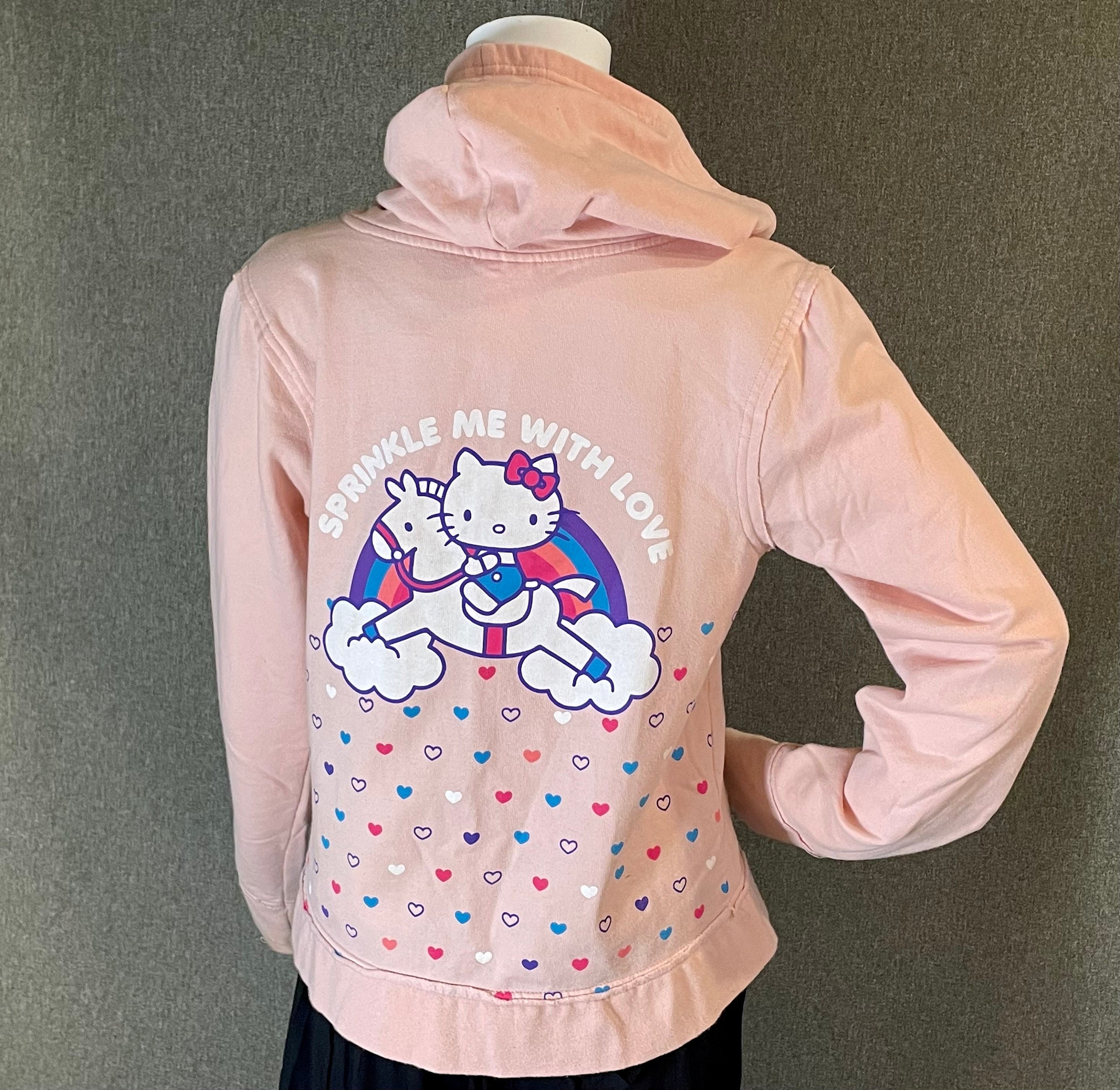 Very cute and rare officially licensed Hello Kitty women’s hooded zip-up sweatshirt with front and back printing.