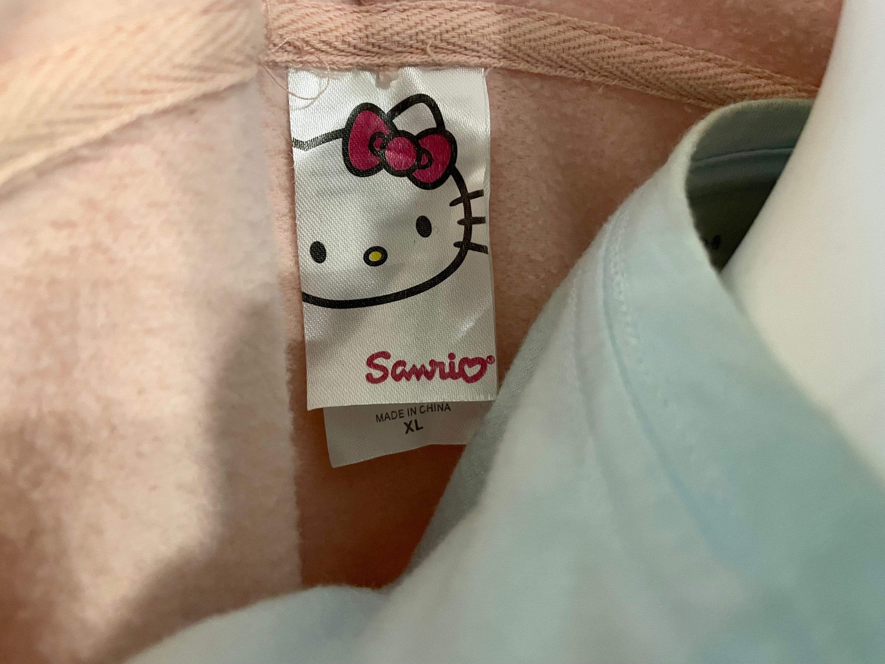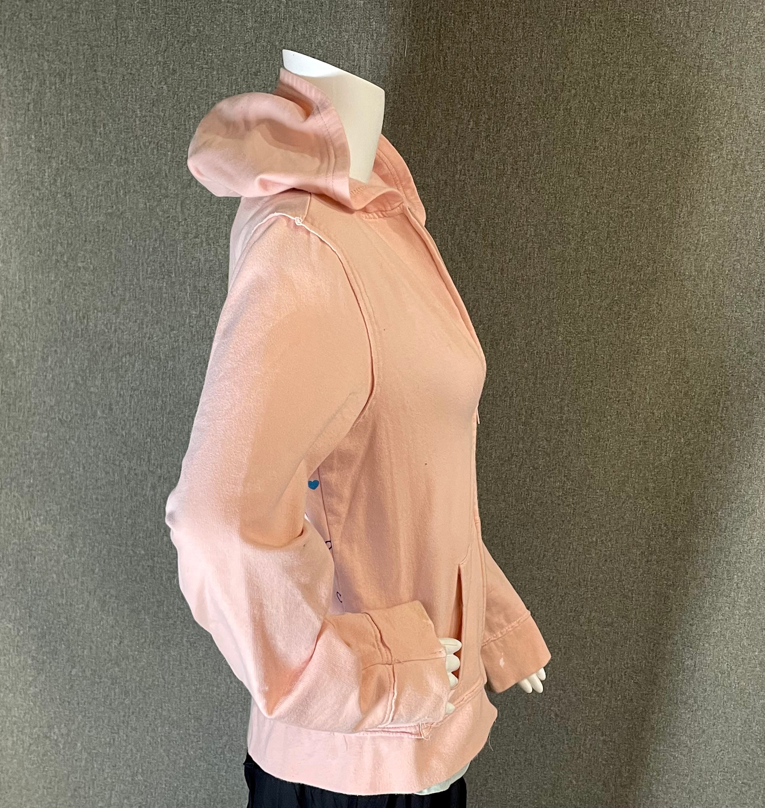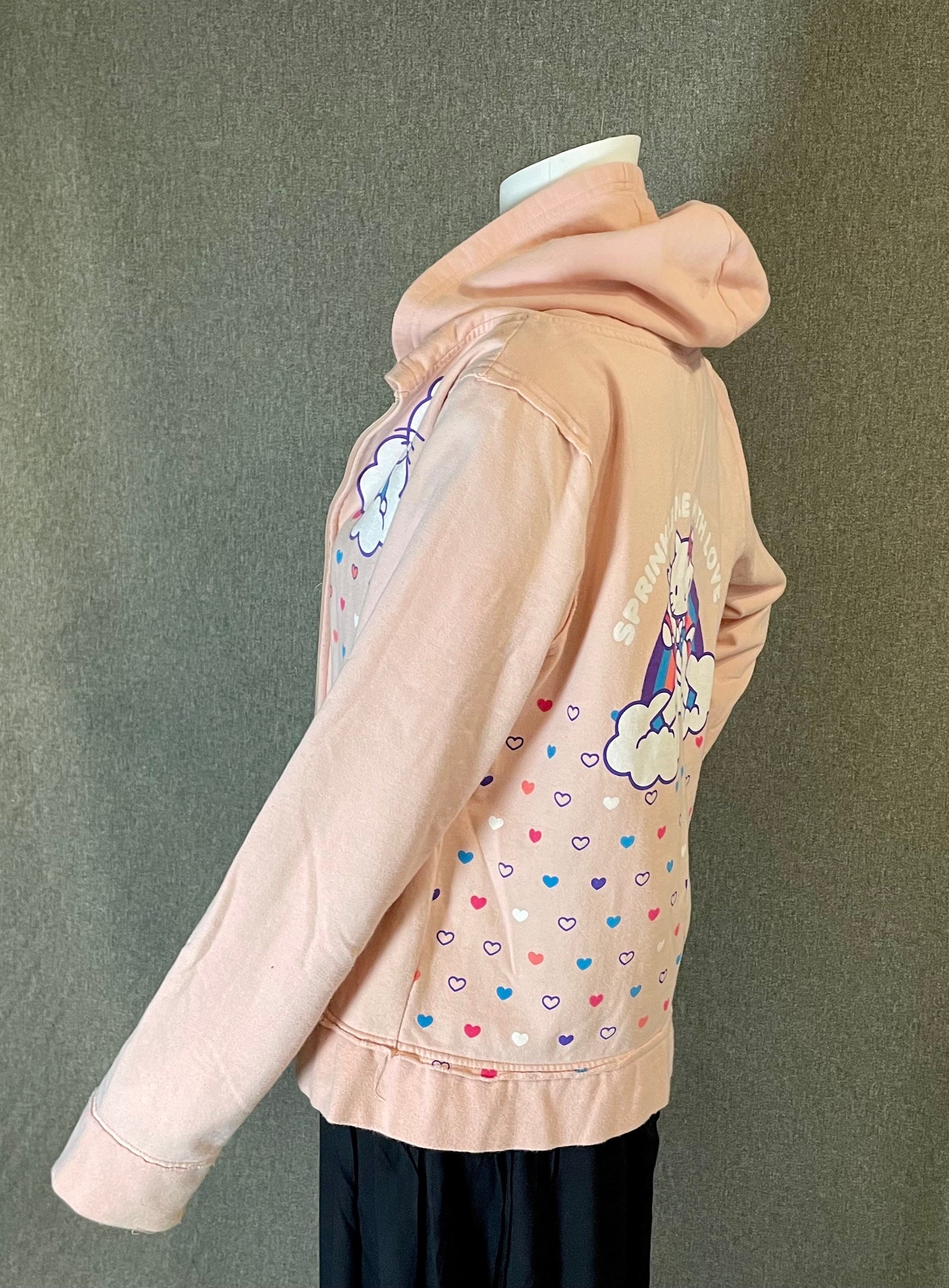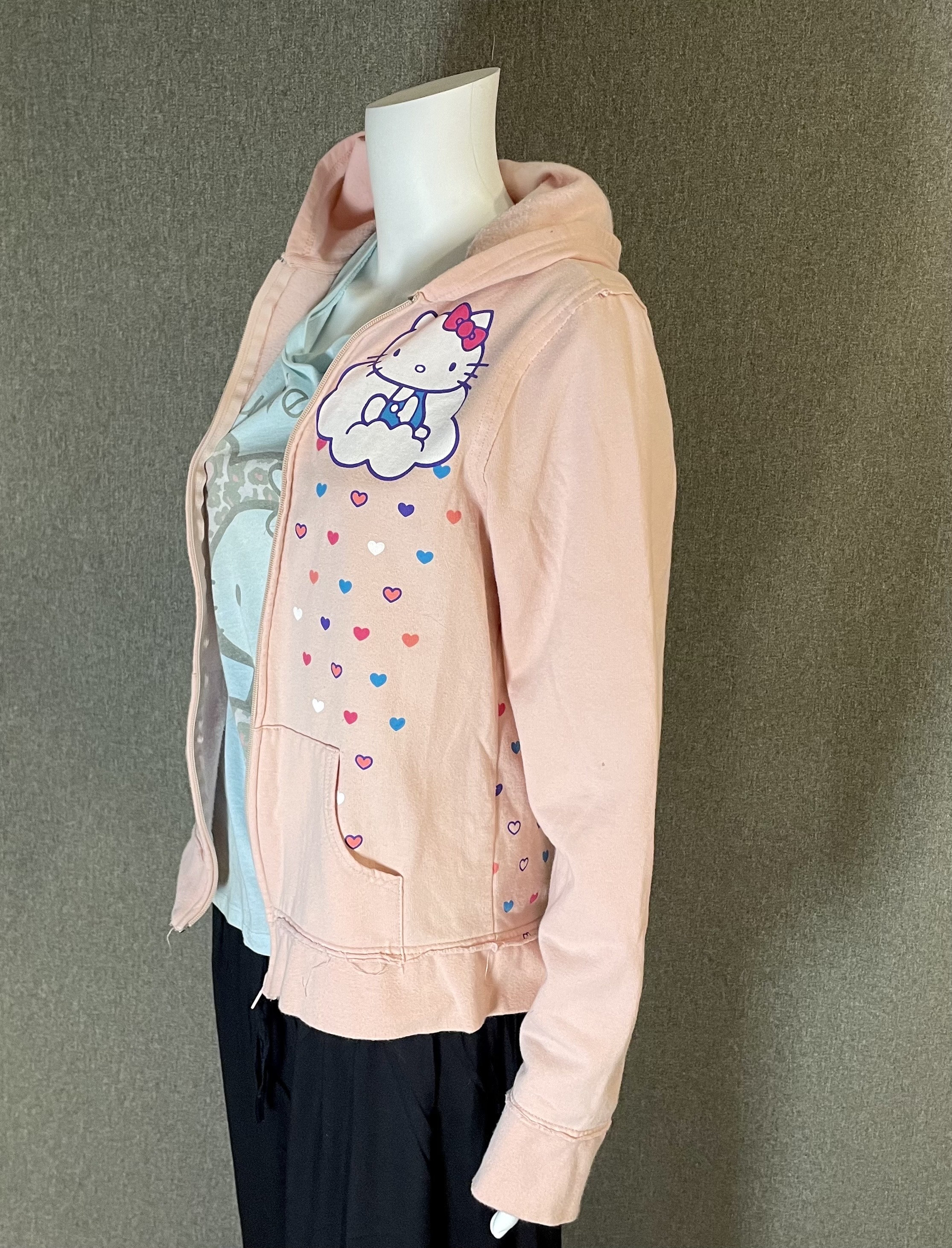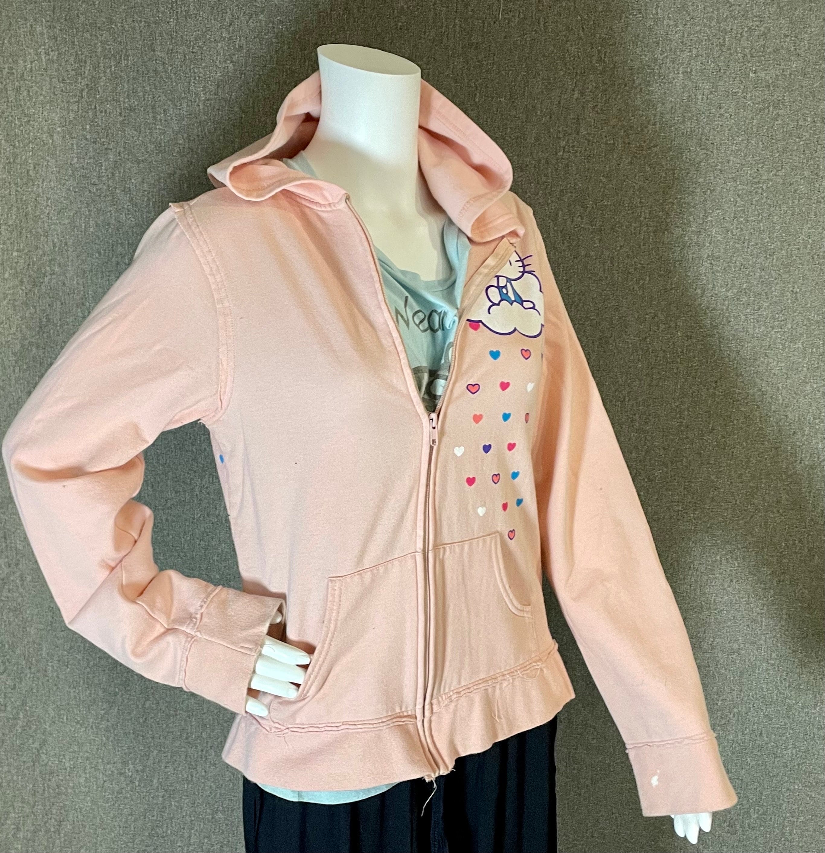 Very cute and rare officially licensed Hello Kitty women’s hooded zip-up sweatshirt with front and back printing.