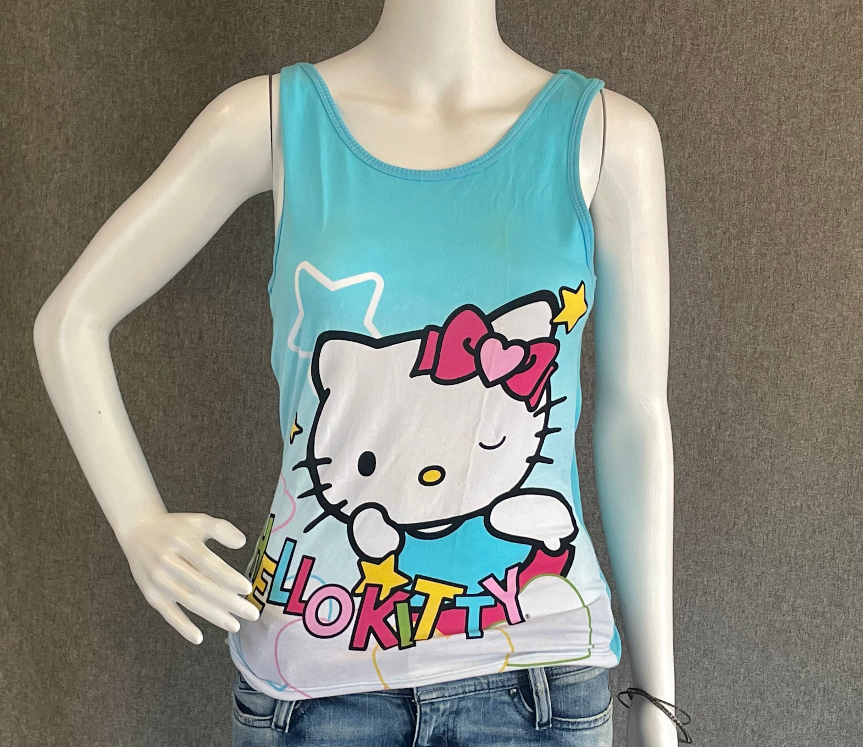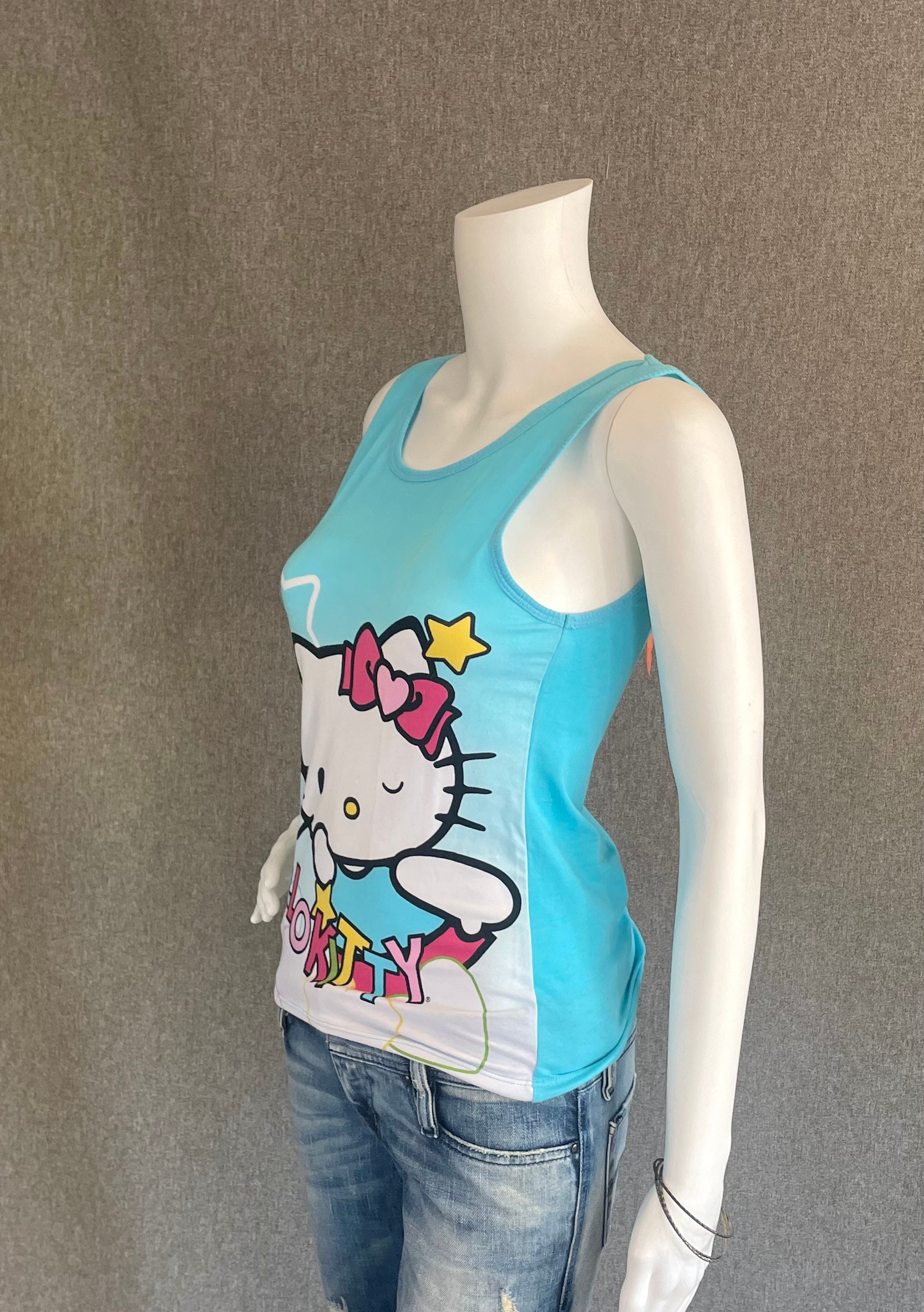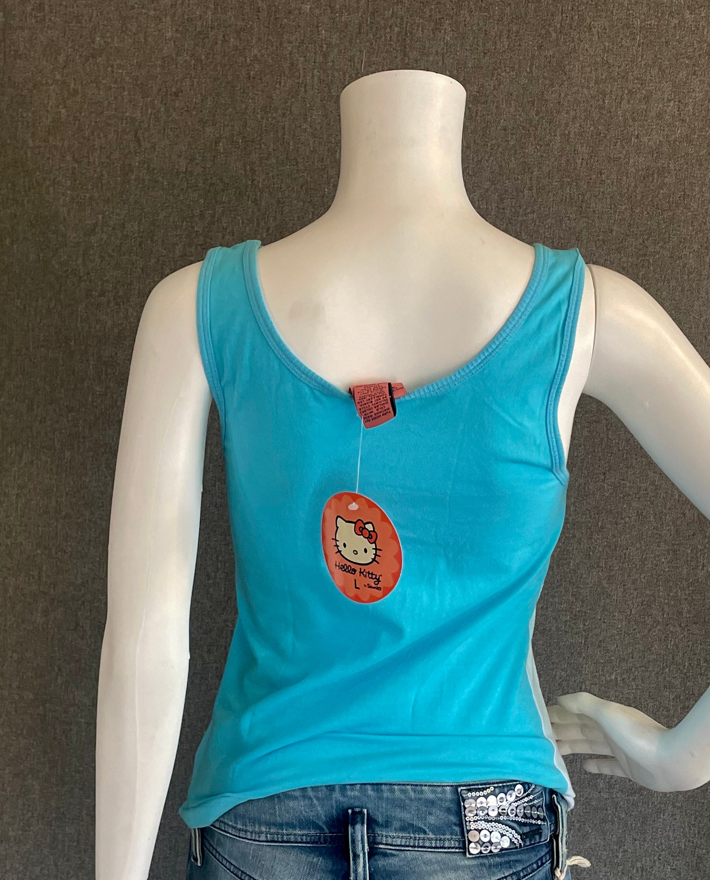 RARE Super Cute Hello Kitty Ladies Tank Top L* Blue with Flying Superhero Kitty Winking New With Tags NWT Officially Licensed. Shirt shows some discoloration on the front, see photos. *not US letter sizing