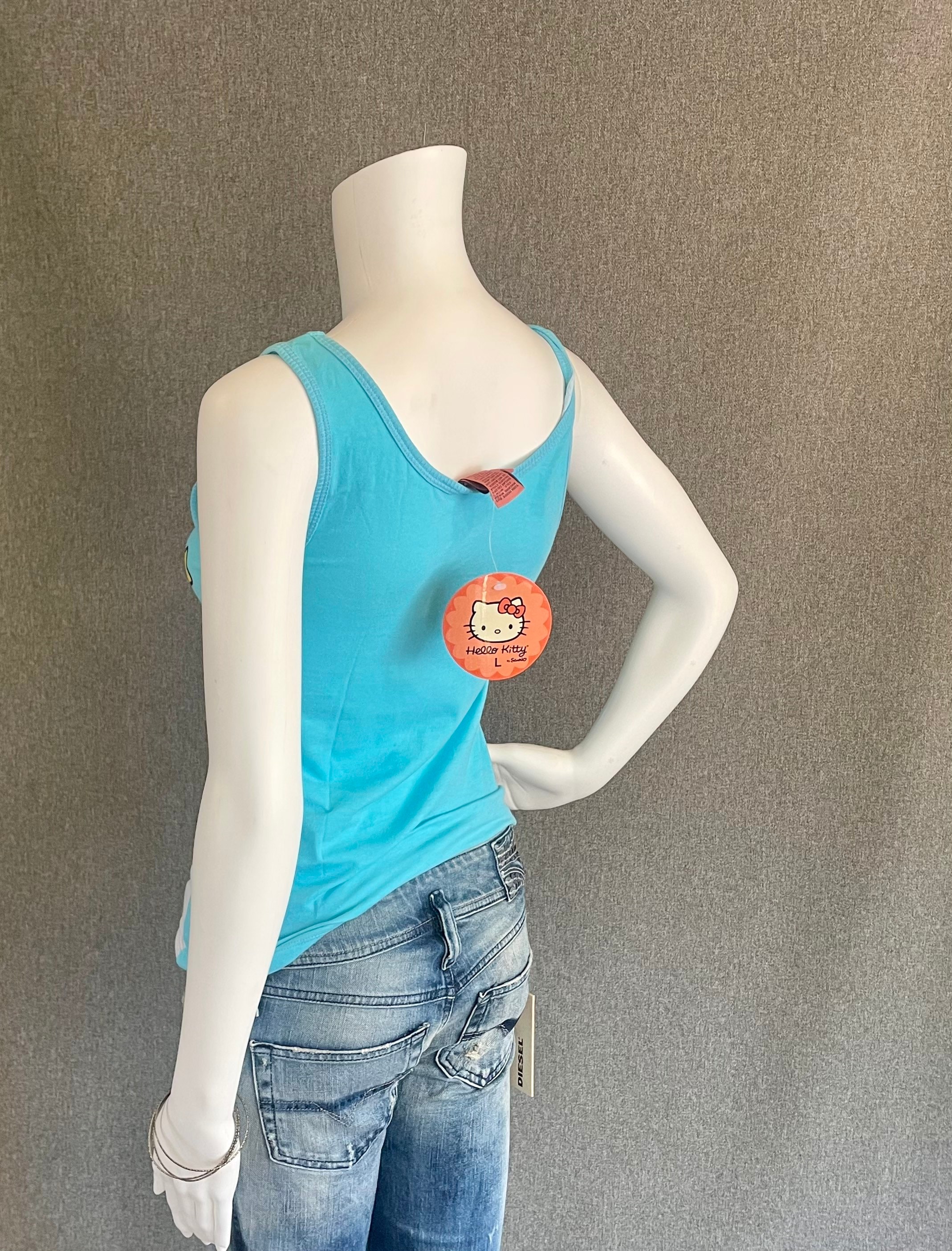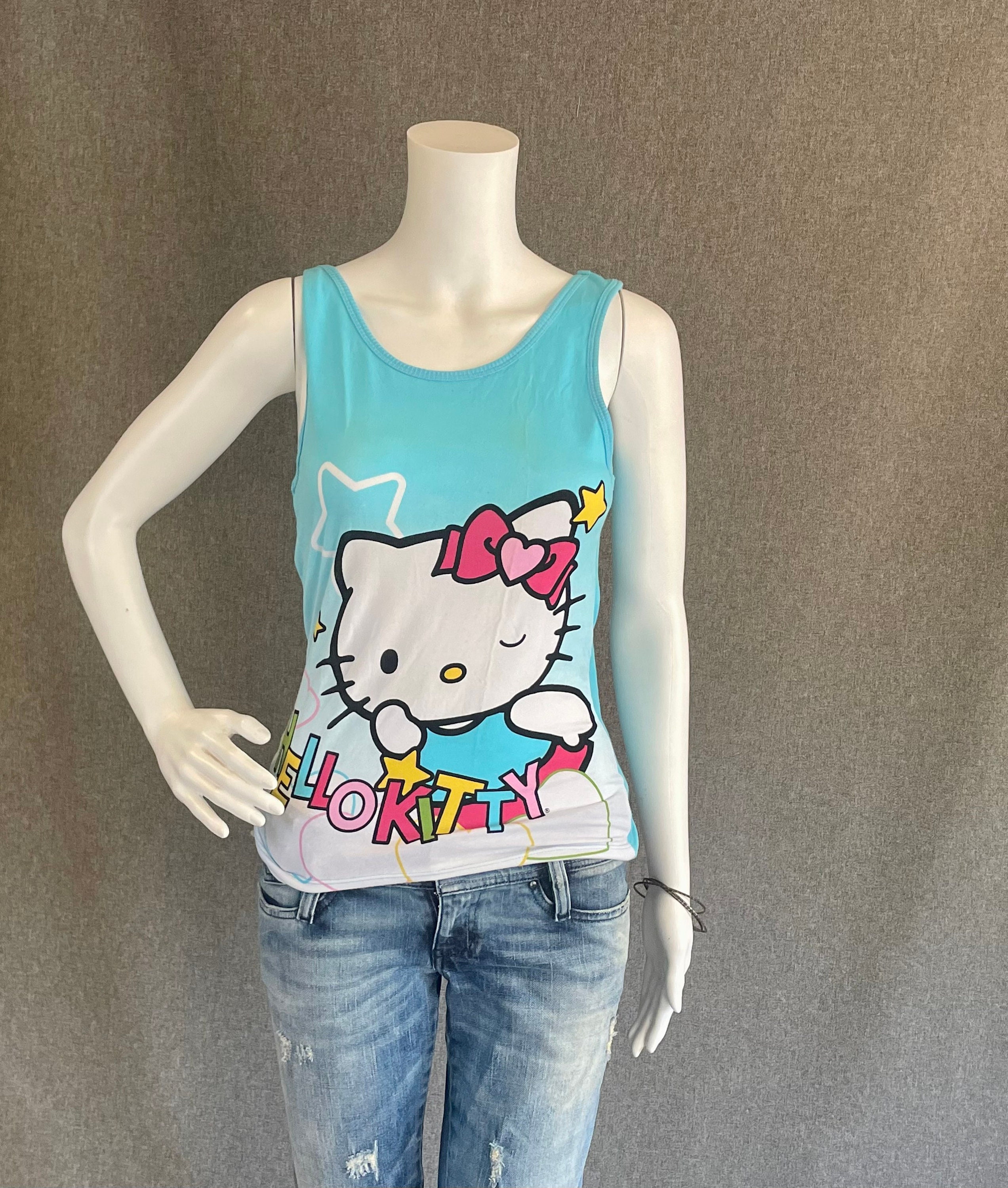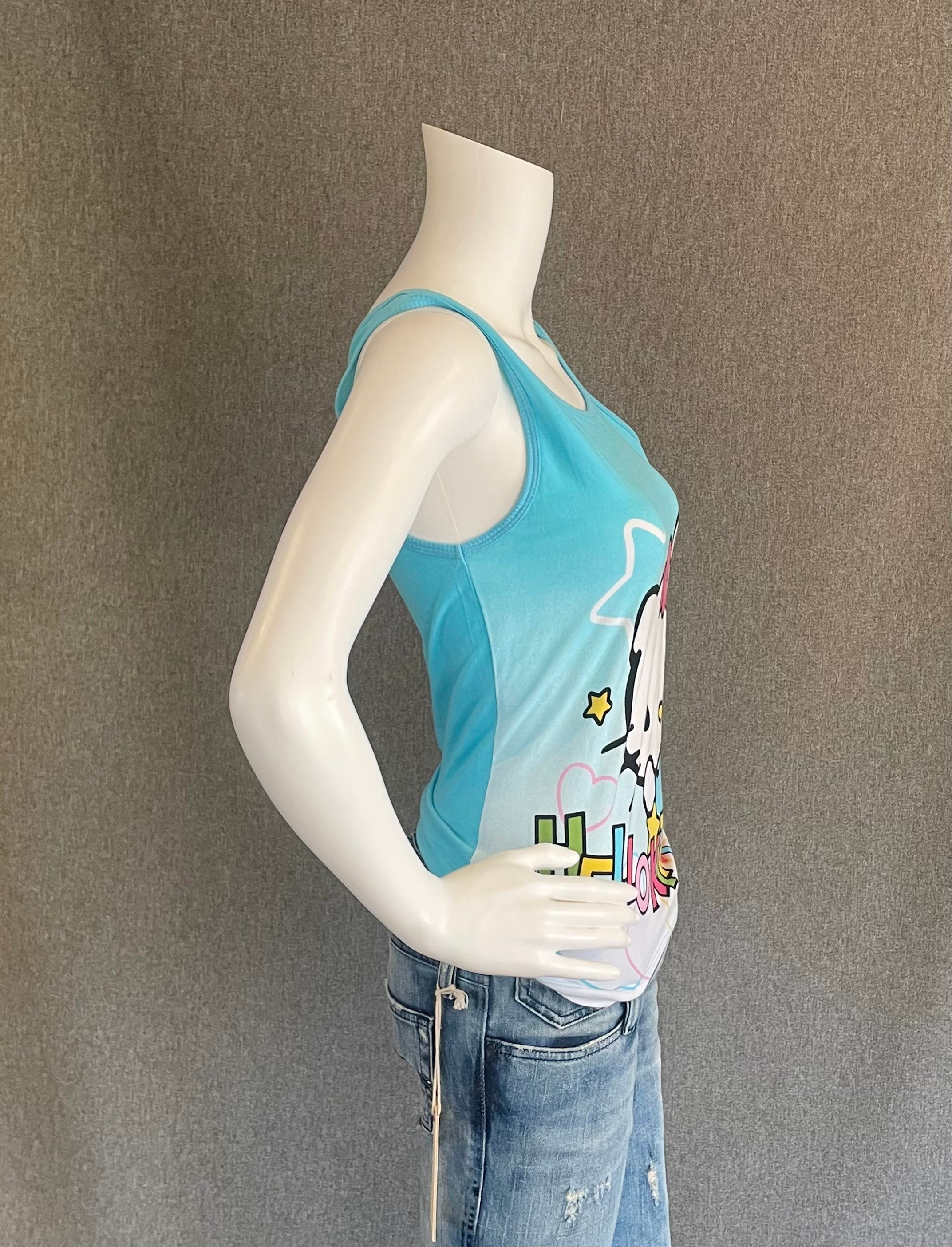 RARE Super Cute Hello Kitty Ladies Tank Top L* Blue with Flying Superhero Kitty Winking New With Tags NWT Officially Licensed. Shirt shows some discoloration on the front, see photos. *not US letter sizing