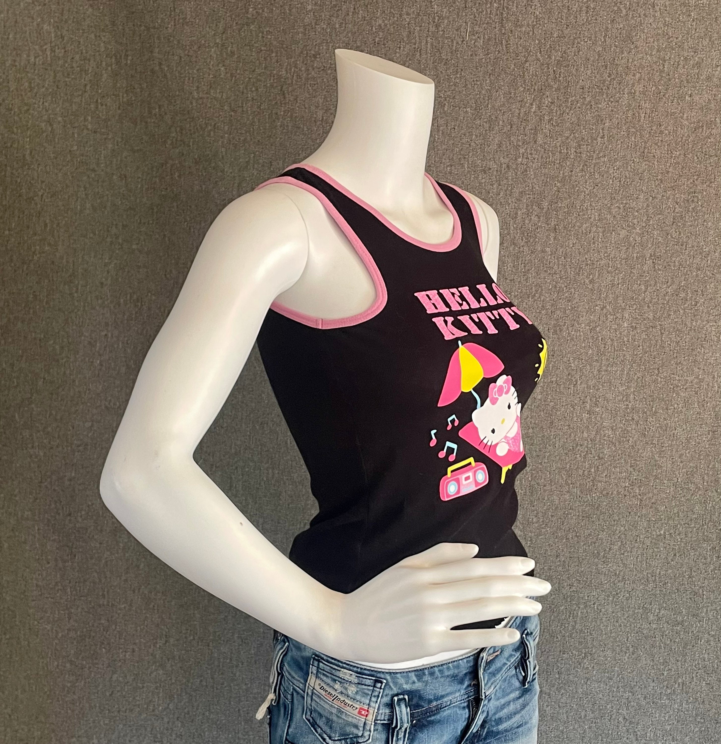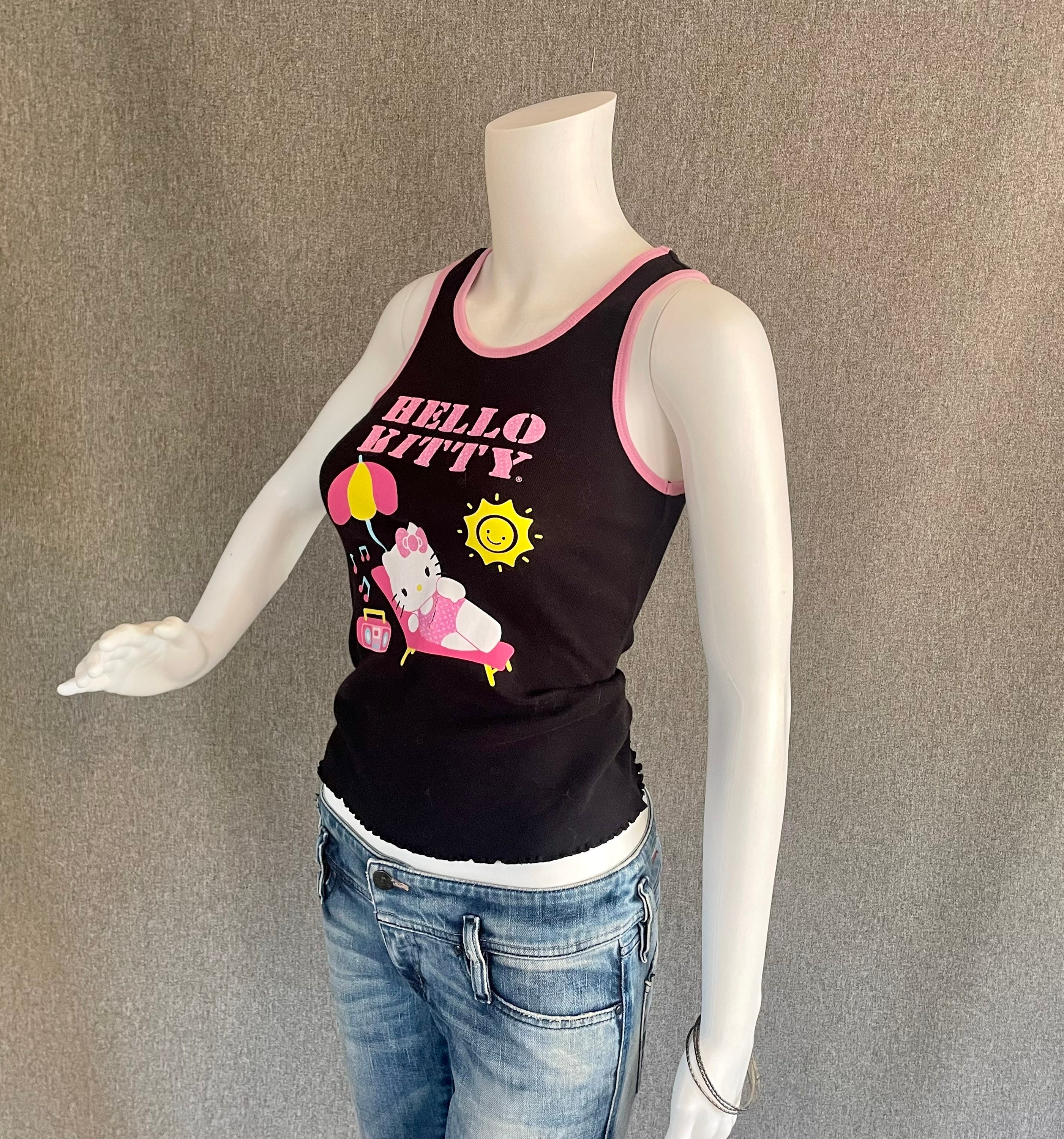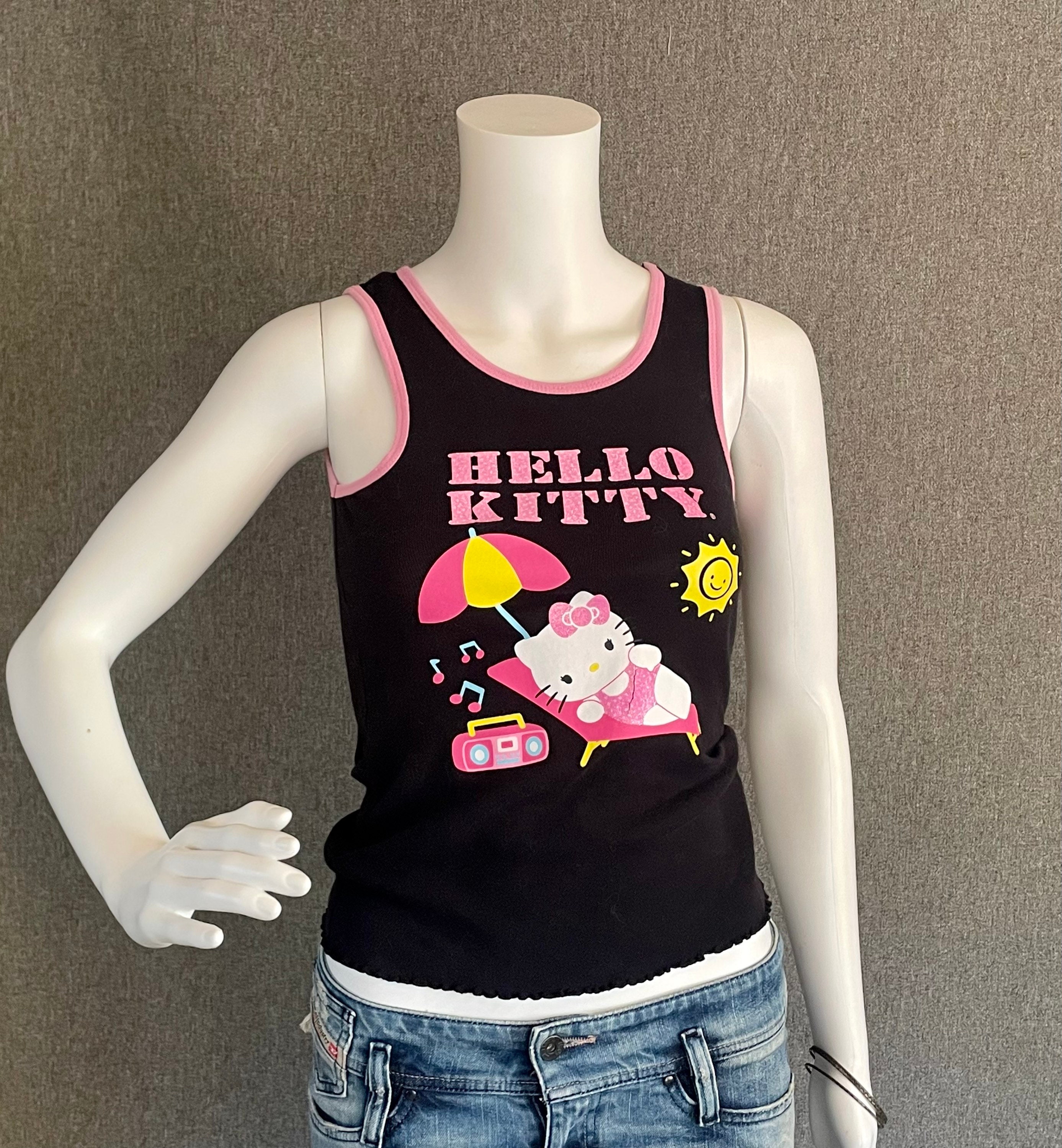 RARE Super Cute Hello Kitty Ladies Tank Top L* black featuring Hello Kitty hanging out at the beach under an umbrella listening to some music. Letters and HK’s bathing suit are sparkly pink. Shirt shows some signs of wear, slight discoloration on the neck and a crack in the graphic, on her bathing suit.