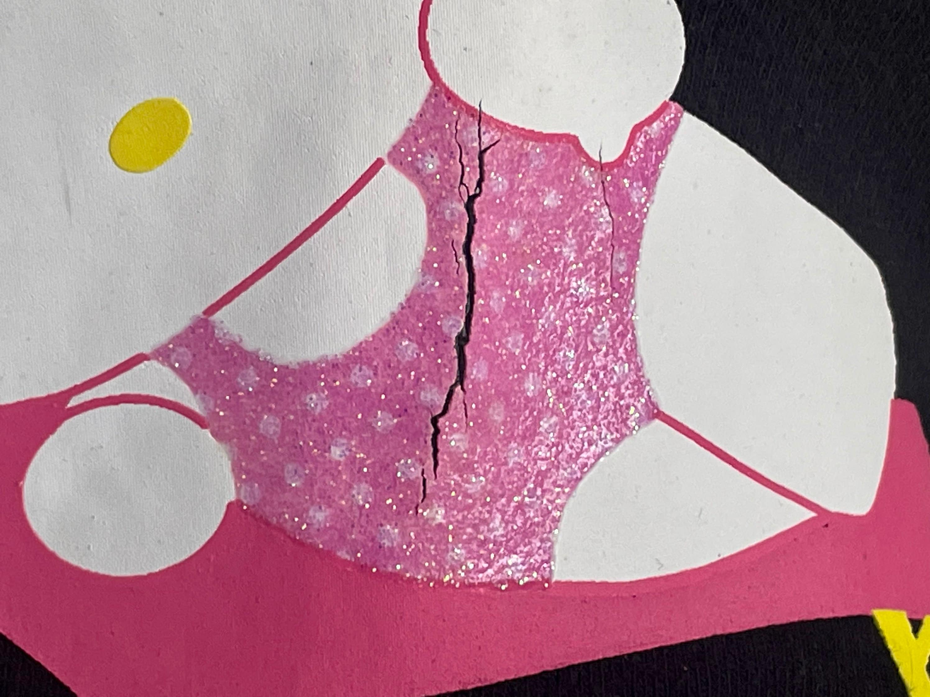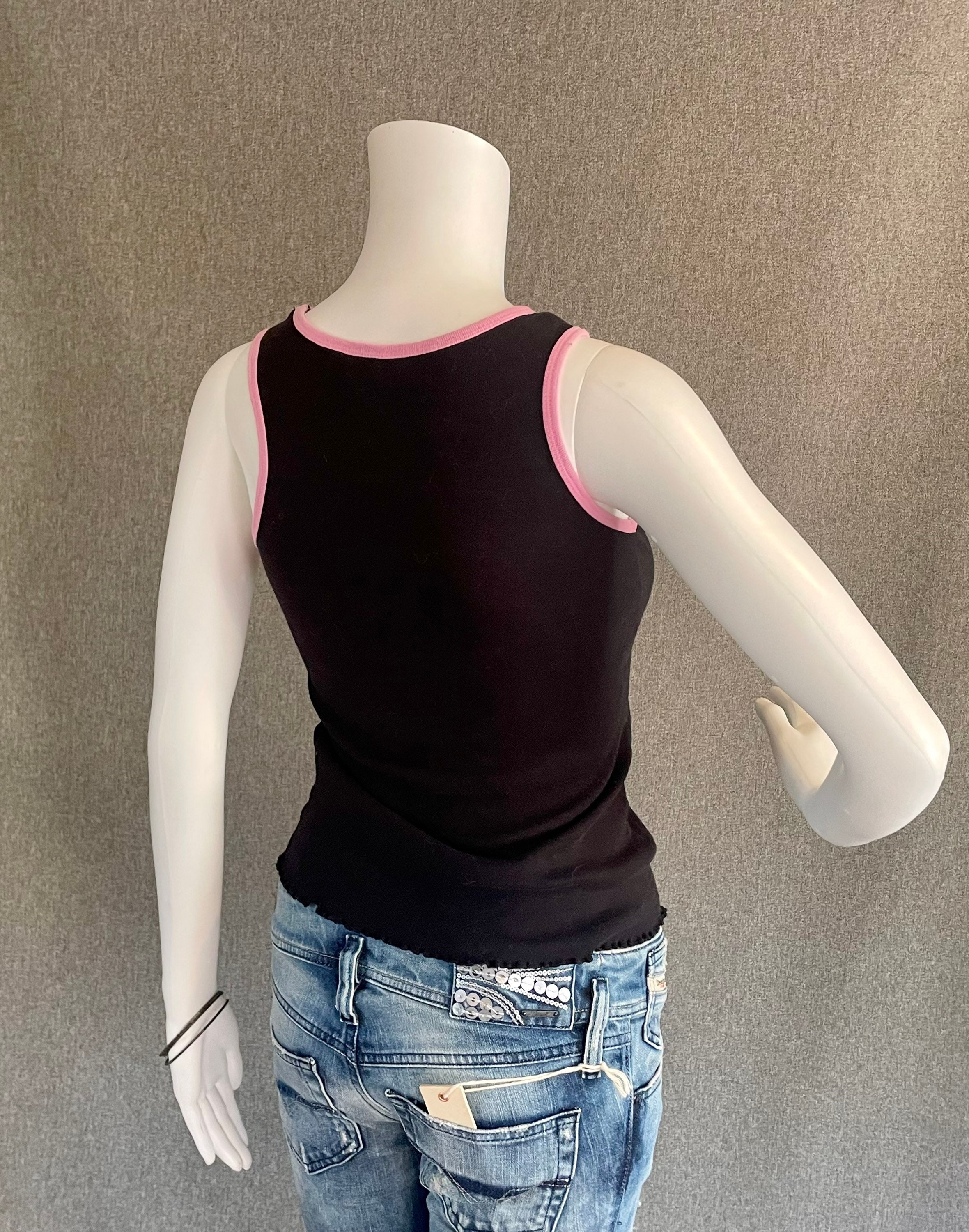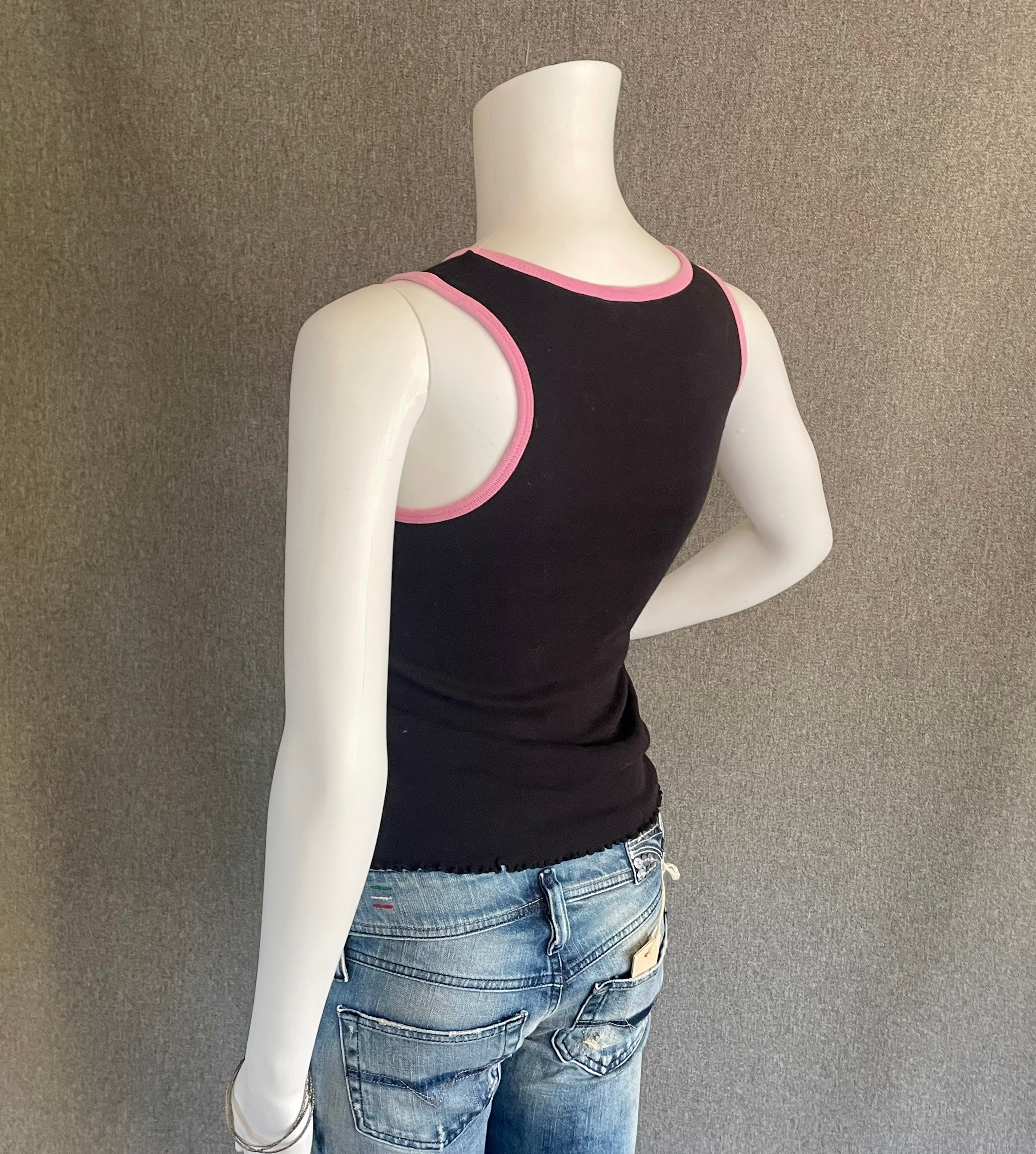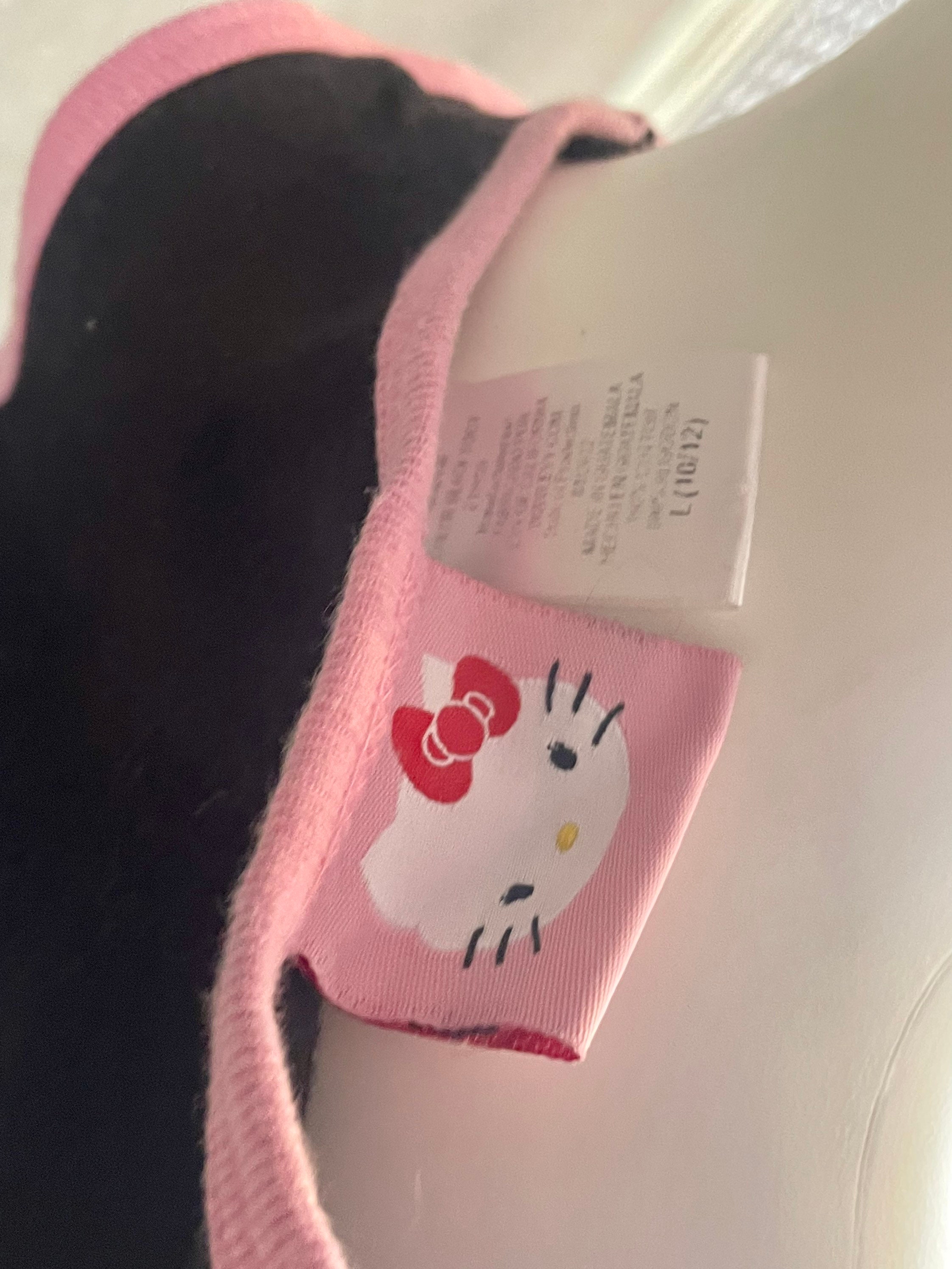 RARE Super Cute Hello Kitty Ladies Tank Top L* black featuring Hello Kitty hanging out at the beach under an umbrella listening to some music. Letters and HK’s bathing suit are sparkly pink. Shirt shows some signs of wear, slight discoloration on the neck and a crack in the graphic, on her bathing suit.