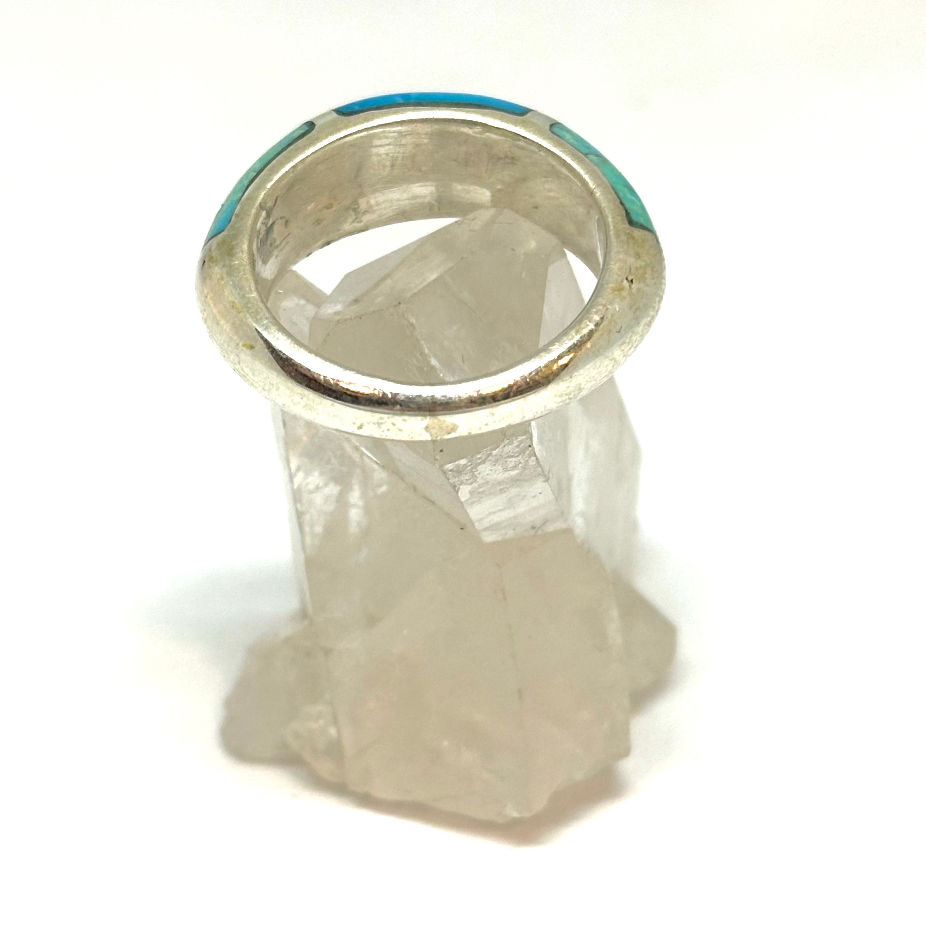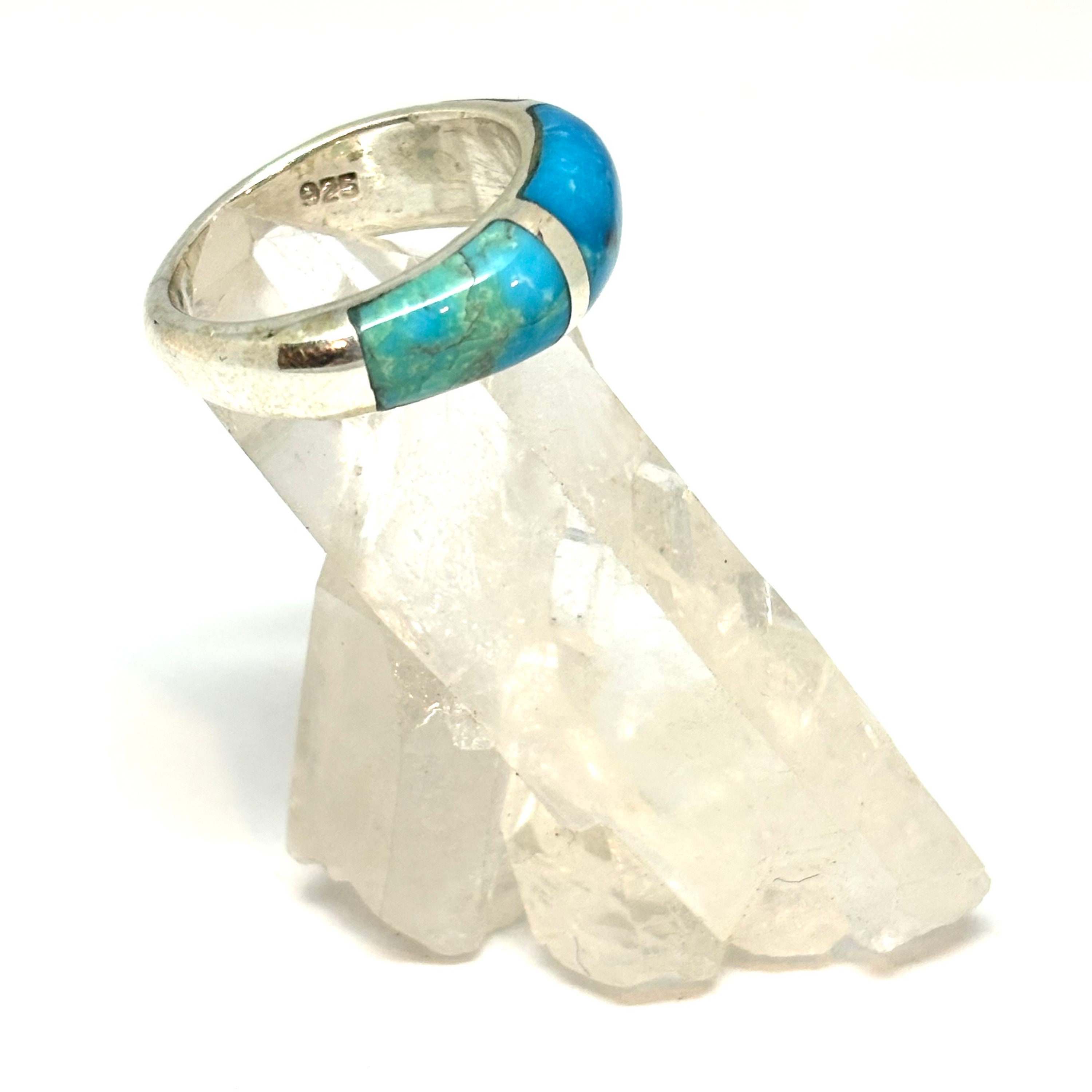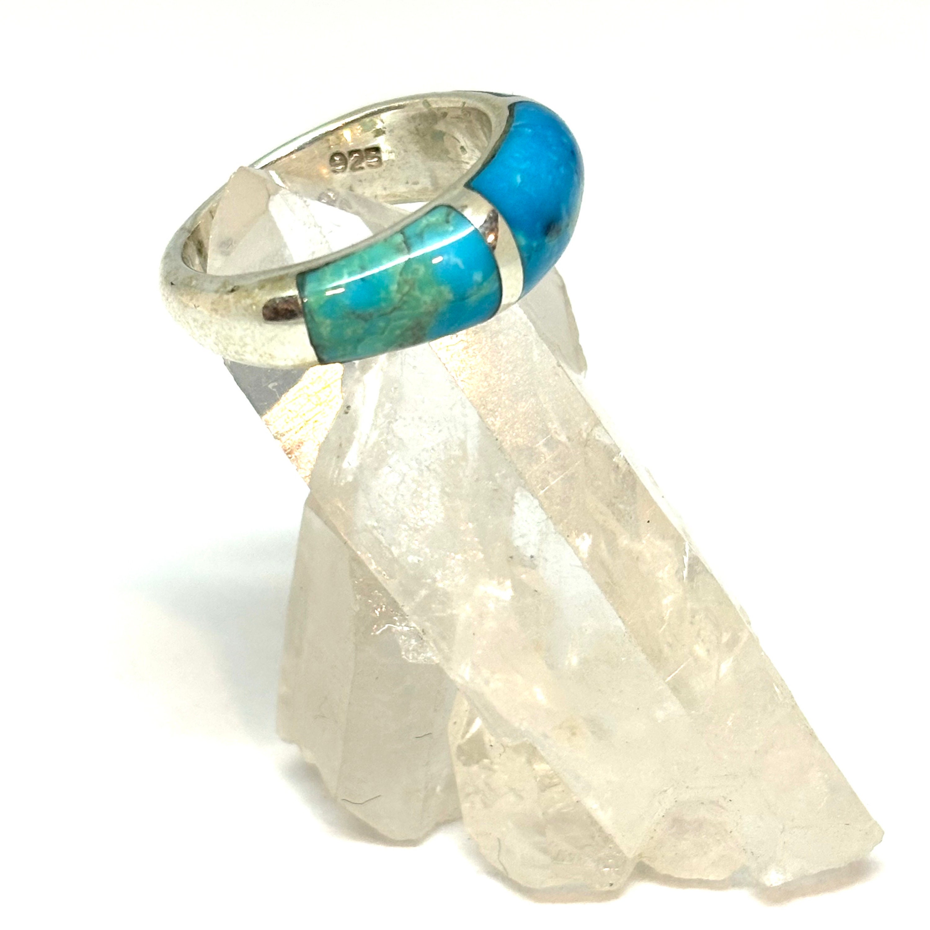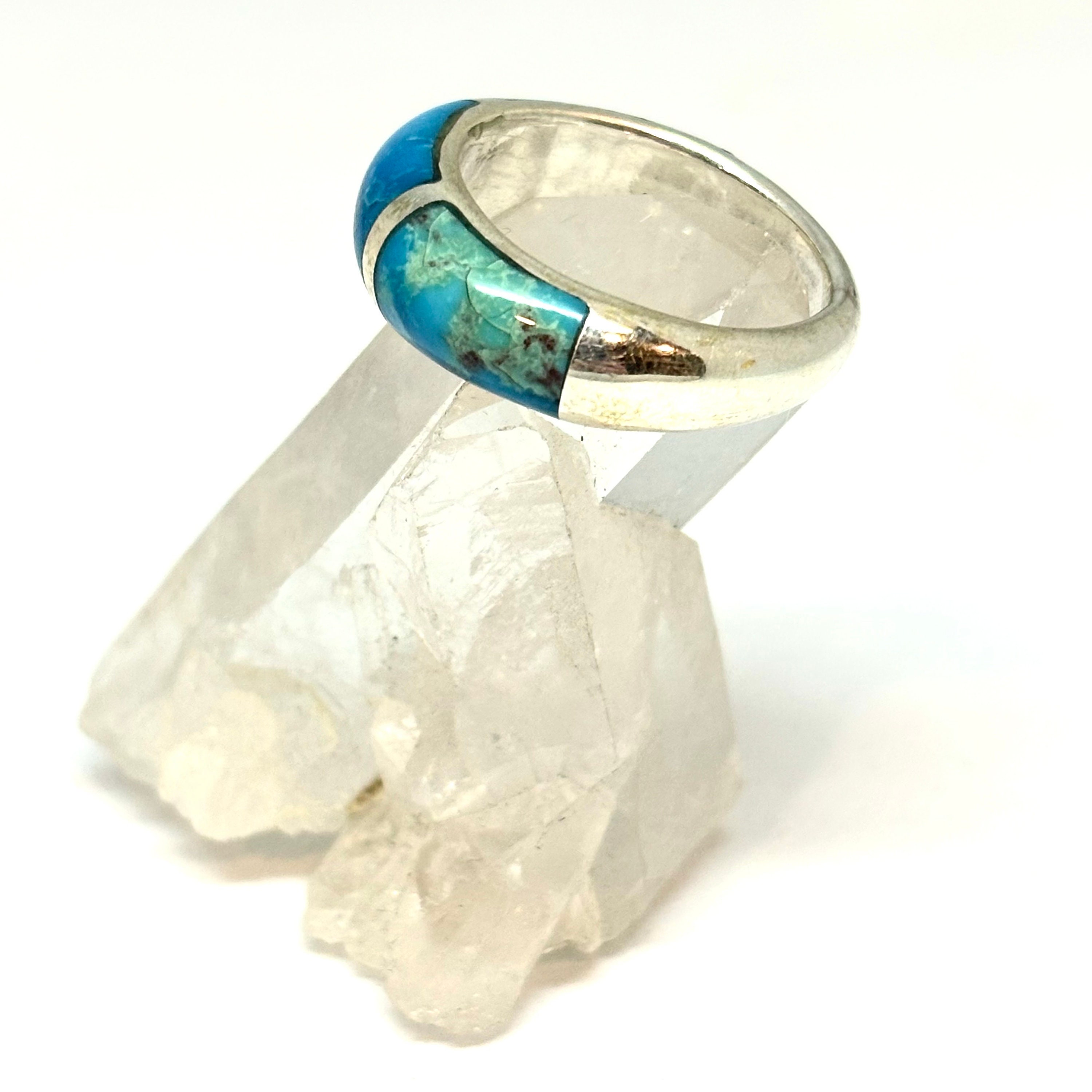 This is a one of a kind handmade sterling silver ring inwayed with 3 pieces of custom cut genuine turquoise.