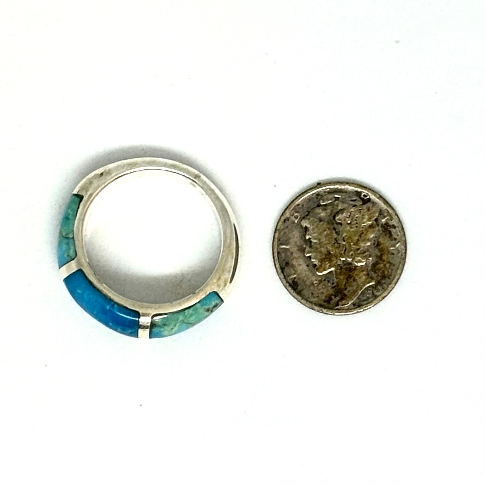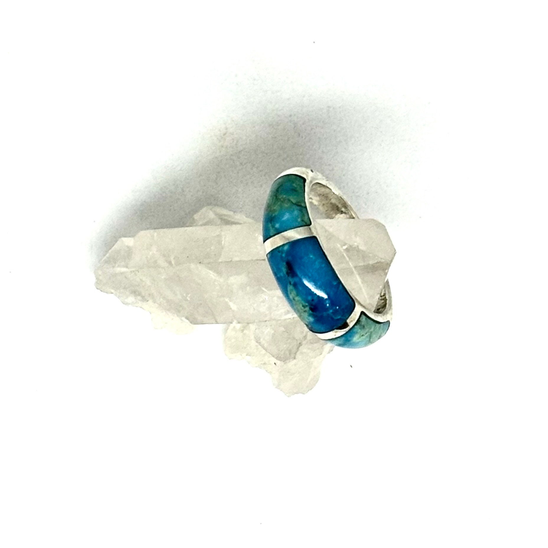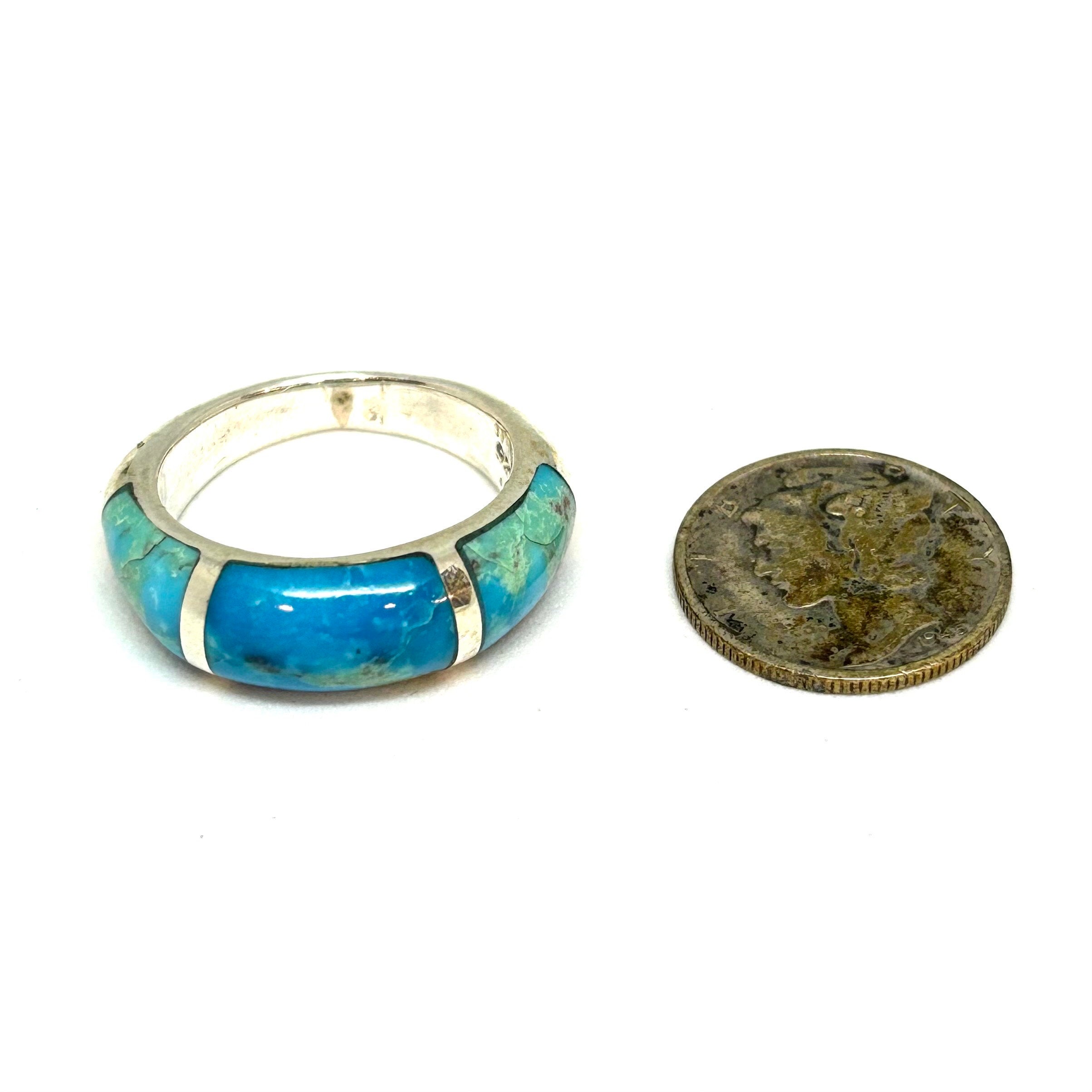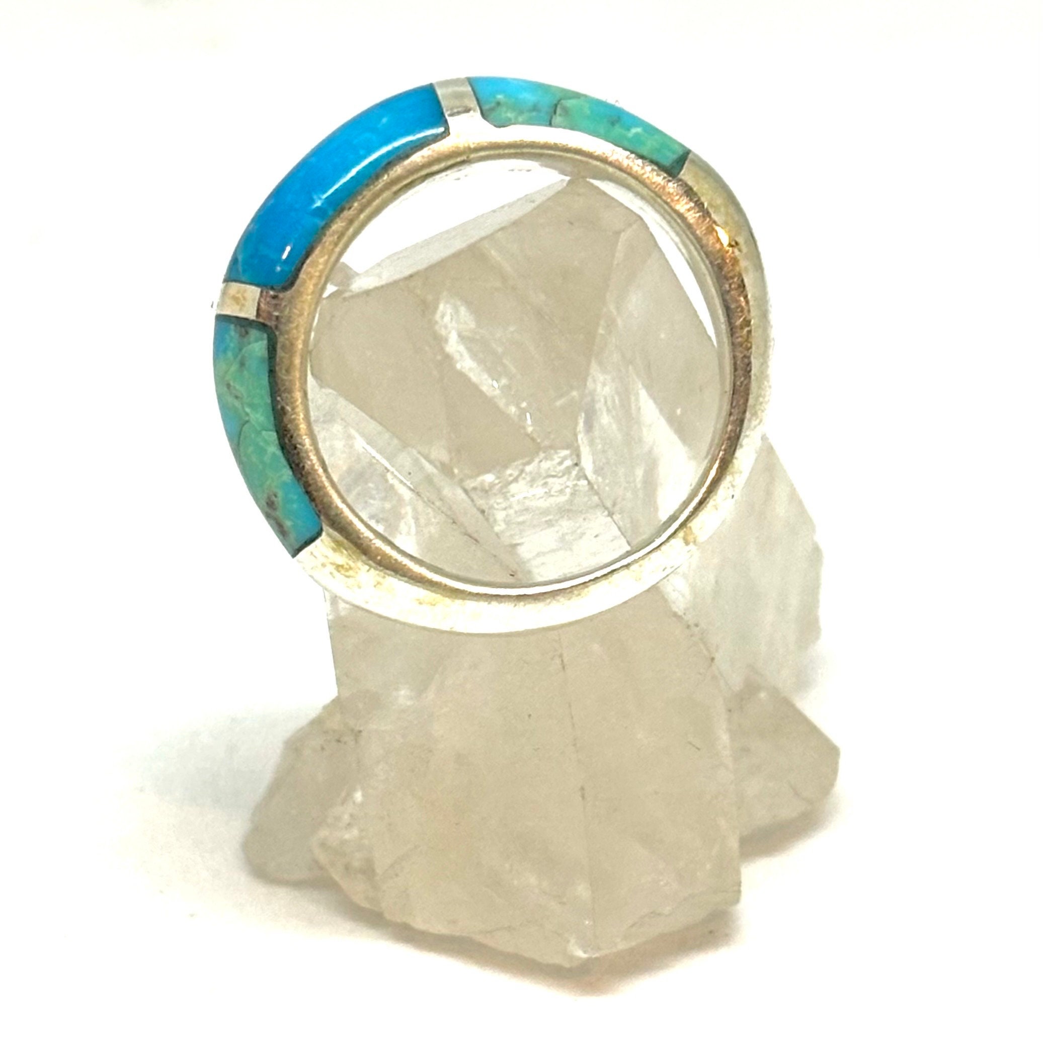 This is a one of a kind handmade sterling silver ring inwayed with 3 pieces of custom cut genuine turquoise.