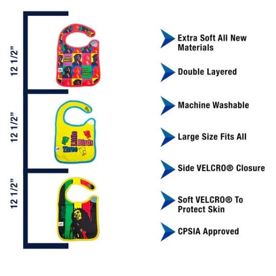 "Bring home one of the worlds most beloved reggae artists and an icon for multiple generations with the Bob Marley 3 pack bibs. Featuring three iconic designs including “Three Little Birds”, “One Love” and “Lively Up Yourself”, these soft cotton bibs protect your little buffalo soldiers from messy food and drinks with one of the soft cotton bibs.