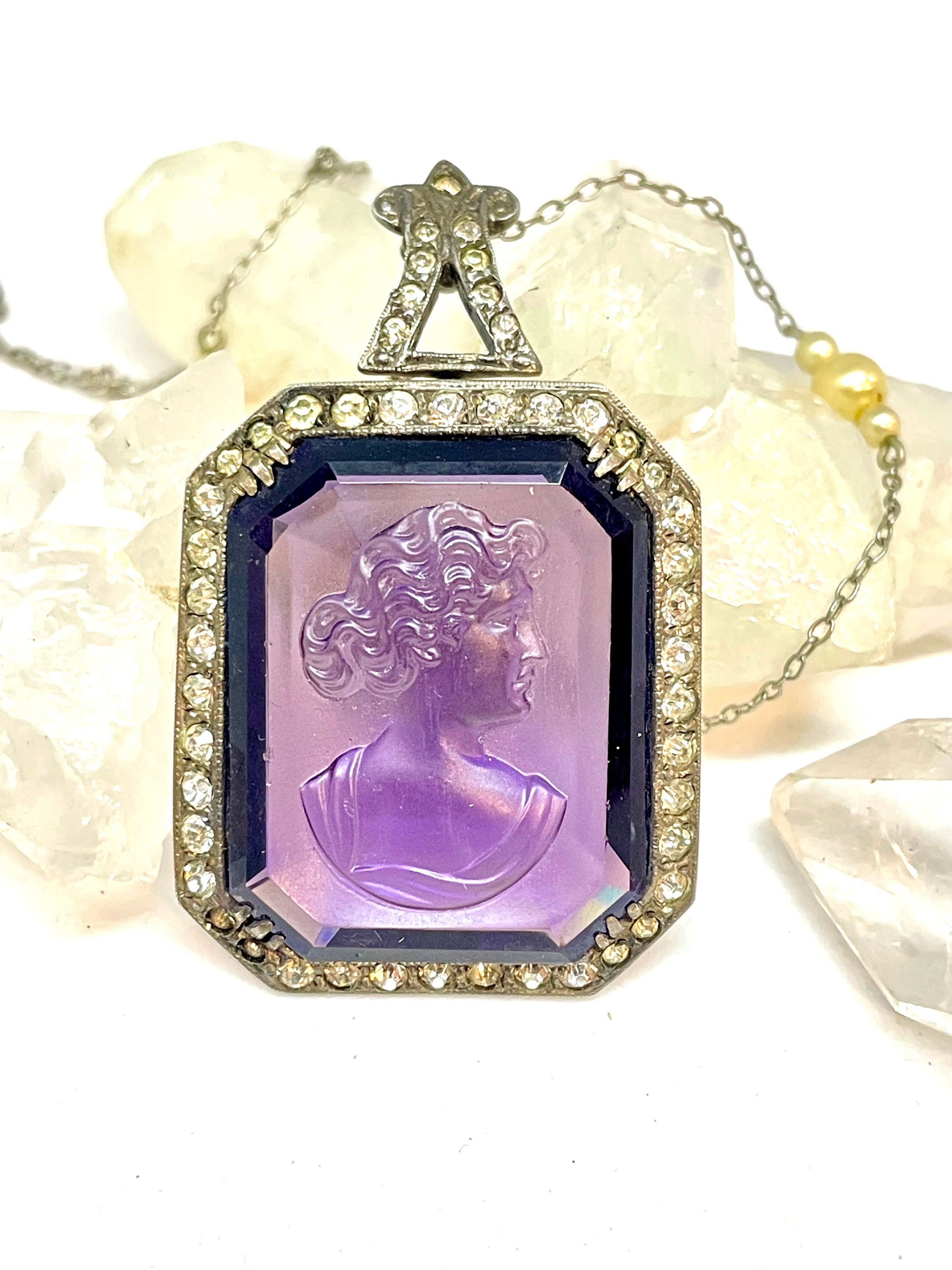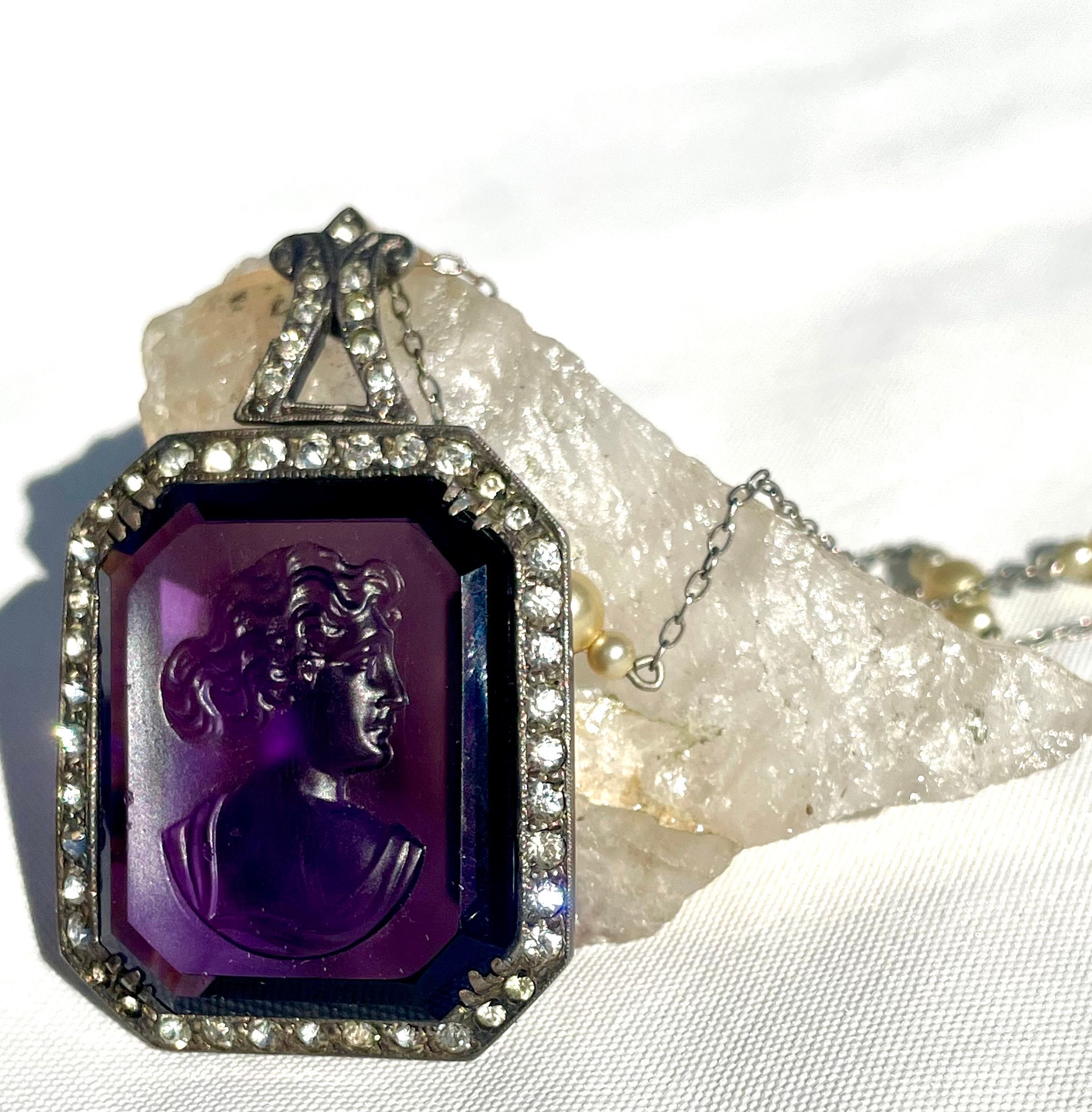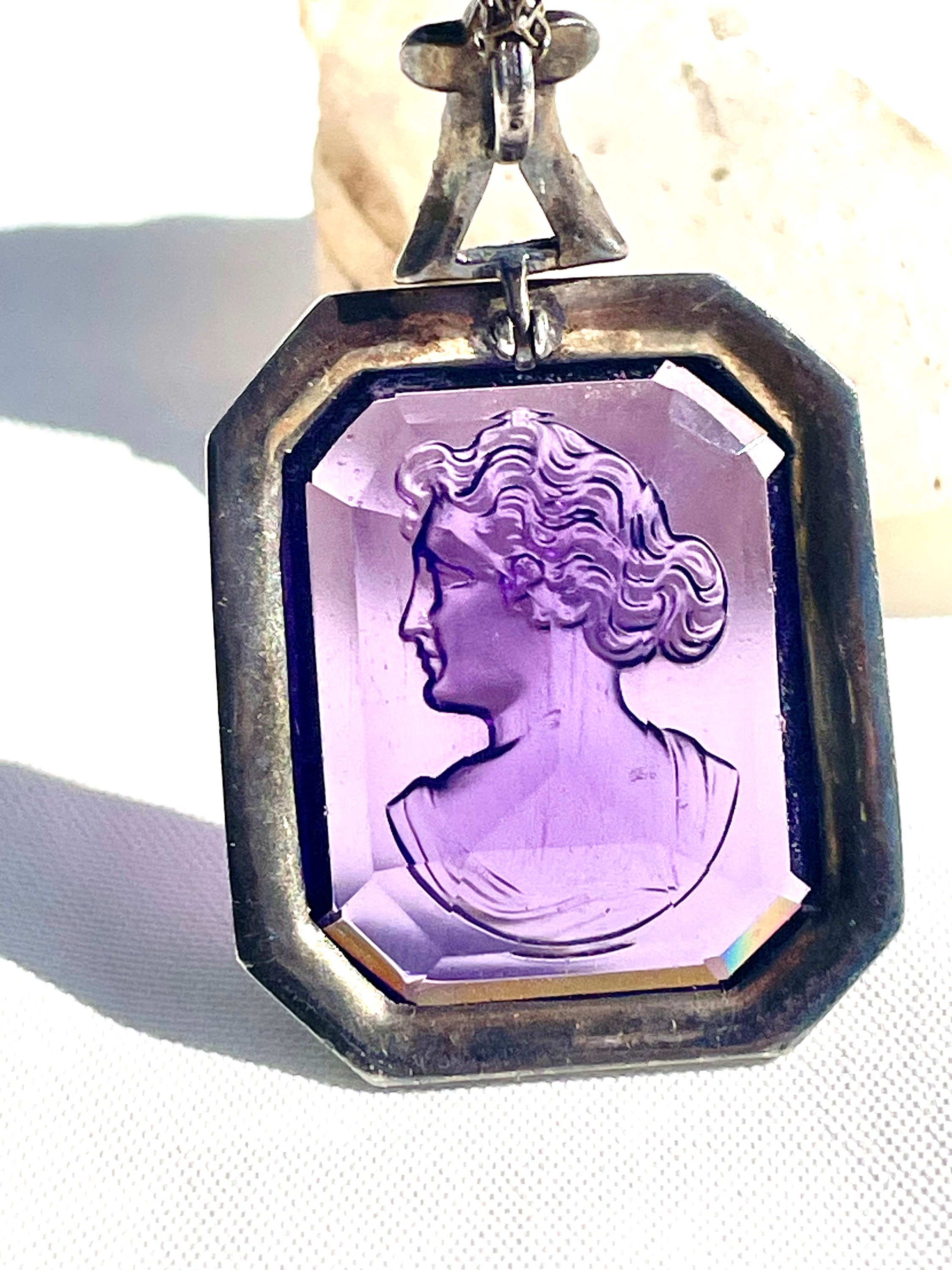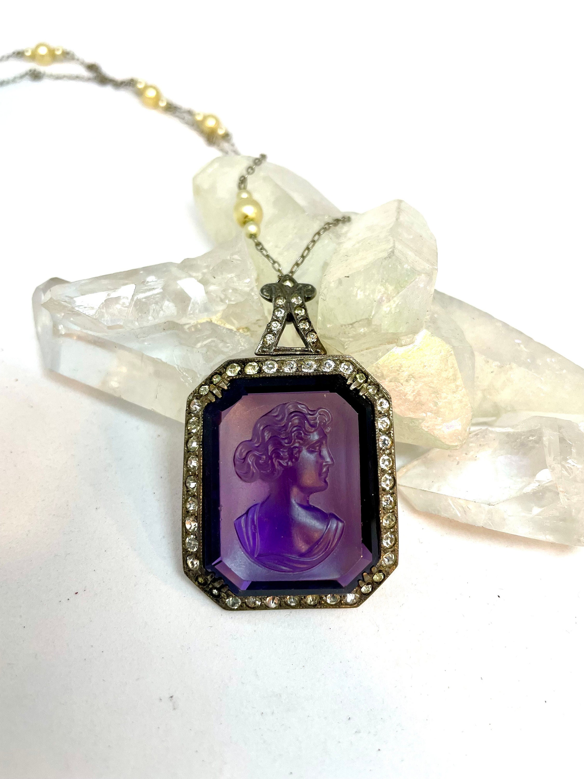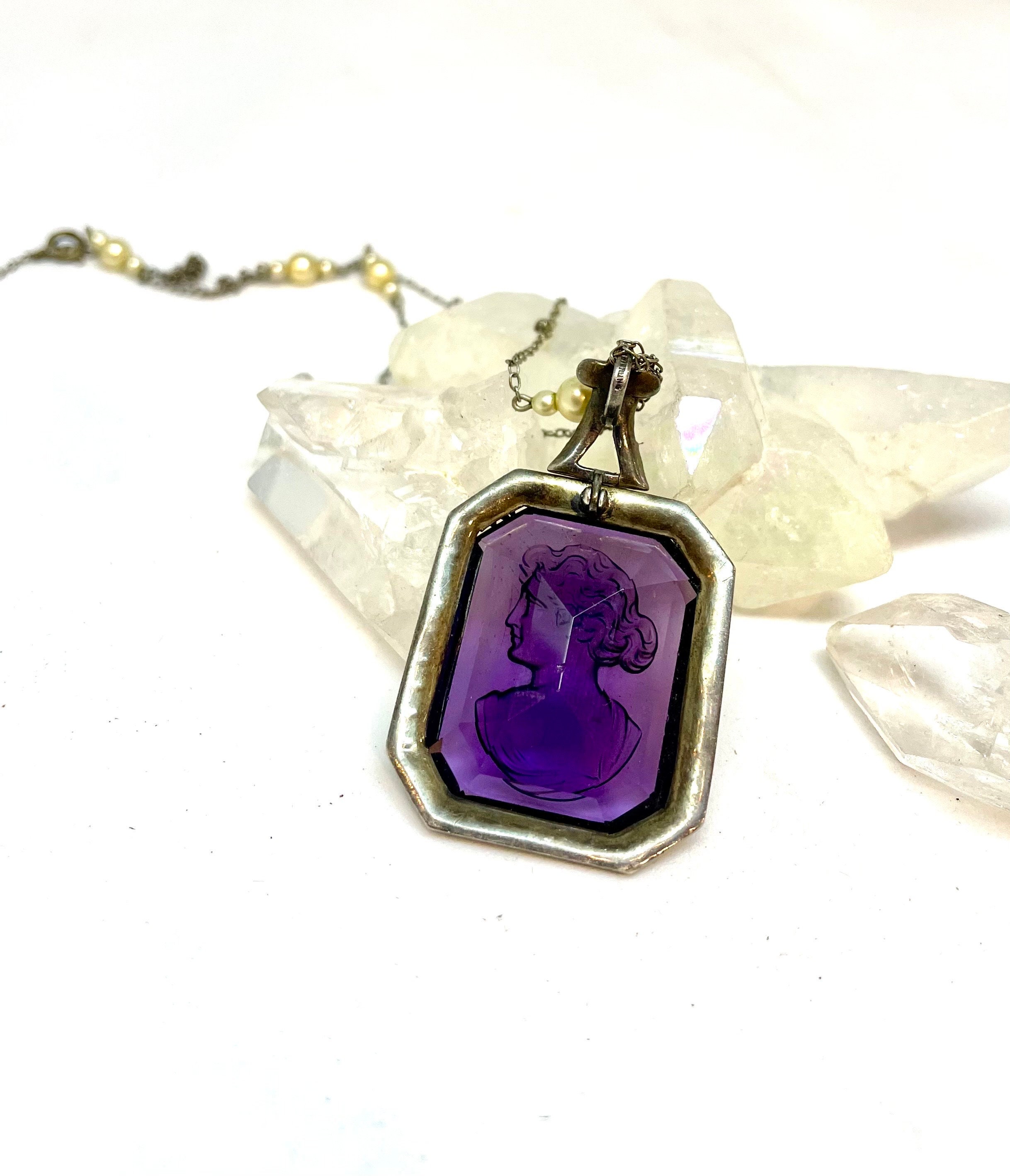 Cameos can be found with relative ease at estate sales and antique shops, but you’d be hard pressed to find one like this. This is a truly unique piece. An intricately carved piece of synthetic amethyst, framed by a sterling silver bezel with cubic zirconium, on a delicate chain, adorned with gorgeous natural pearls.