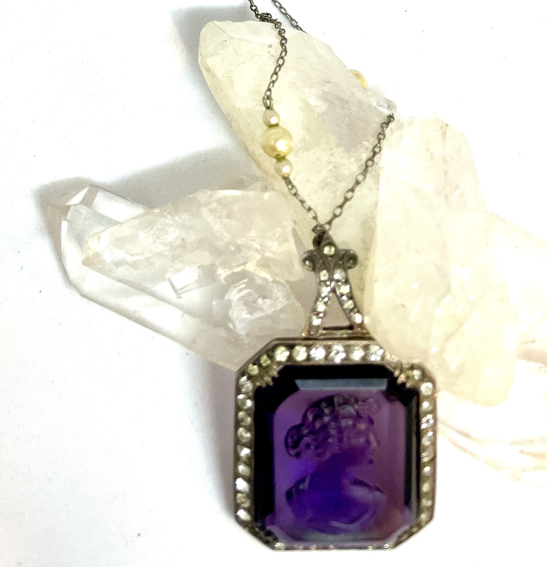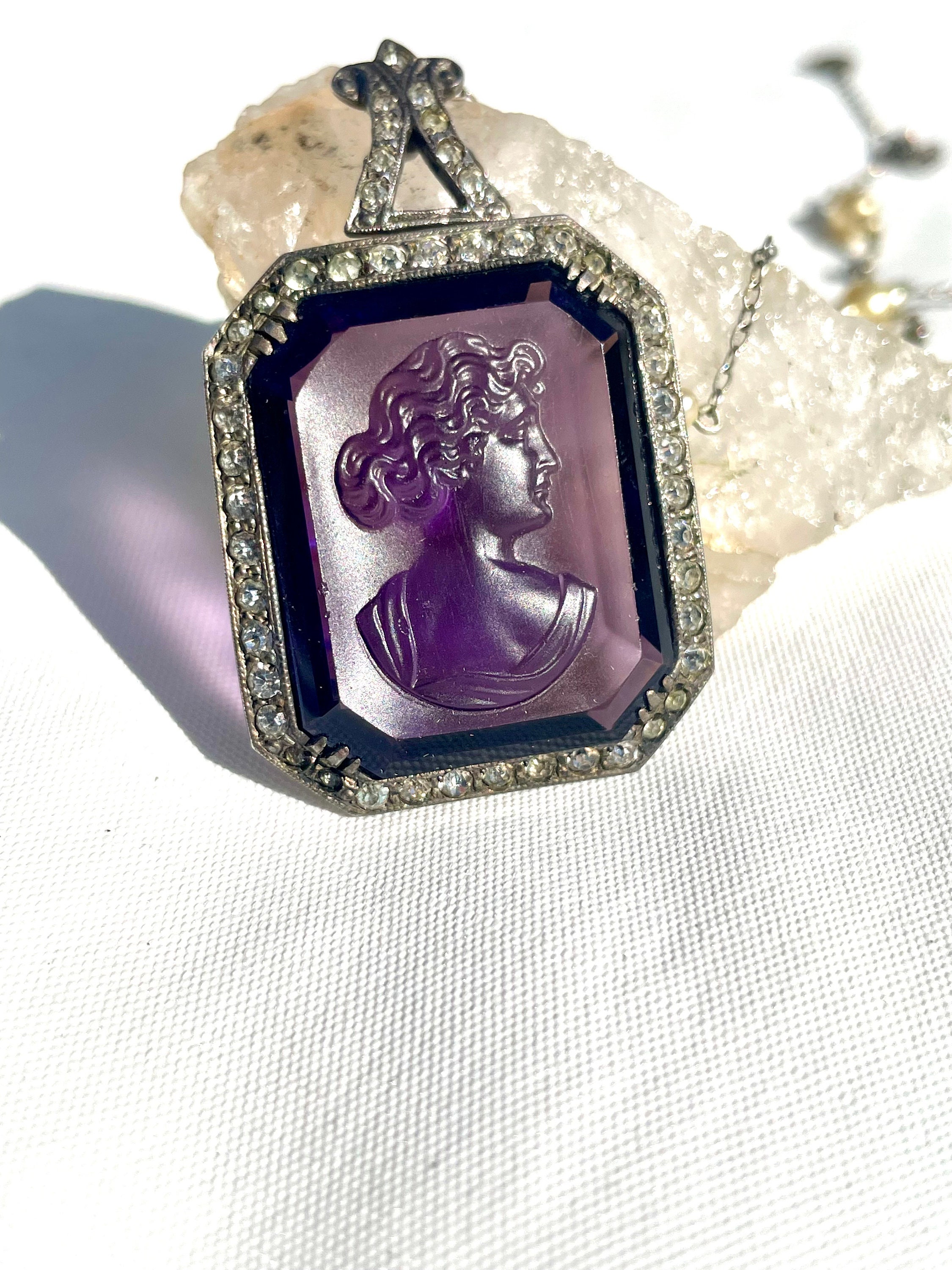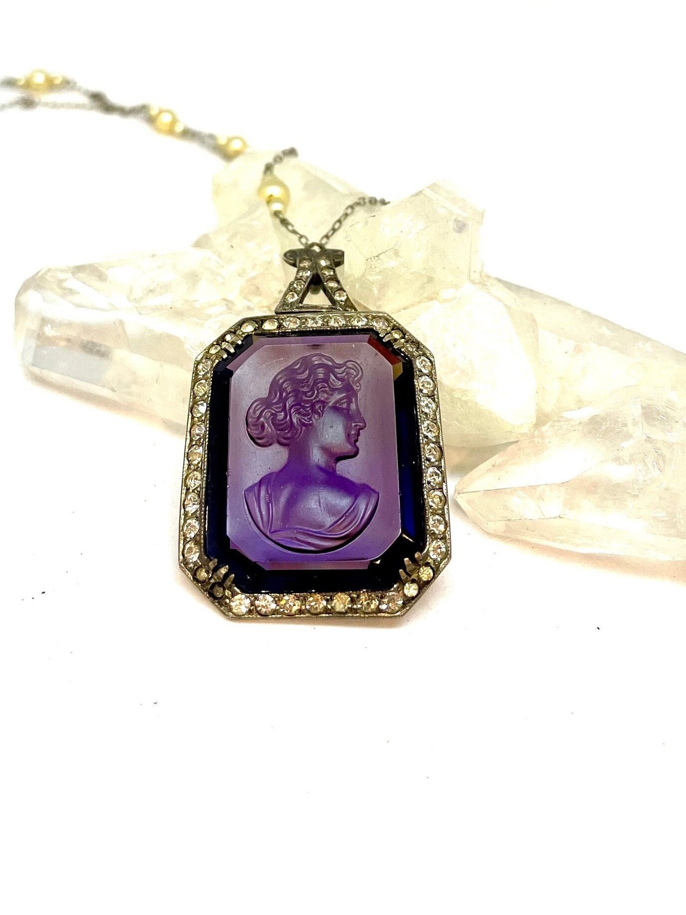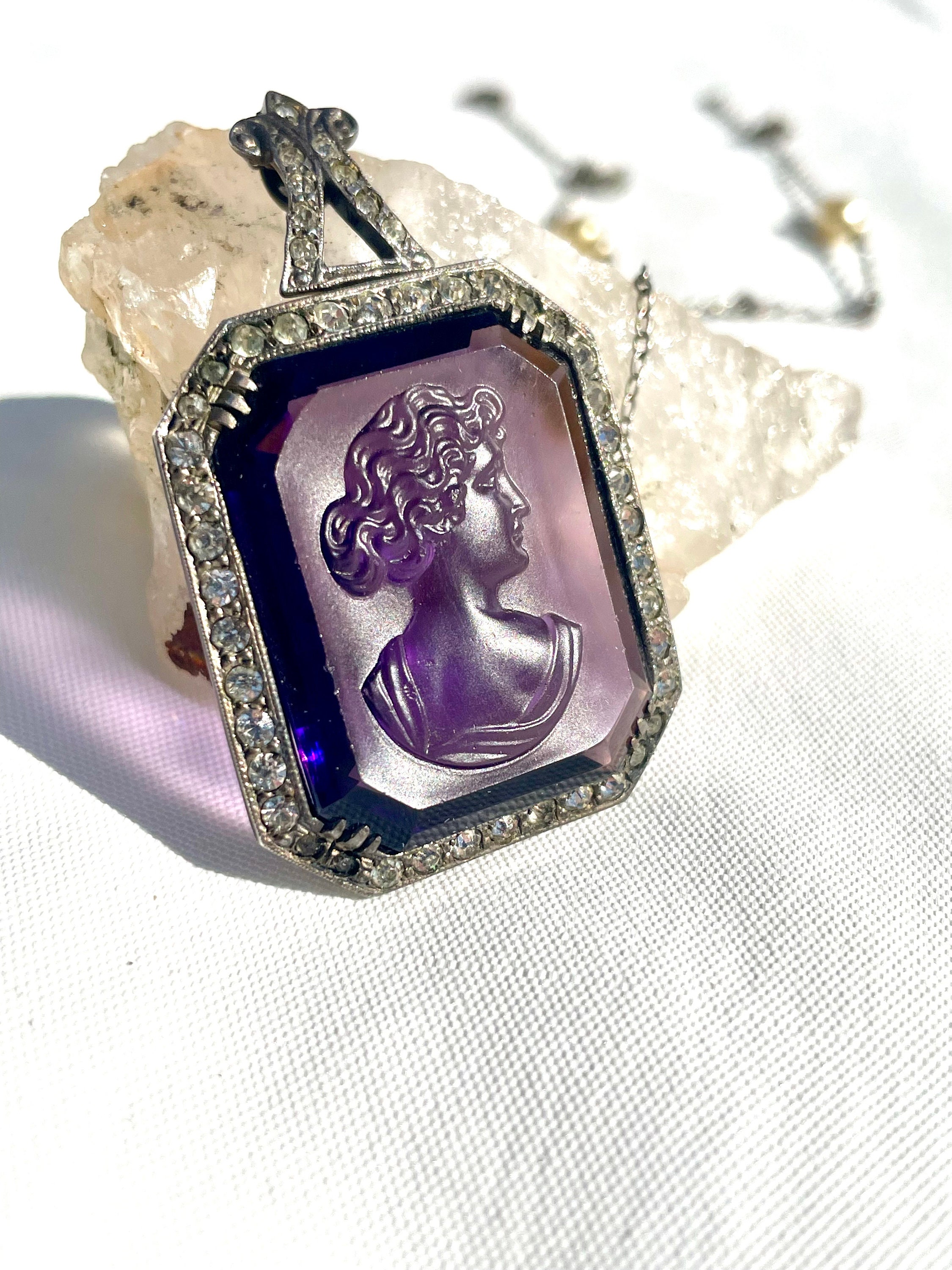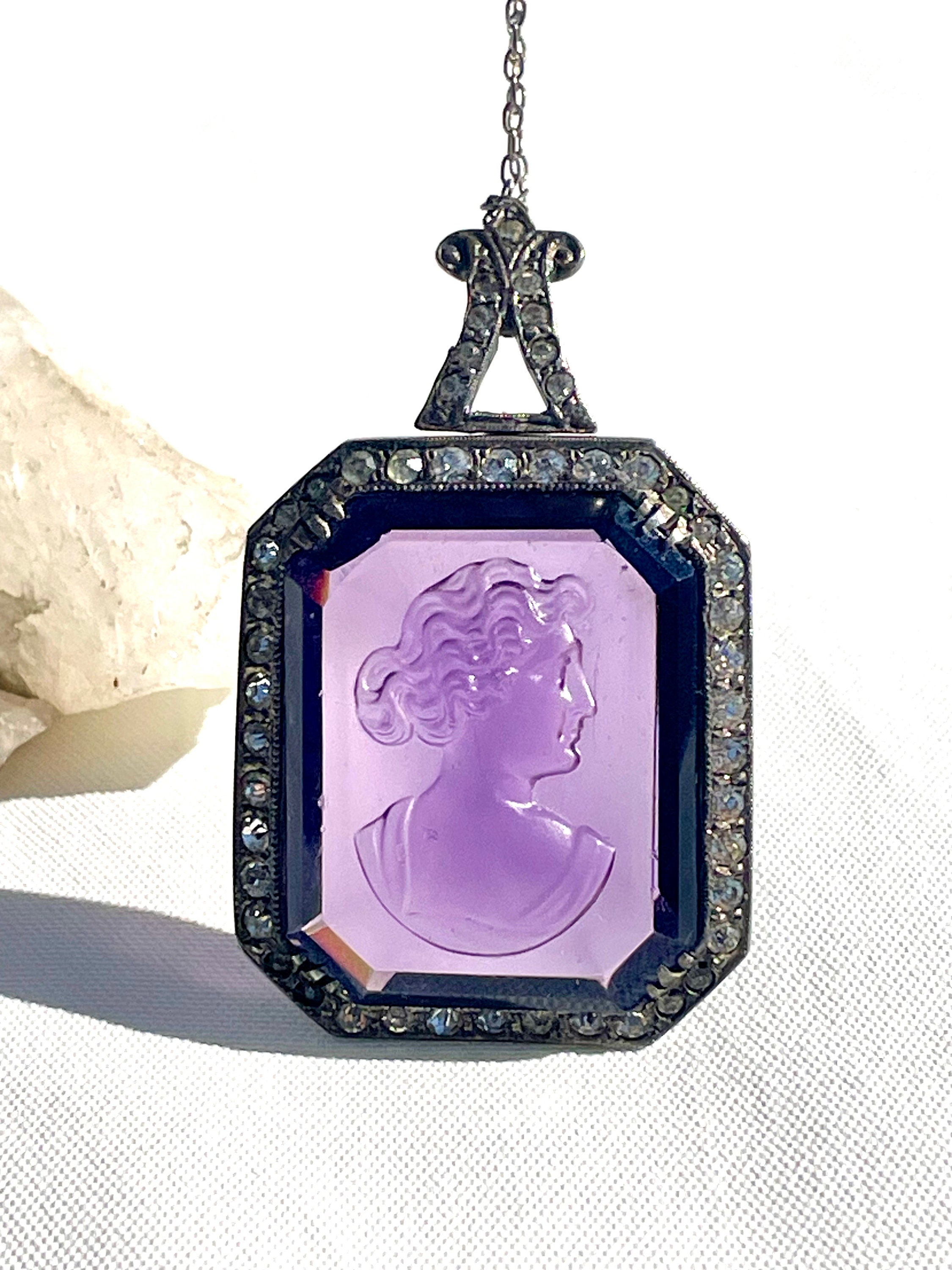 Cameos can be found with relative ease at estate sales and antique shops, but you’d be hard pressed to find one like this. This is a truly unique piece. An intricately carved piece of synthetic amethyst, framed by a sterling silver bezel with cubic zirconium, on a delicate chain, adorned with gorgeous natural pearls.