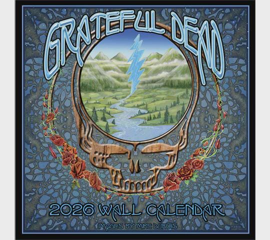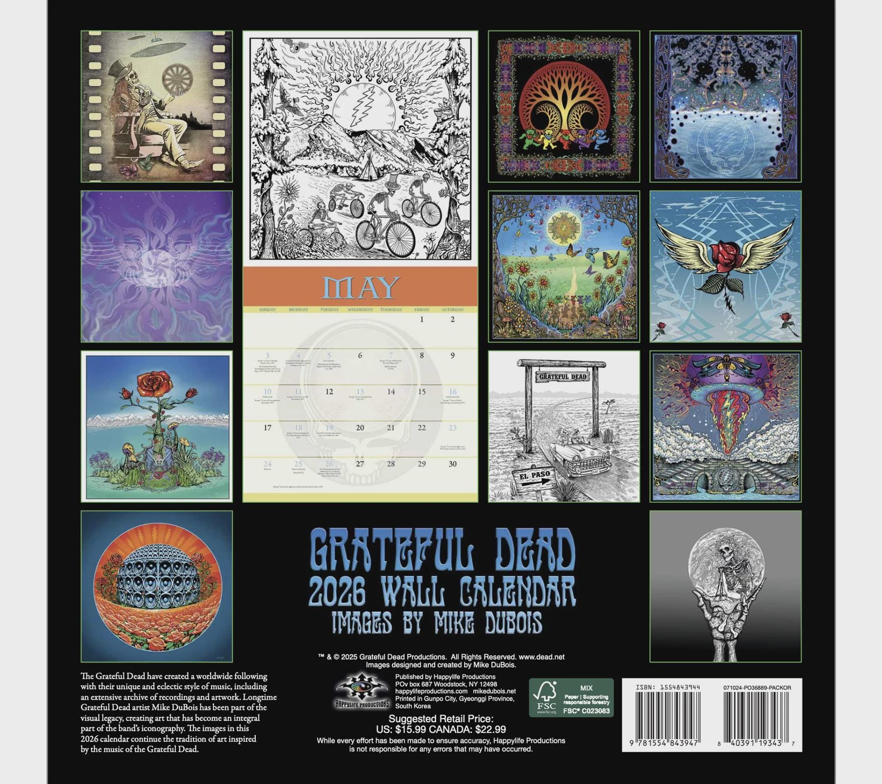 It's the 2026 officially licensed Grateful Dead wall calendar! Featuring 12 unique images by world-renowned Grateful Dead artist Mike Dubois. Mike Dubois has been creating beautiful Grateful Dead inspired artwork since 1990 and his work can be found at the official merch table at Dead and Company shows in the form of collectible prints and t-shirts.