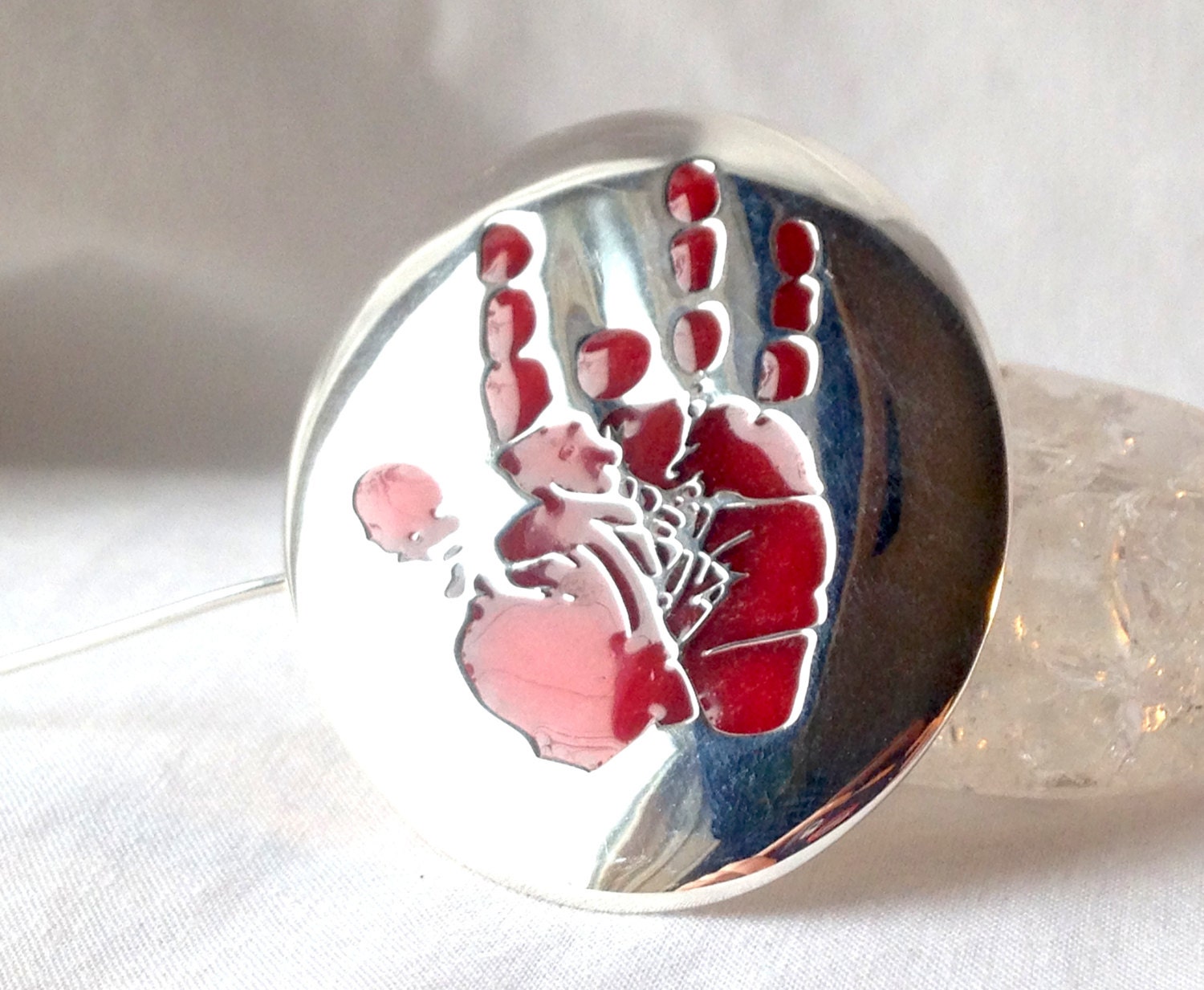 Here we have a lovely hand-cast piece which features the image of Jerry Garcia's handprint. As is depicted on this piece, Jerry Garcia was missing half of his right middle finger. This piece boasts very fine and detailed craftsmanship.