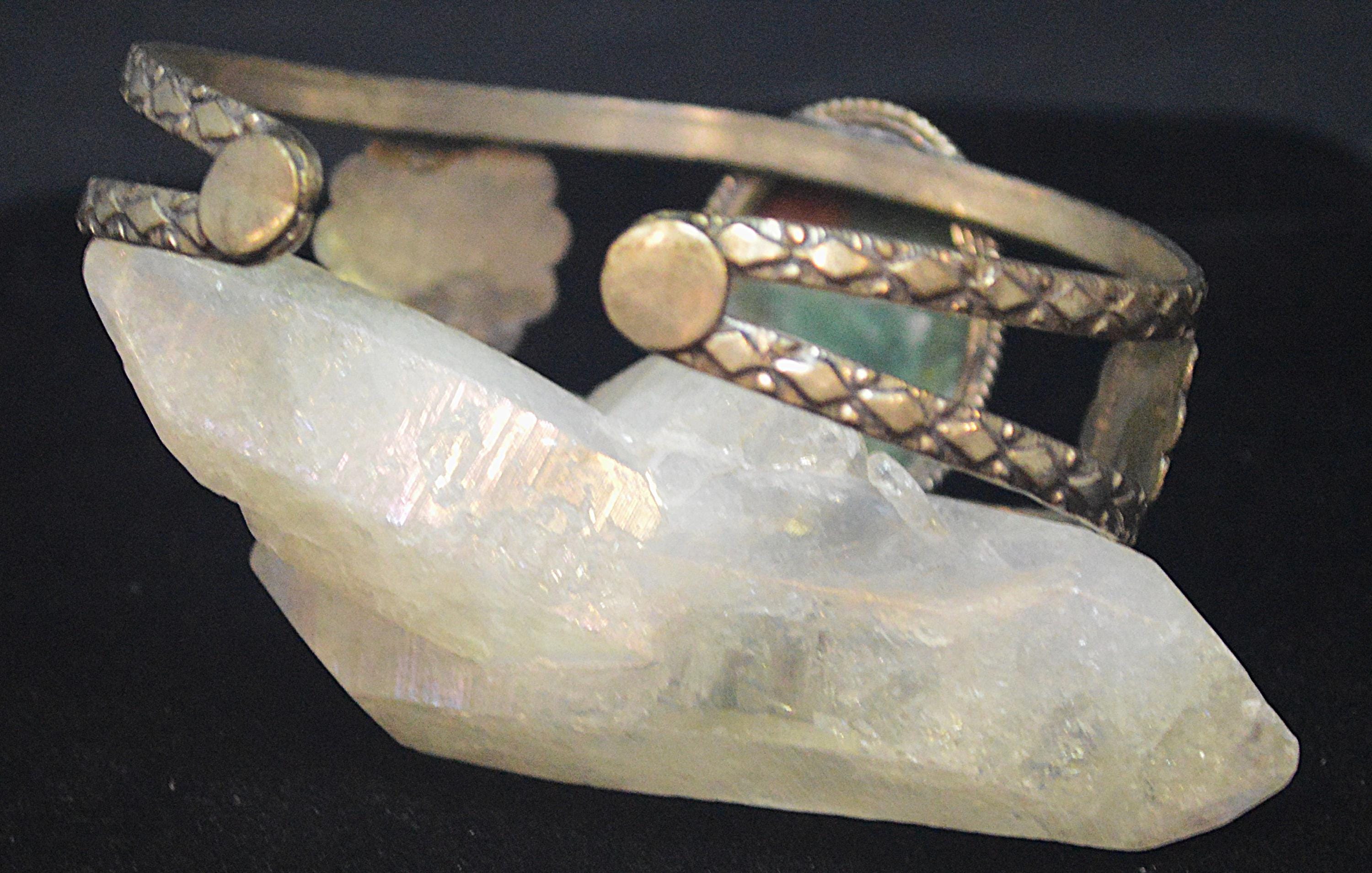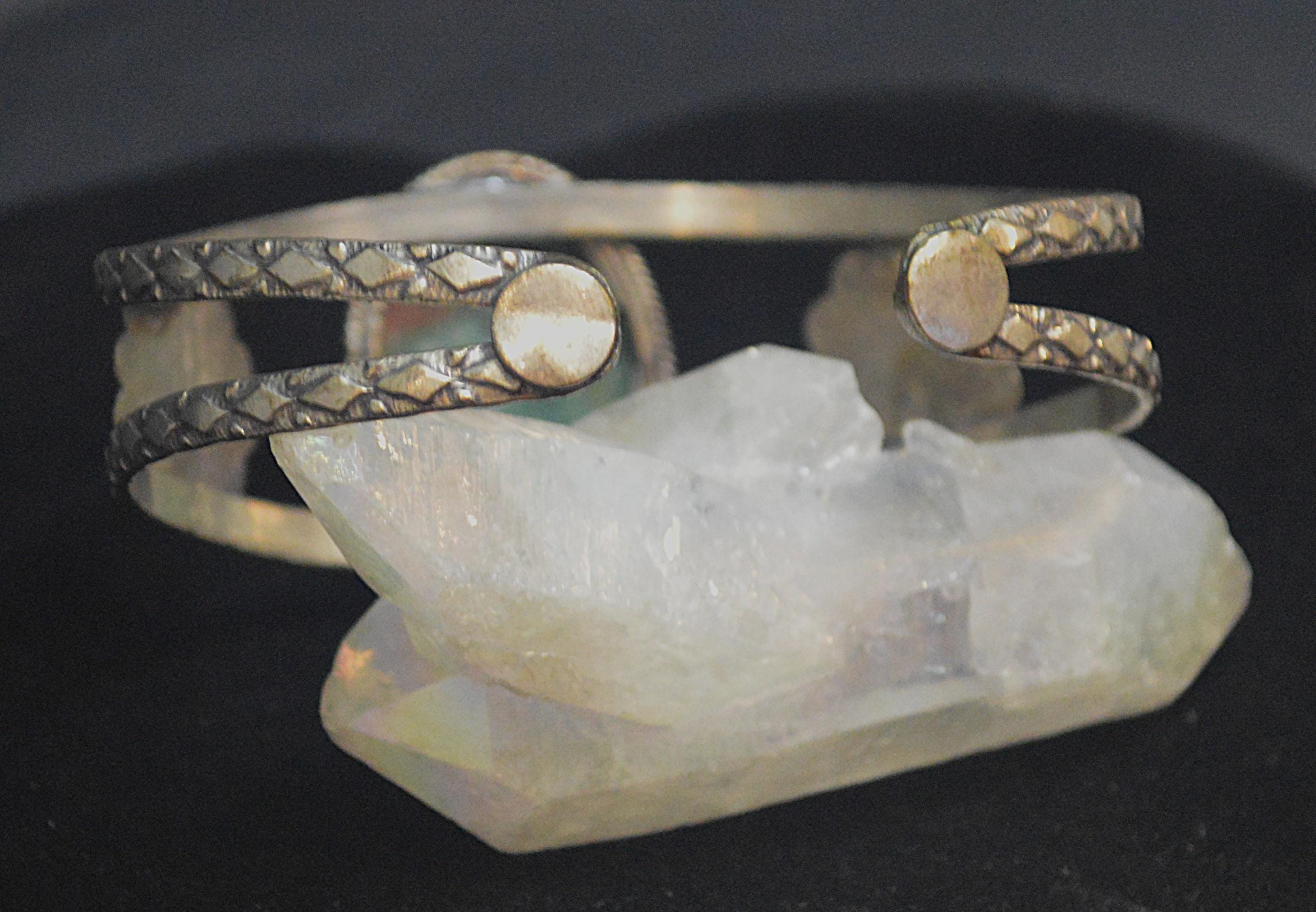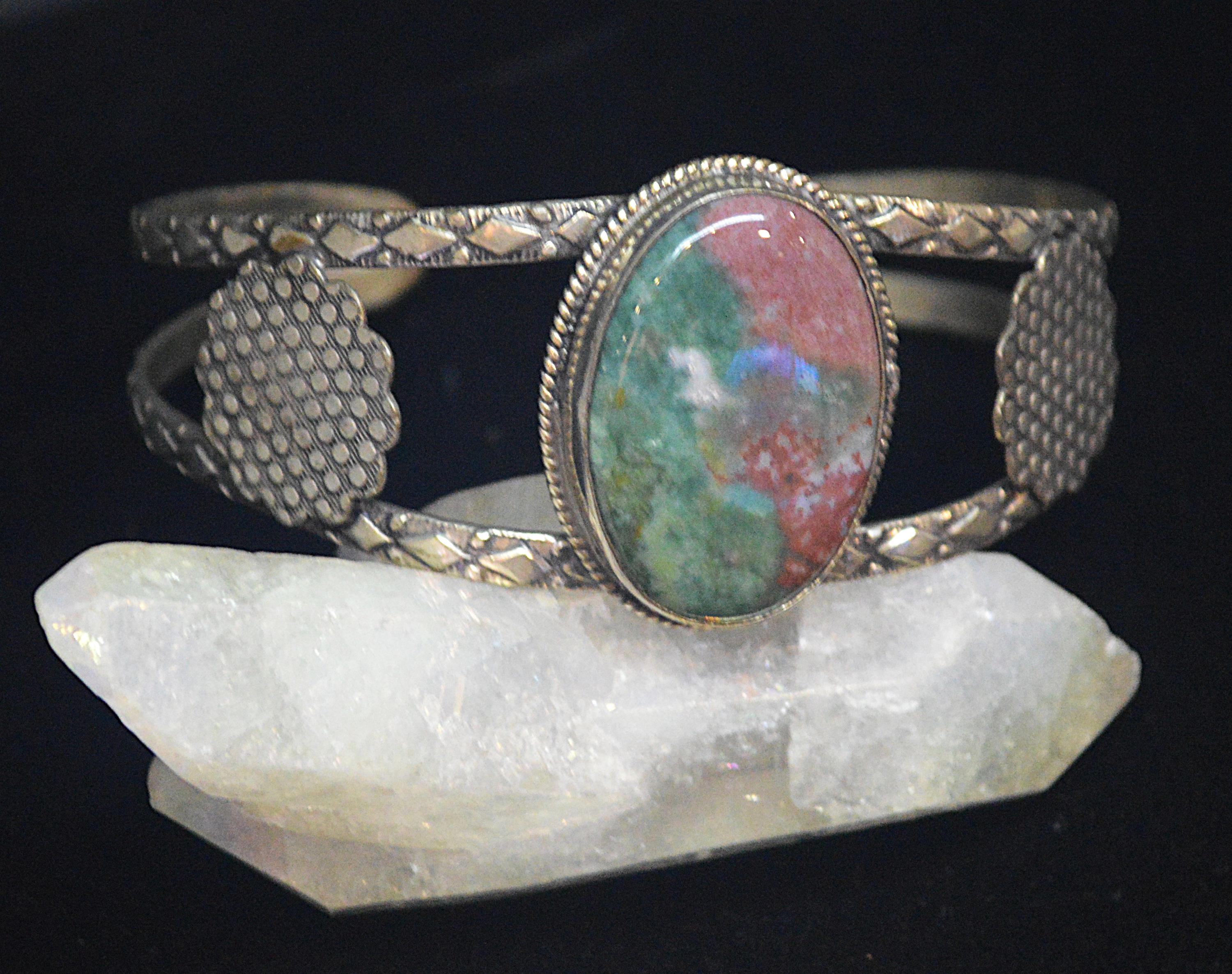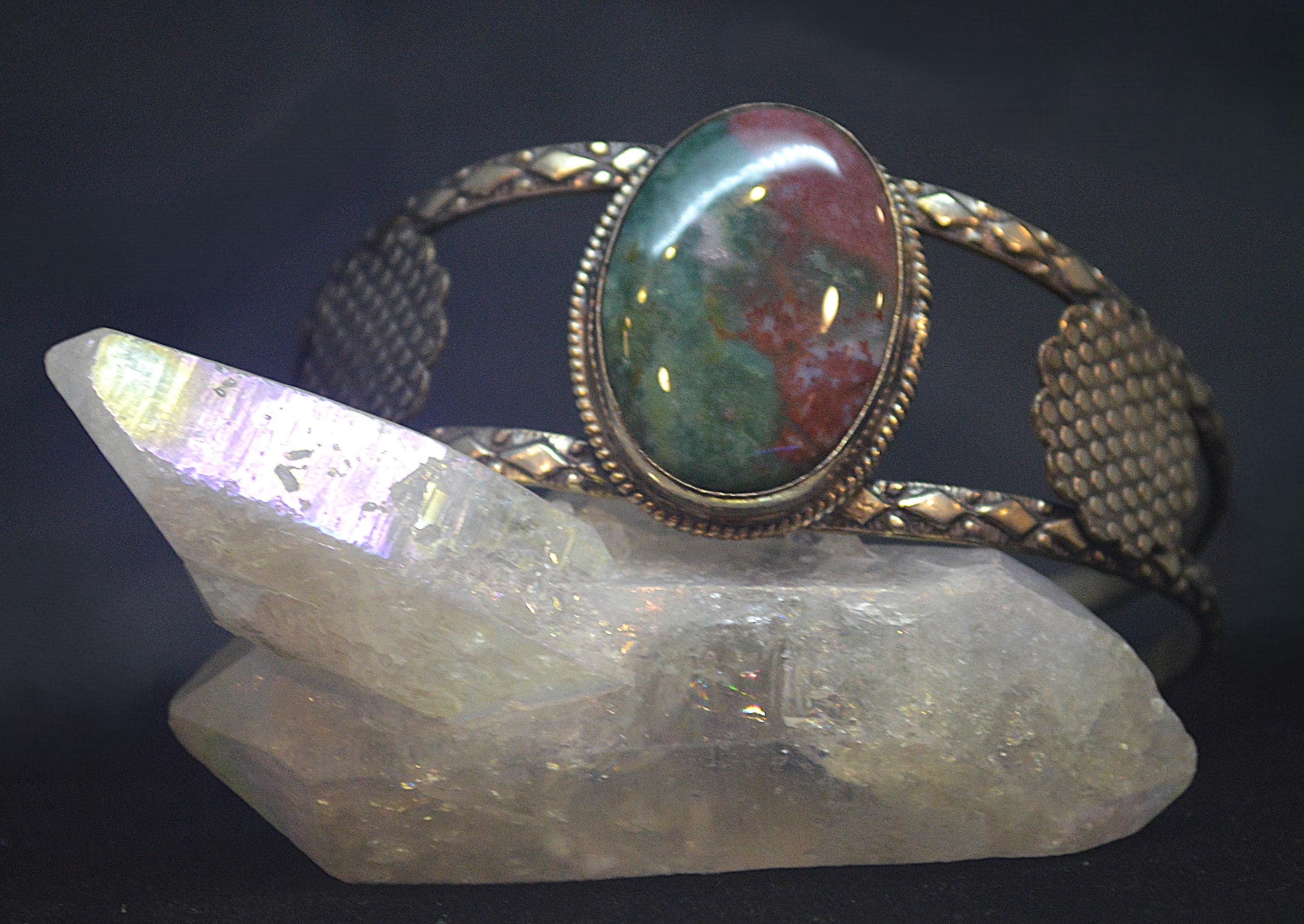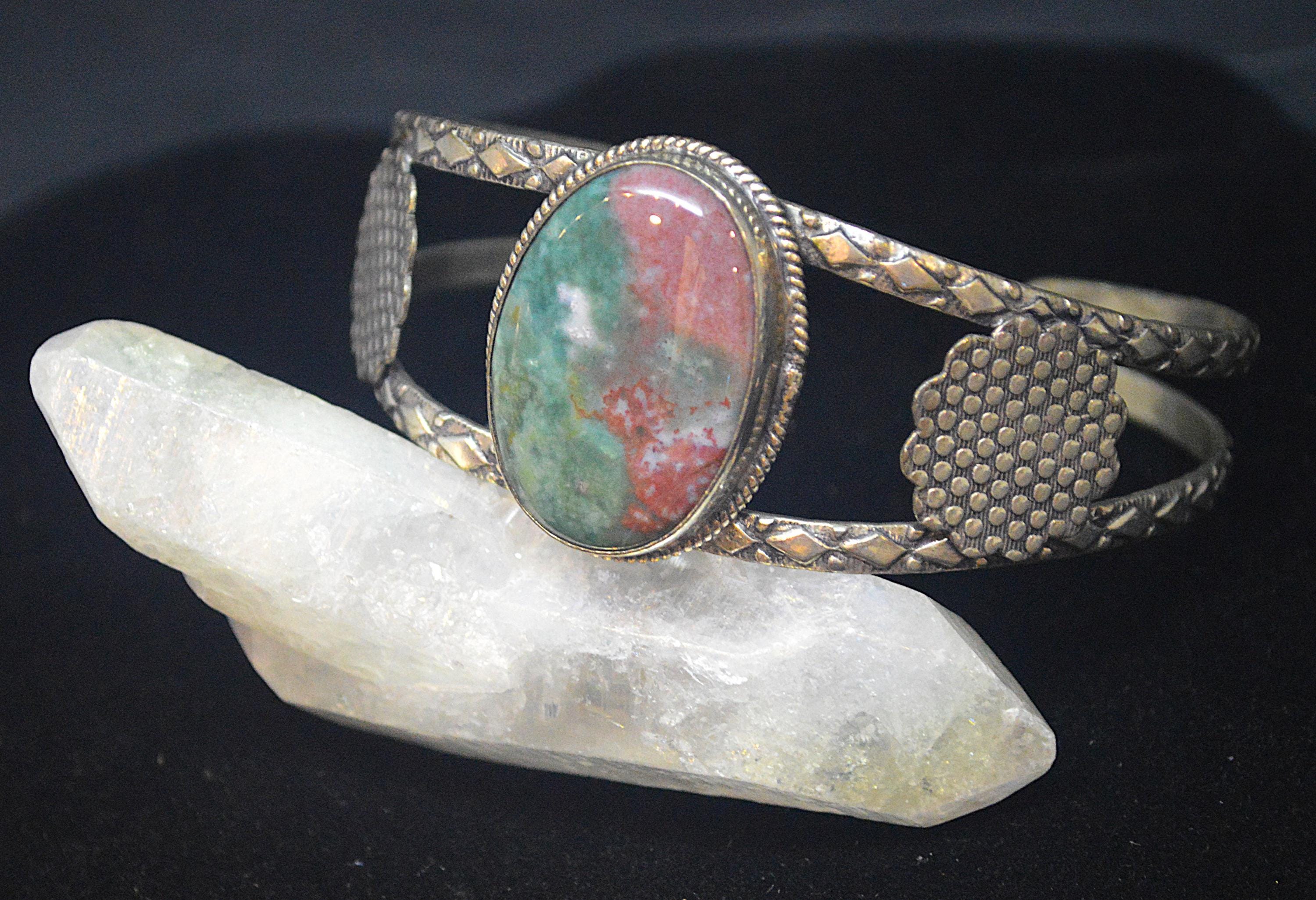 Vintage Sterling Cuff with Bloodstone CabochonSize: 8”Weight: 26 gramsMaterial: This cuff is crafted from 100% solid .925 sterling silver. It will NOT turn you green.
