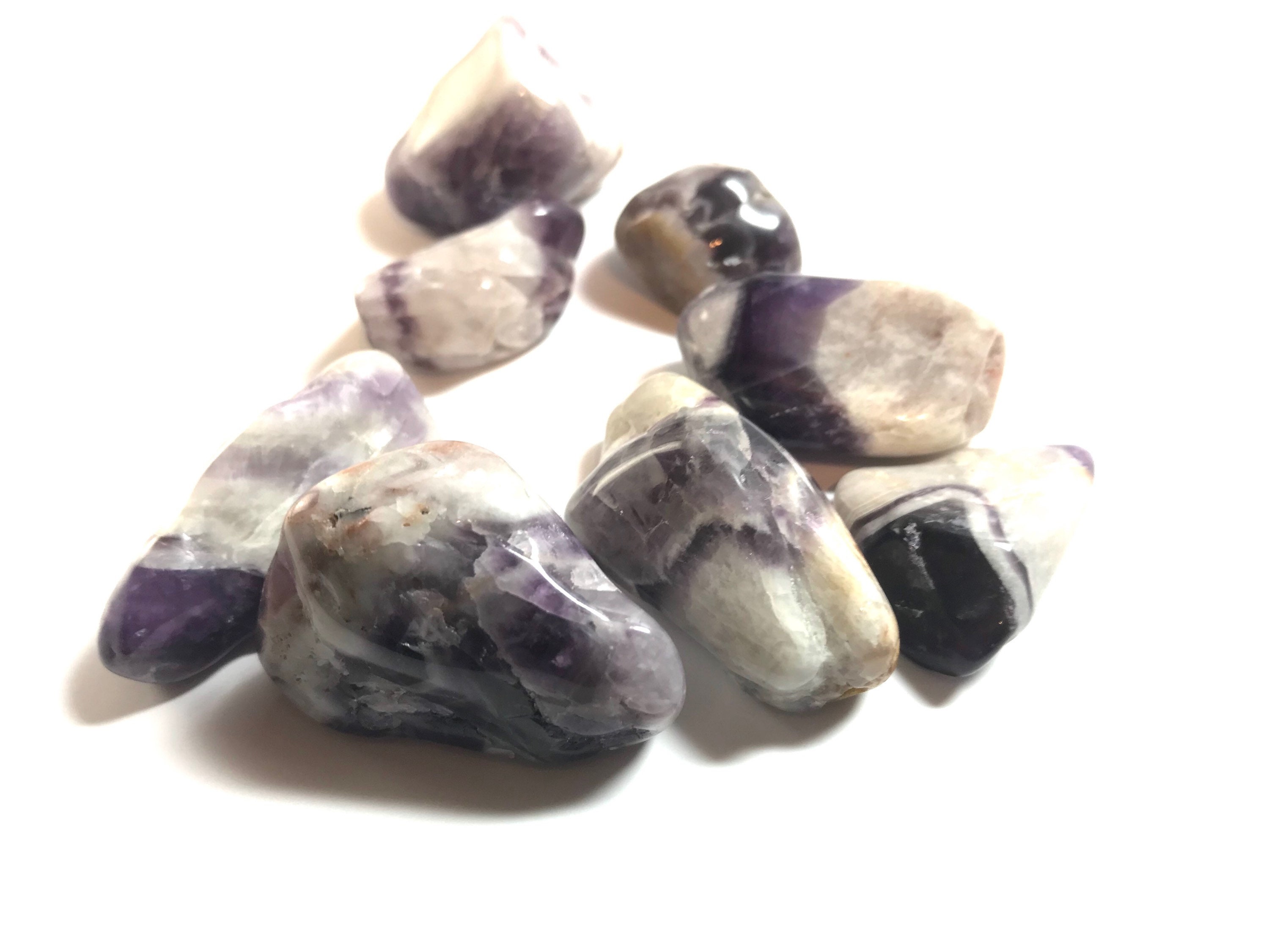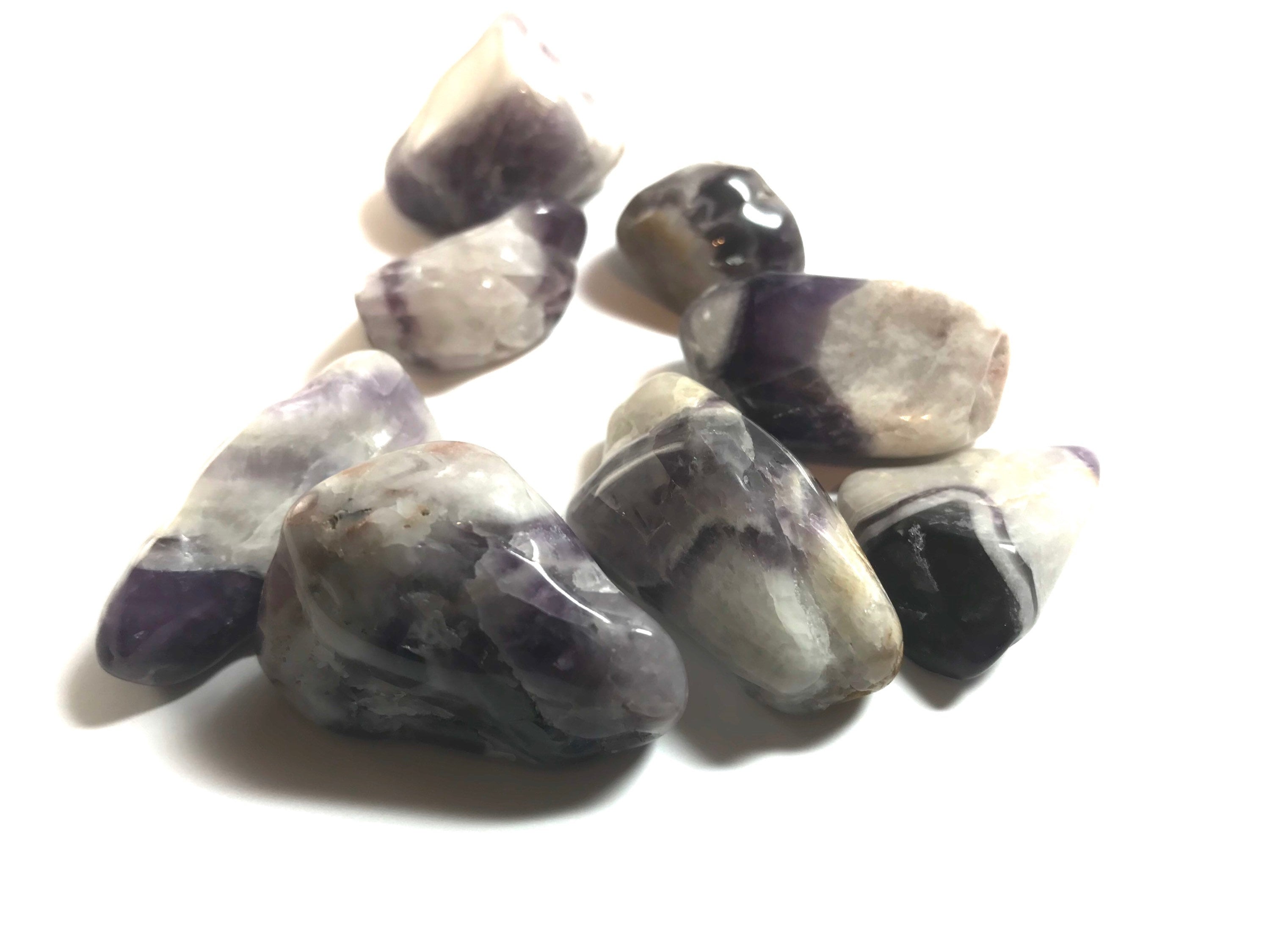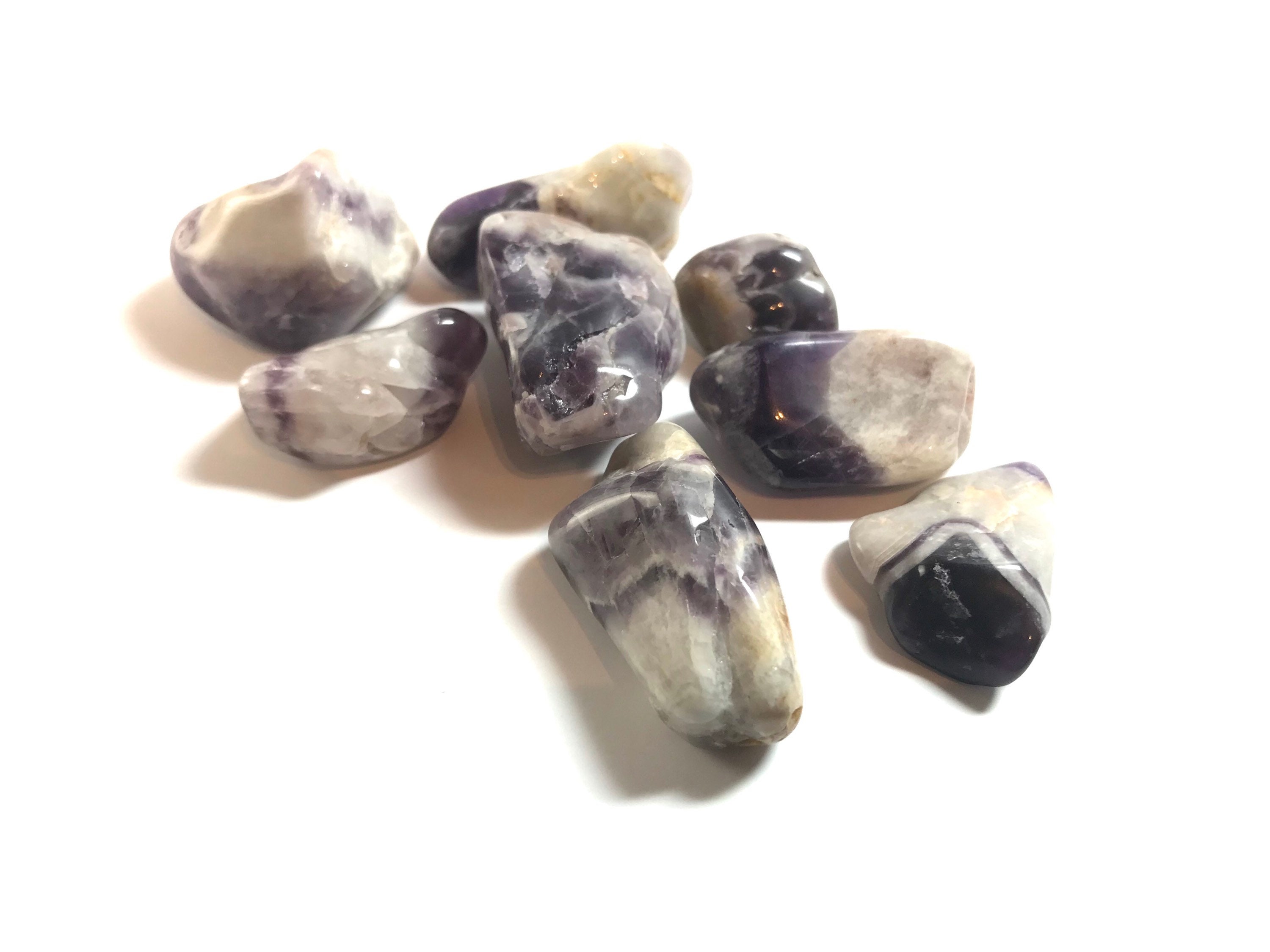 100 grams of tumbled Chevron Amethyst. Chevron Amethyst is a combination of Amethyst and White Quartz, mixed together in a V-striped or banded pattern. Chevron Amethyst combines the strengthening and enhancing qualities of Quartz with the stress relieving qualities of Amethyst. This symbiotic combination of minerals lends itself to a wonderfully spiritual stone, which is great for gently removing the veils that obscure some of the hidden meanings in life.