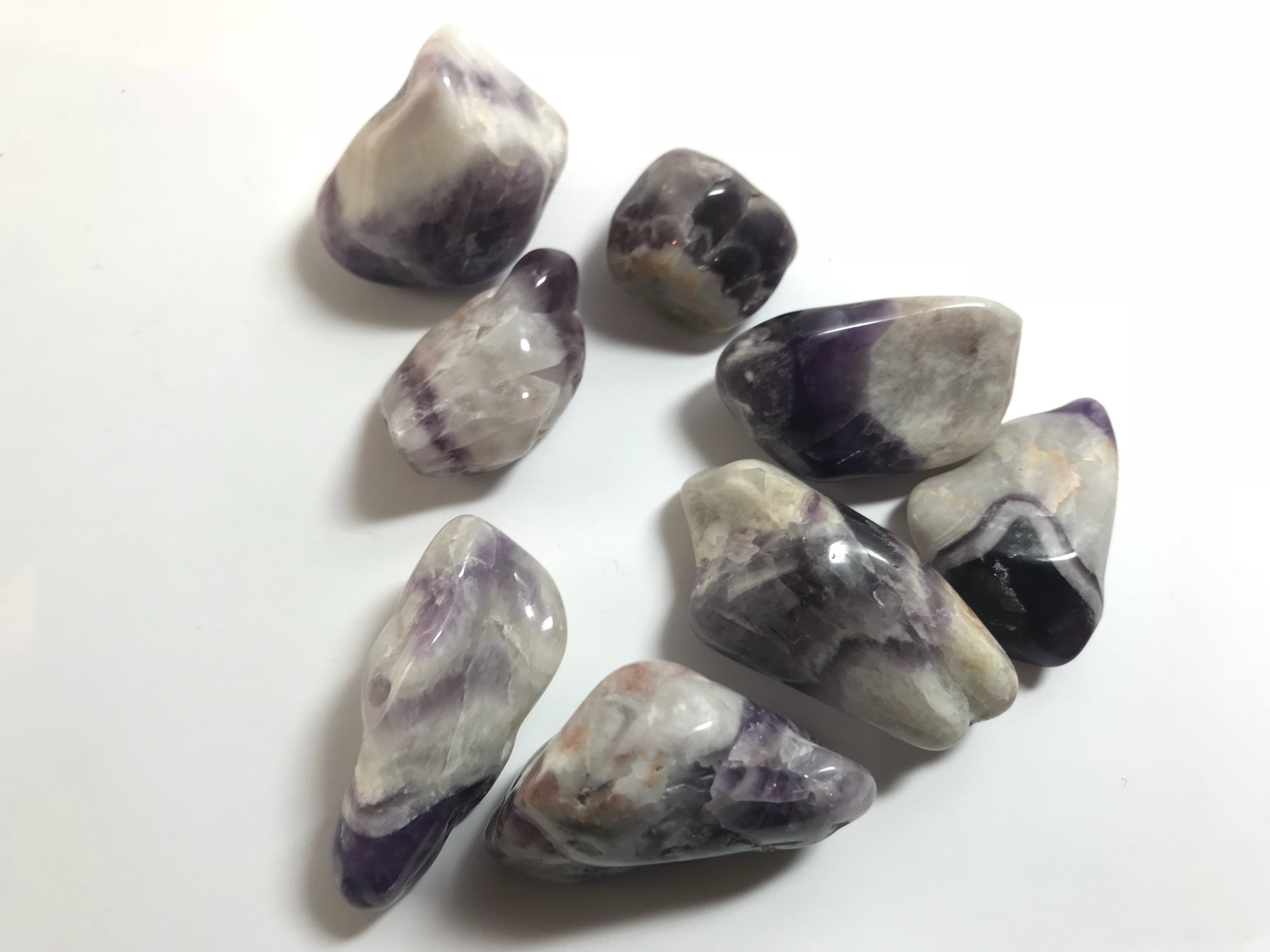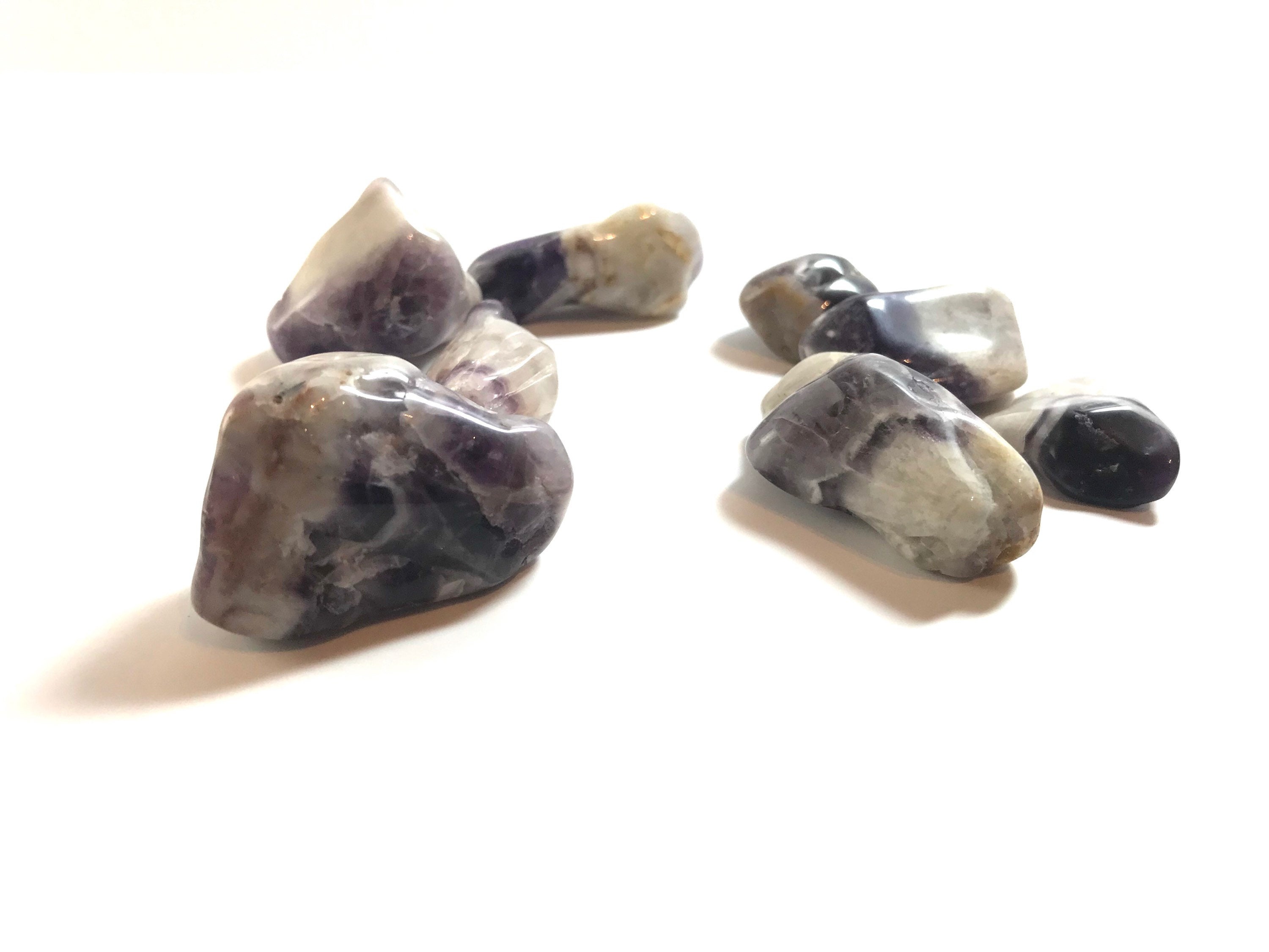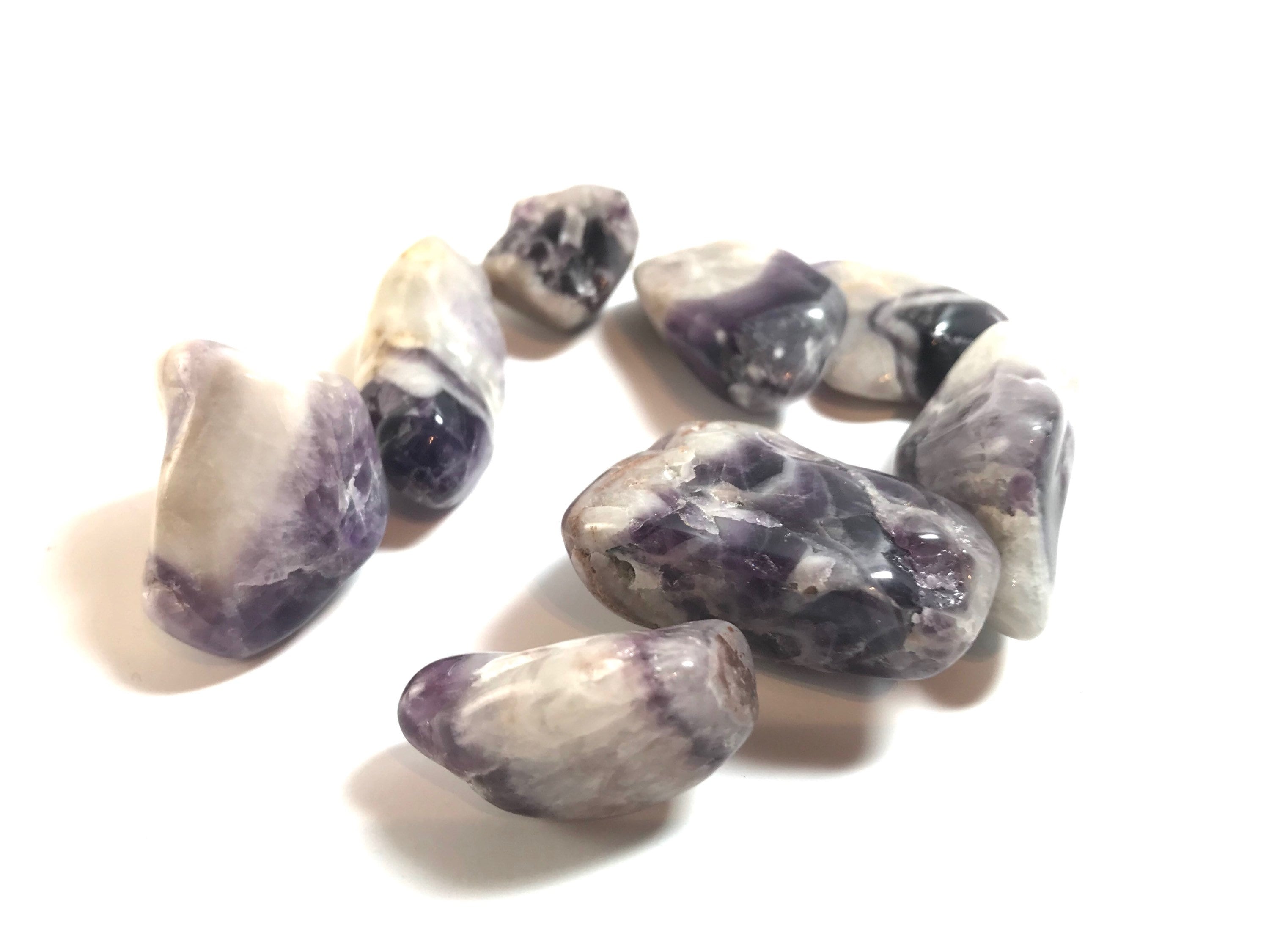 100 grams of tumbled Chevron Amethyst. Chevron Amethyst is a combination of Amethyst and White Quartz, mixed together in a V-striped or banded pattern. Chevron Amethyst combines the strengthening and enhancing qualities of Quartz with the stress relieving qualities of Amethyst. This symbiotic combination of minerals lends itself to a wonderfully spiritual stone, which is great for gently removing the veils that obscure some of the hidden meanings in life.