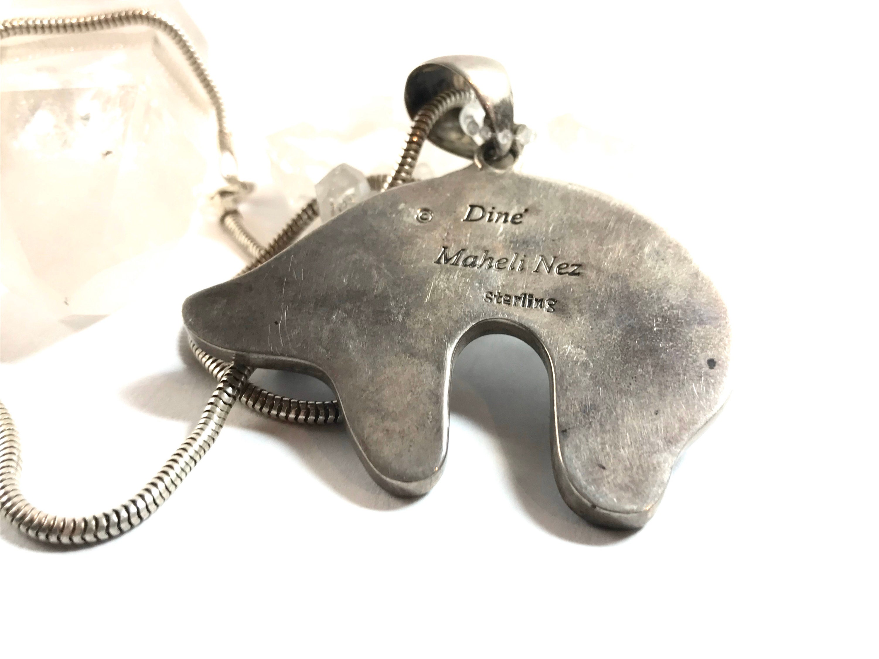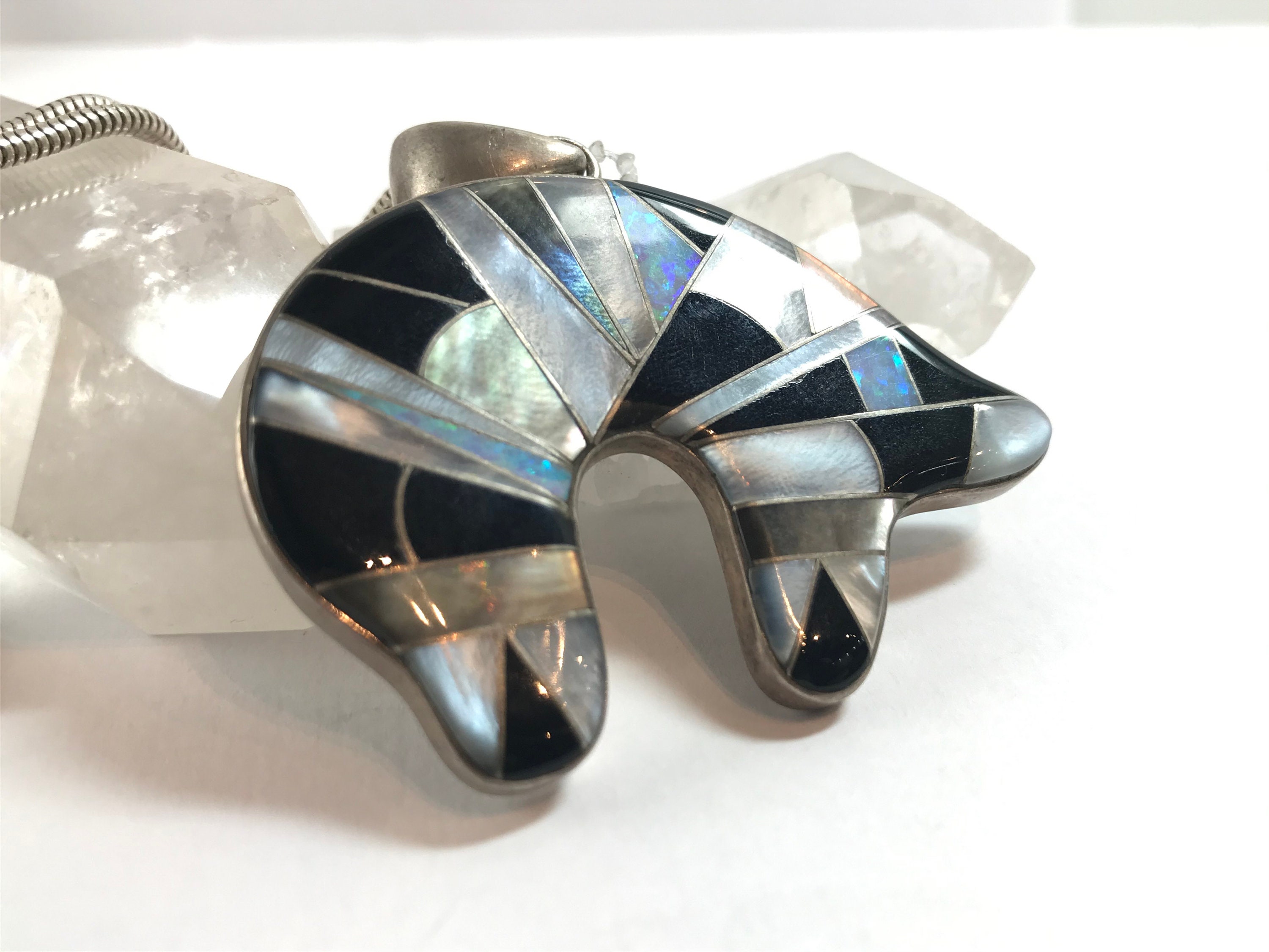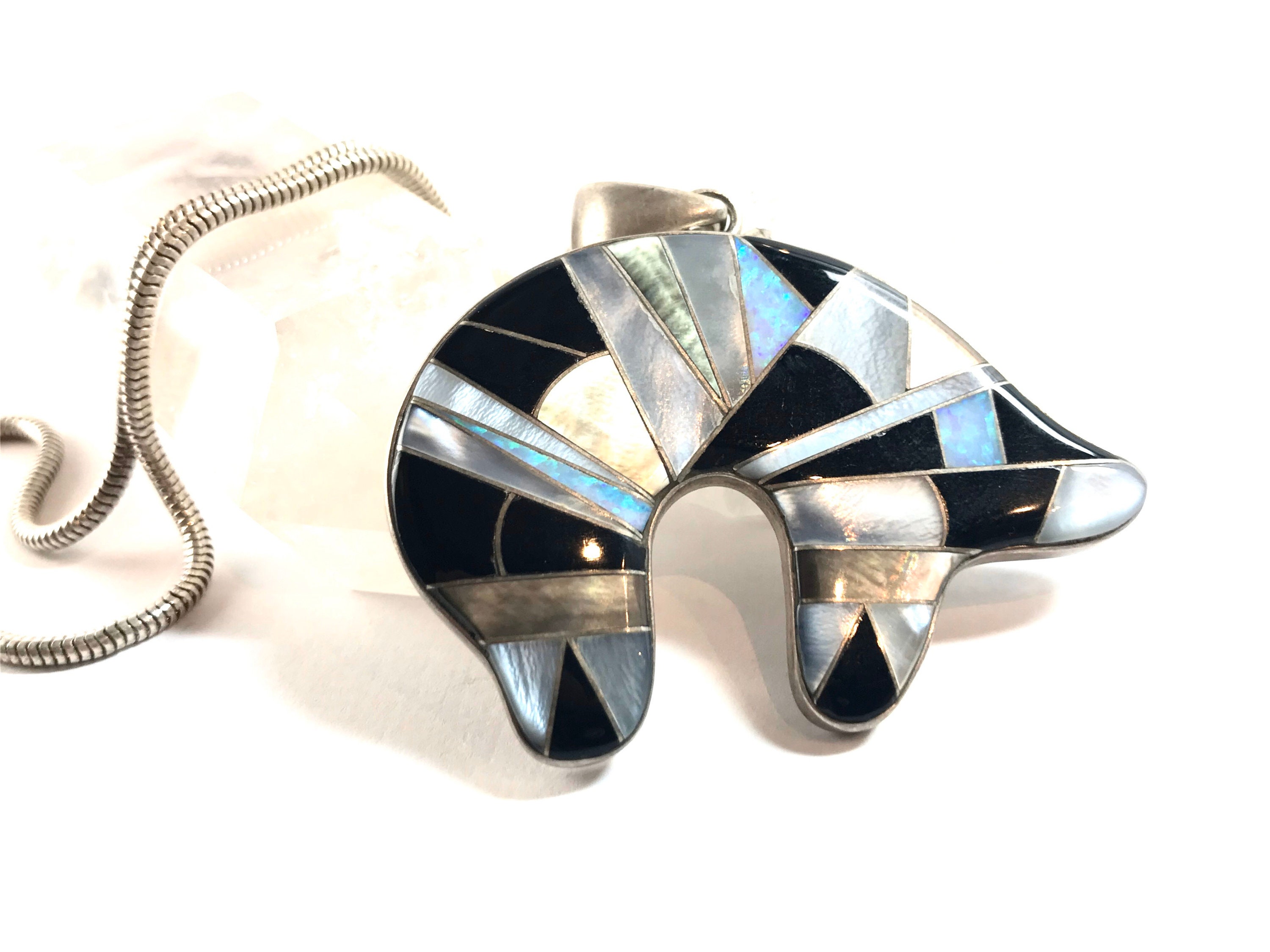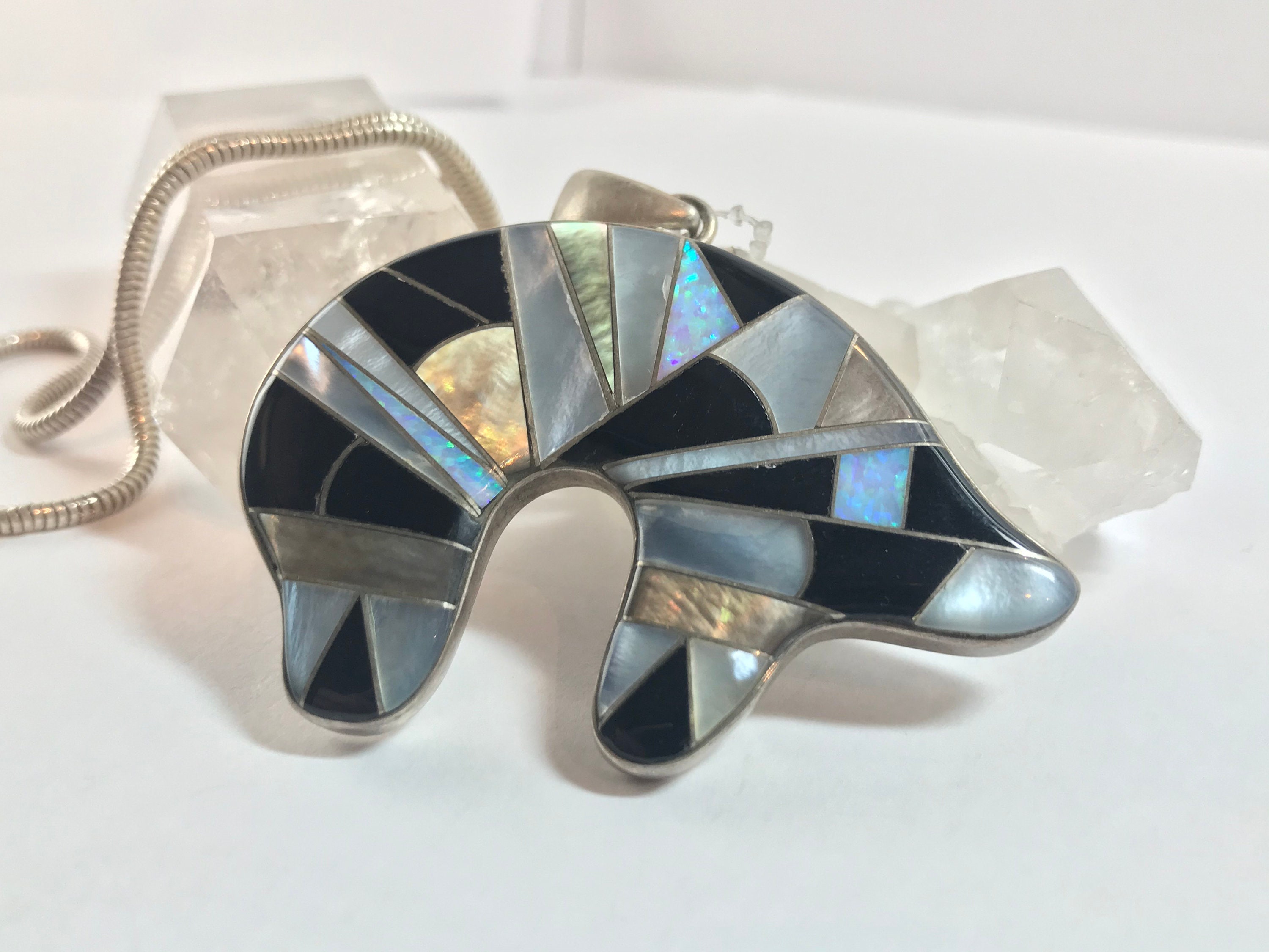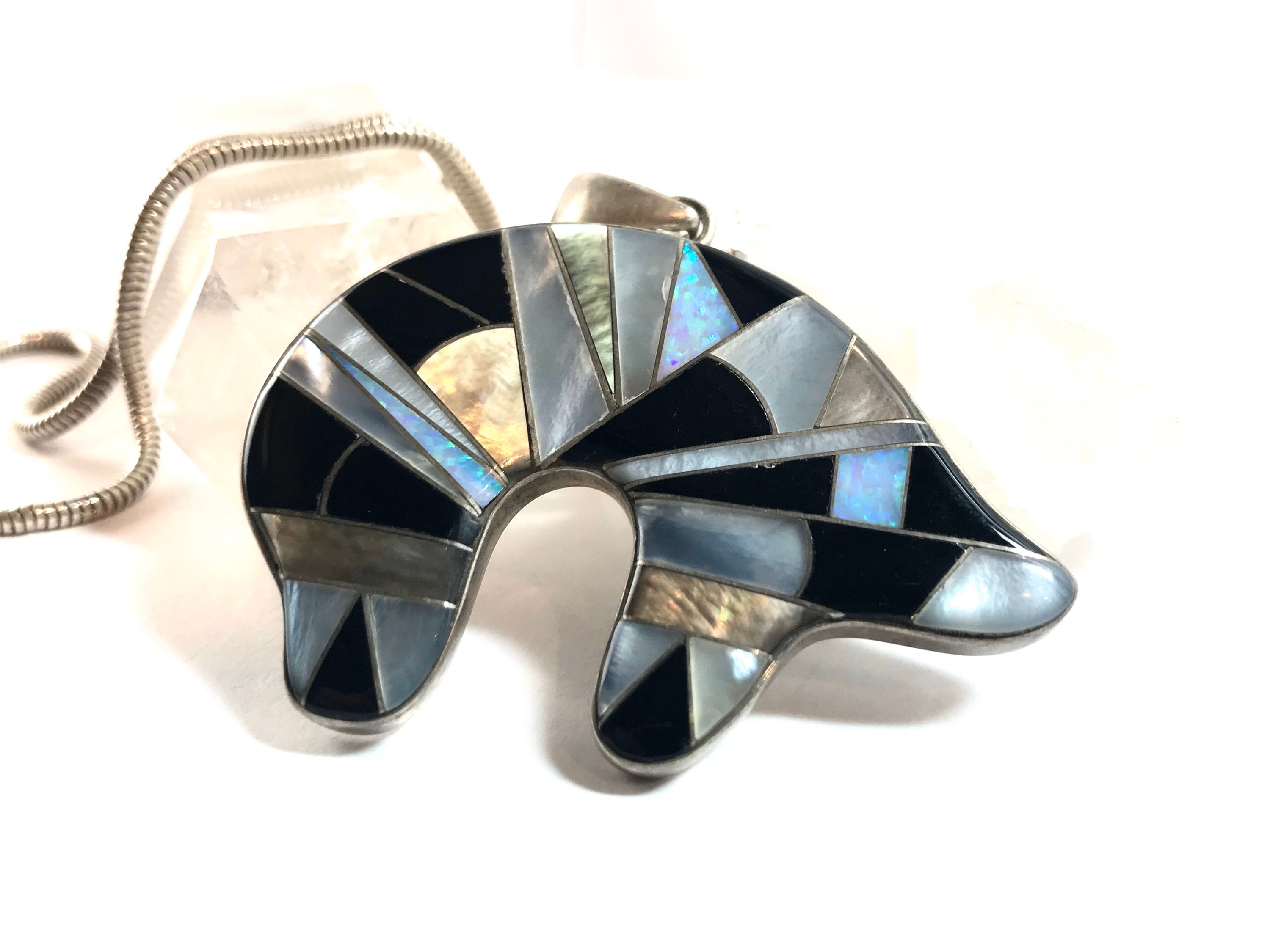 Here we have an absolutely stunning one of a kind Zuni bear pendant. This piece is handcrafted with sterling silver and includes abalone, onyx, mother of pearl and opal inlay. Features makers mark on the back.