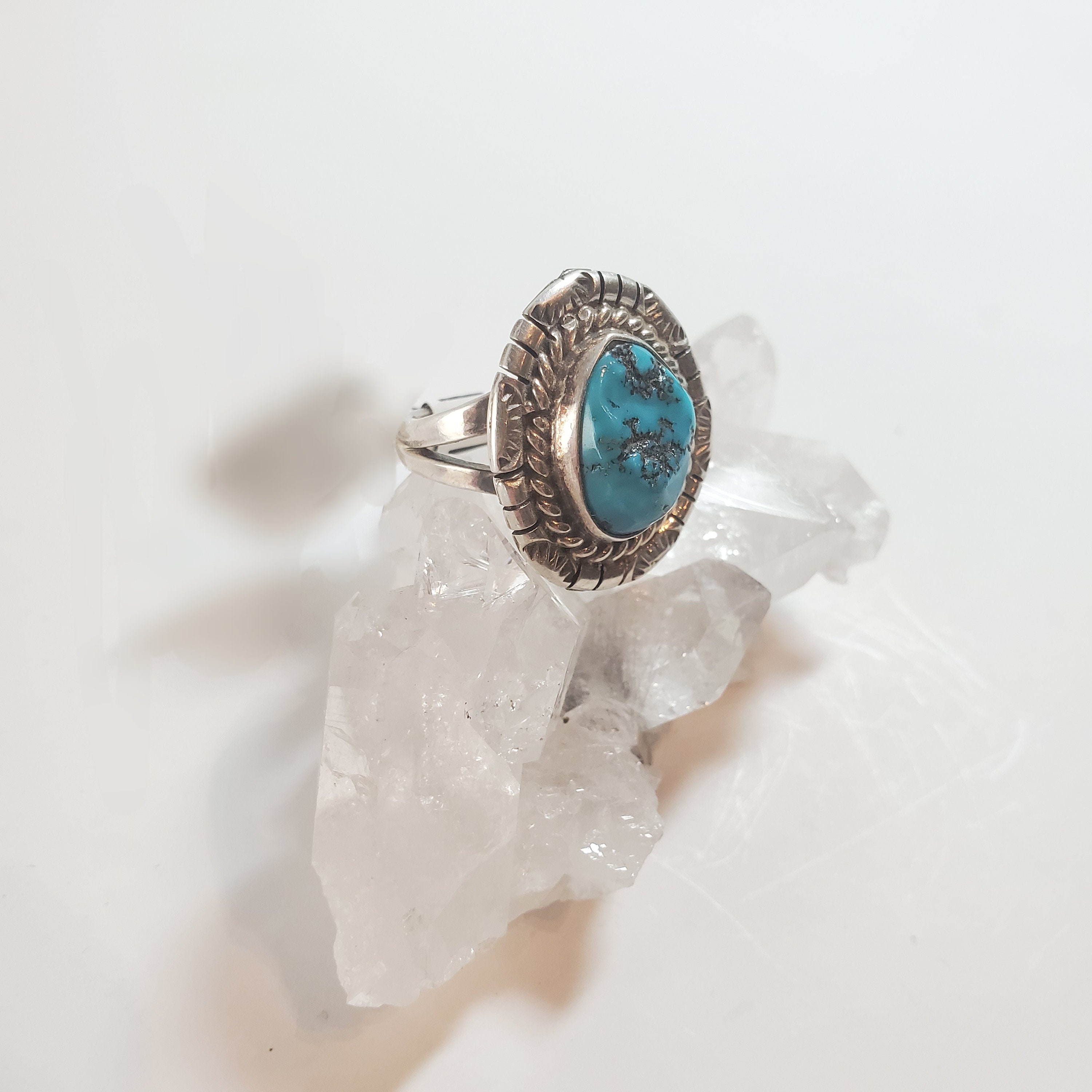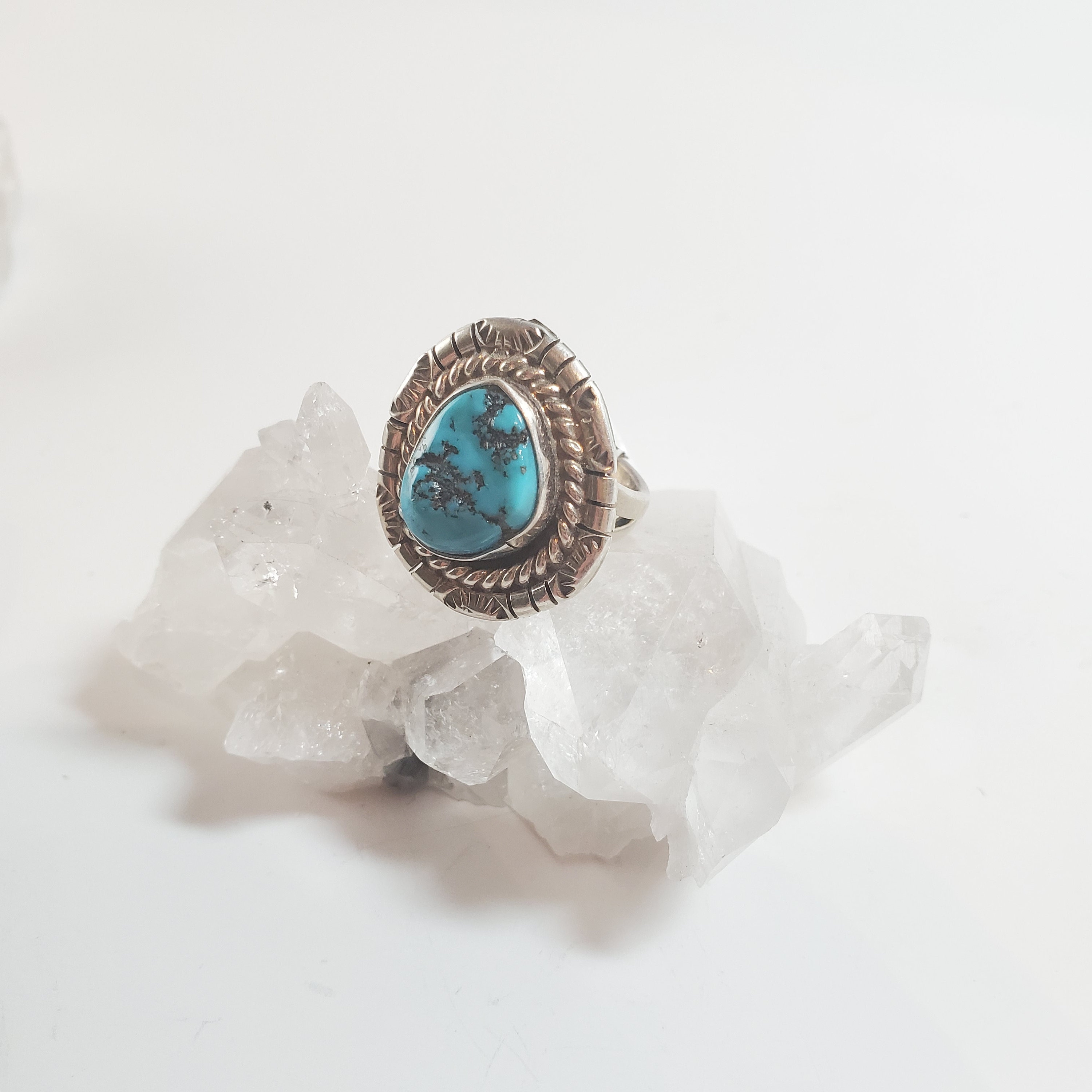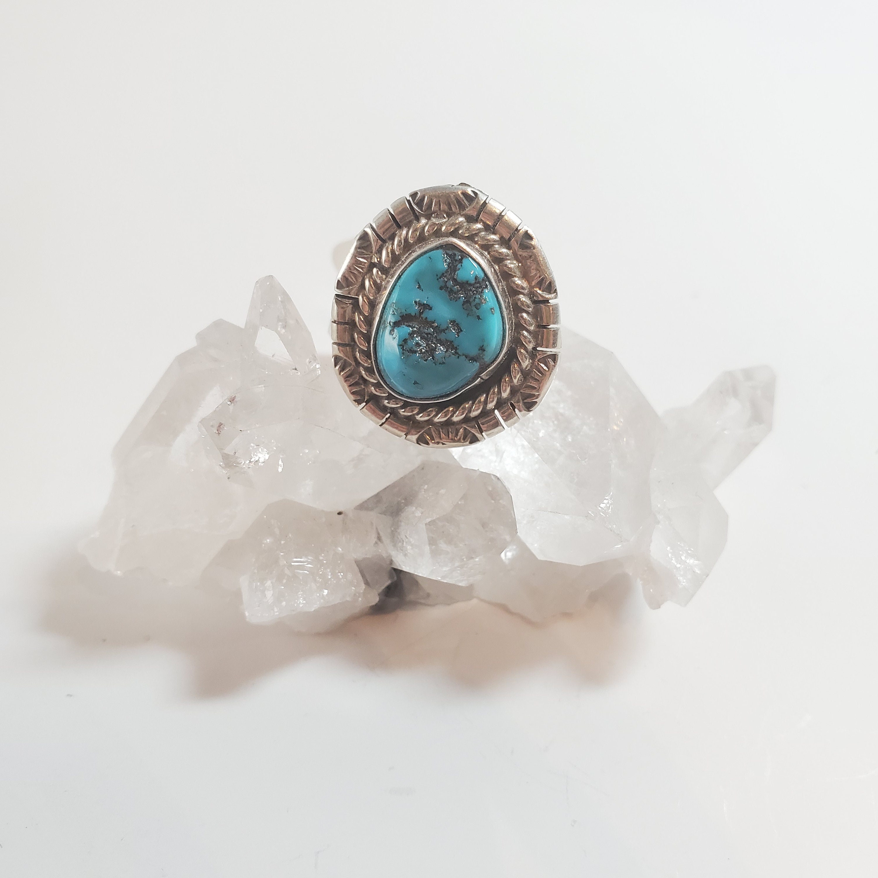This authentic handmade Indian Silver ring is one of a kind! A size 3.5, this piece features a beautiful Turquoise cabochon, framed with ornamental silver braiding.