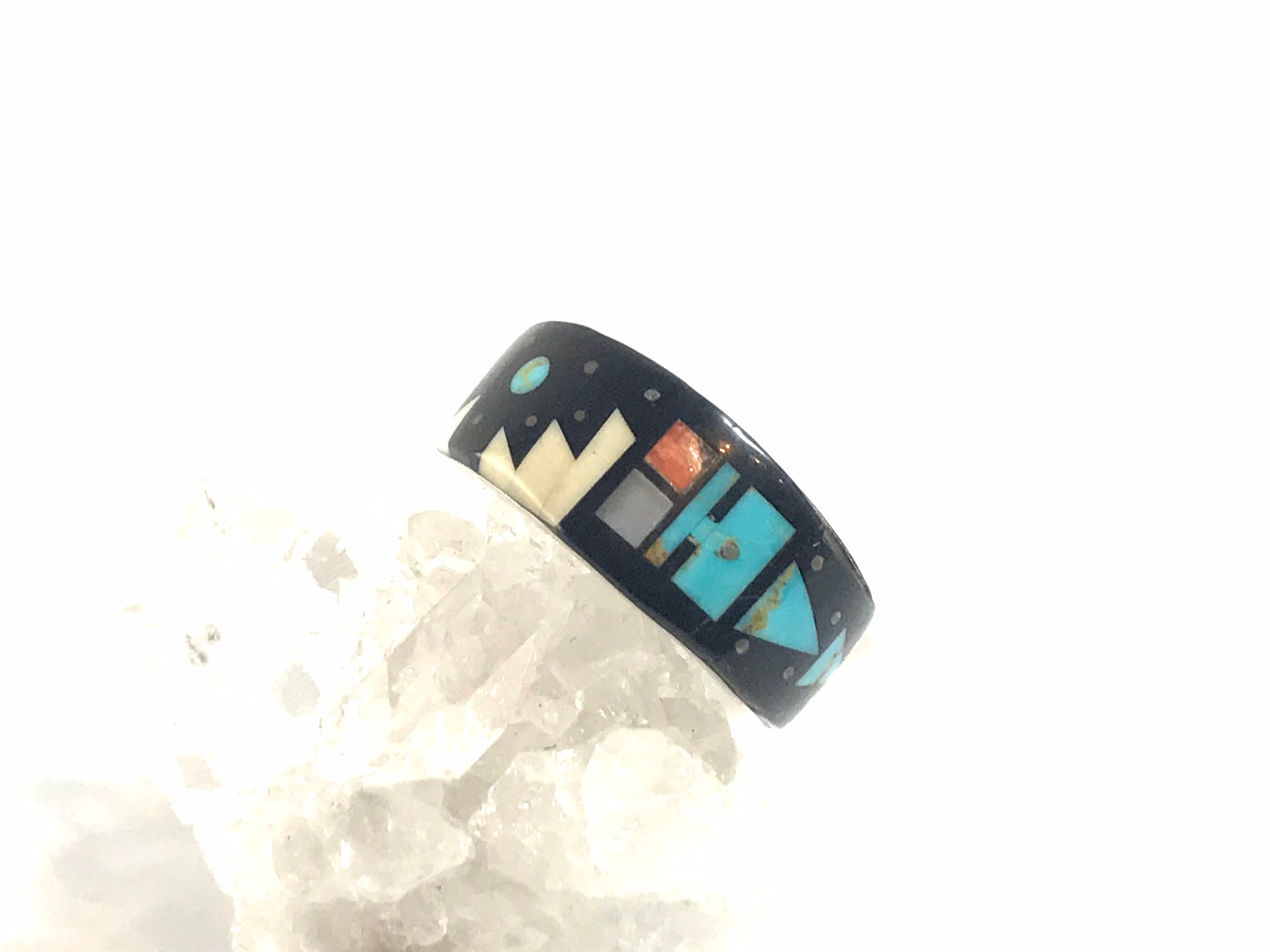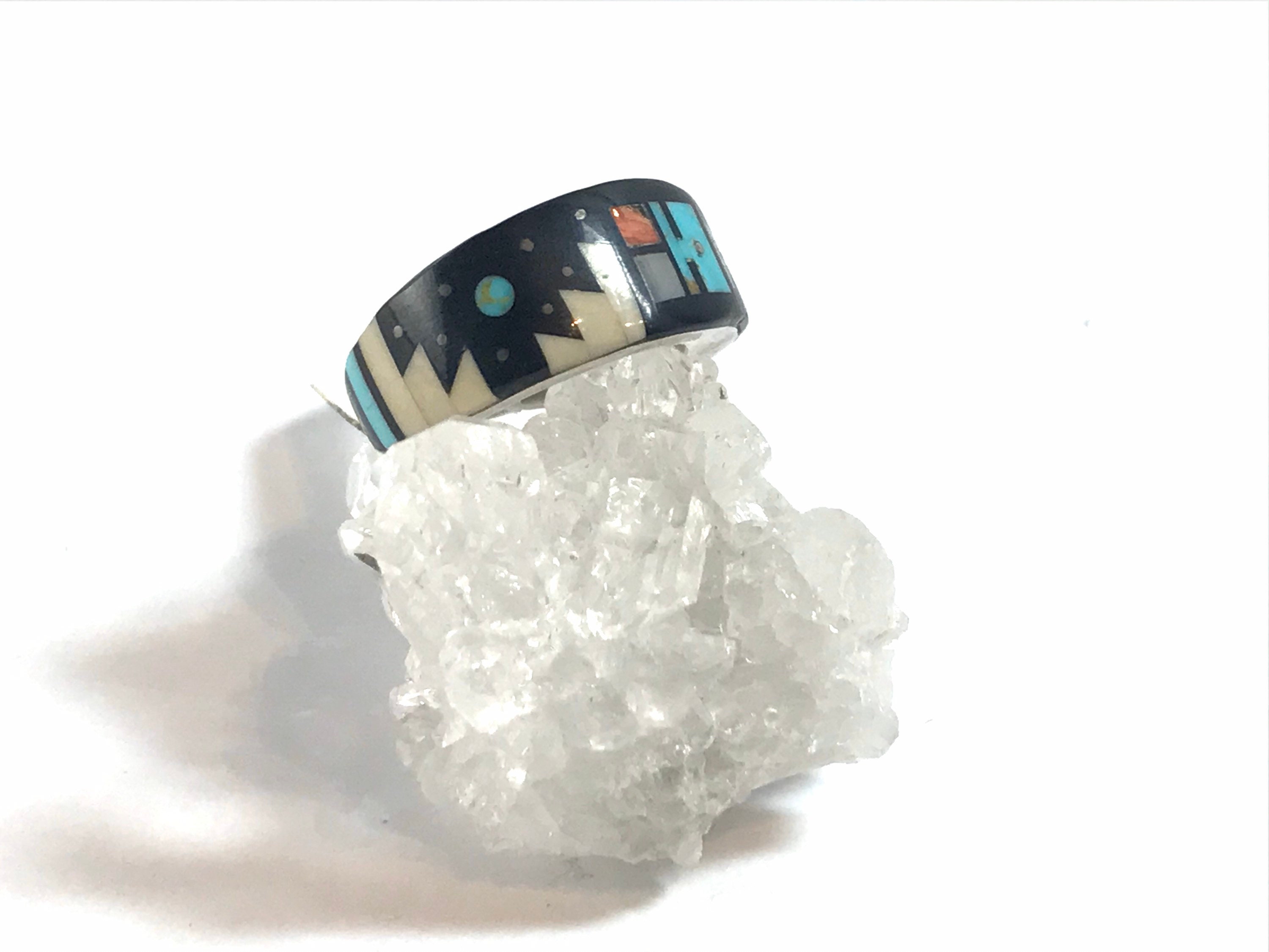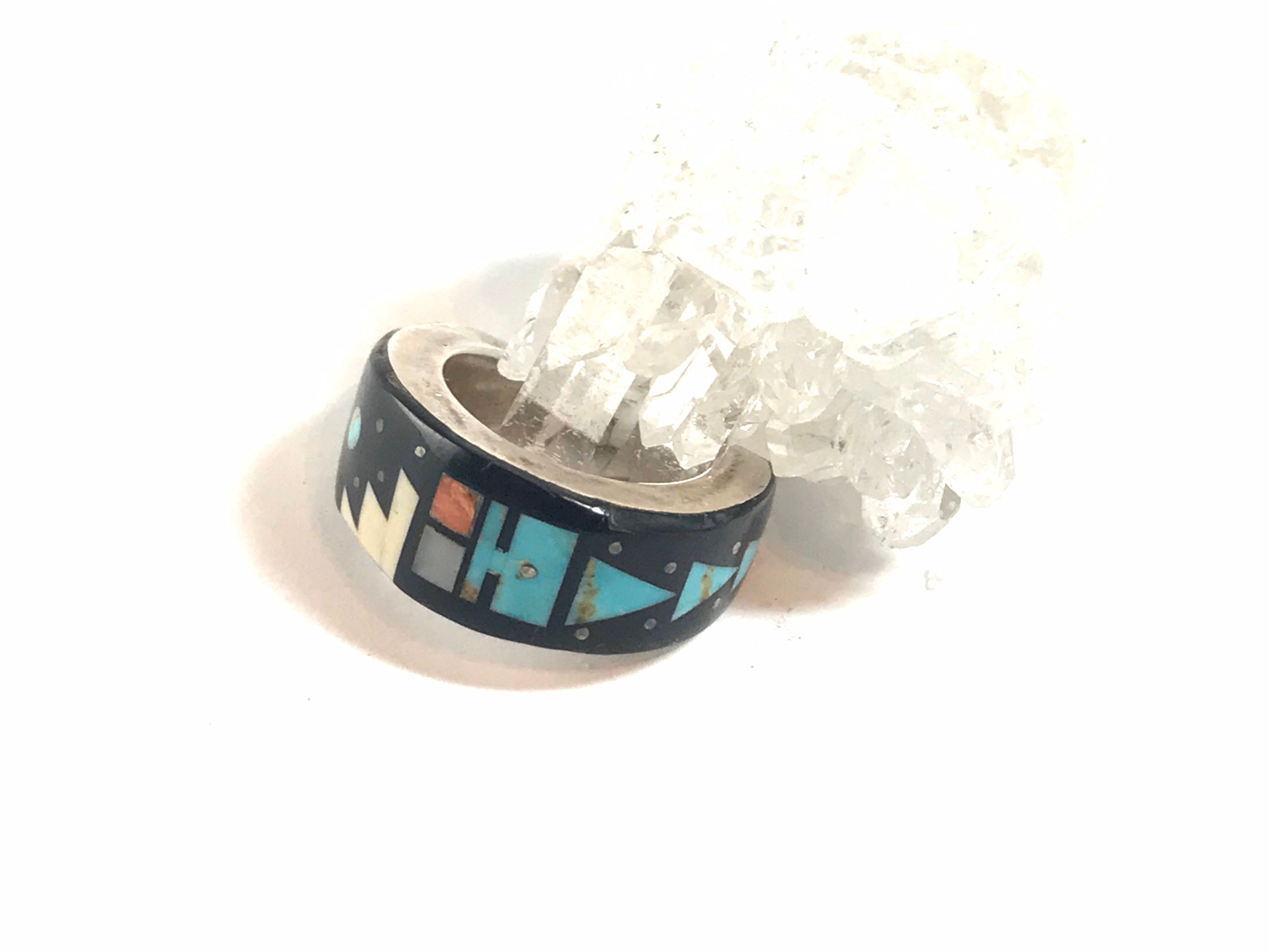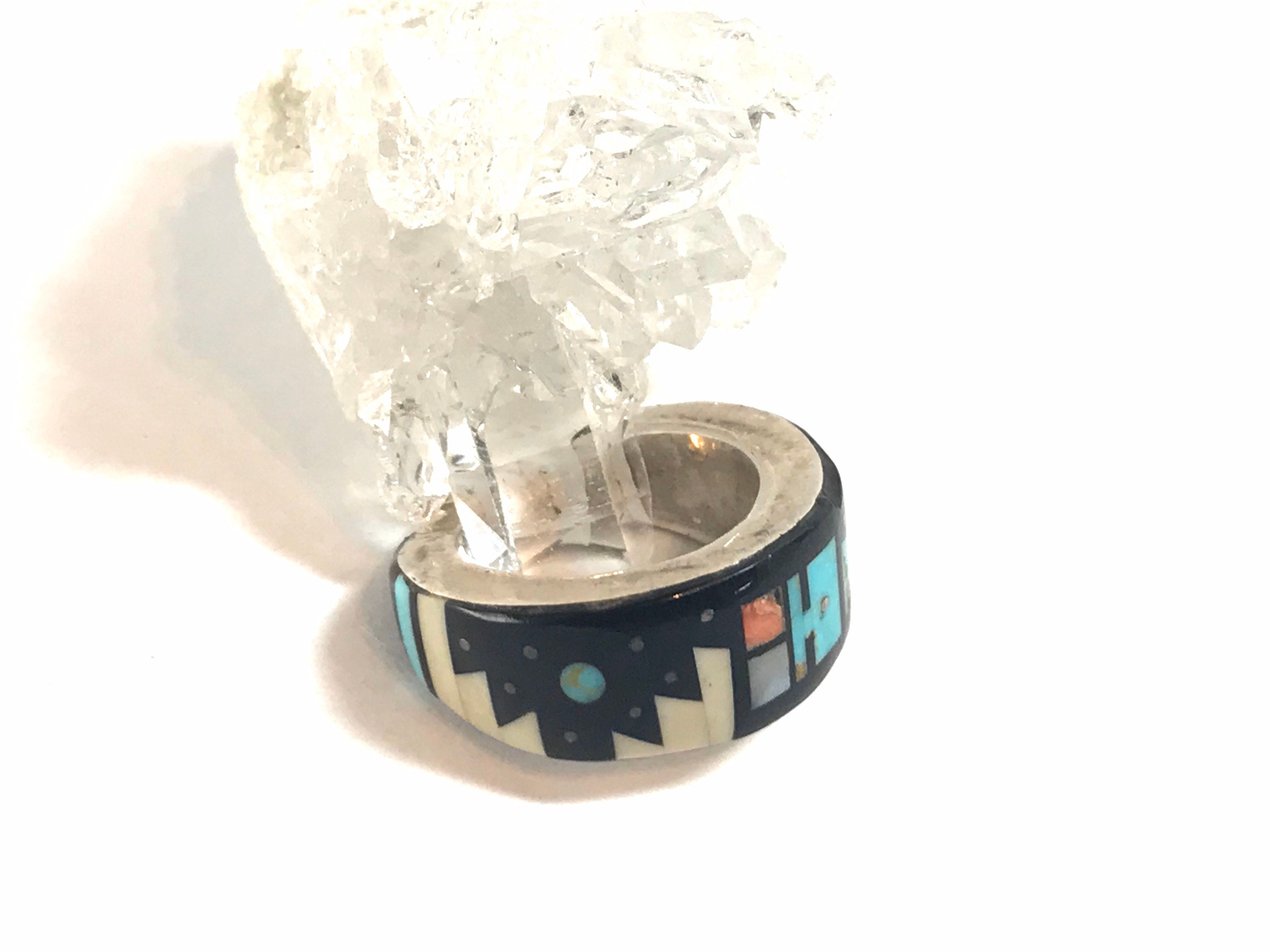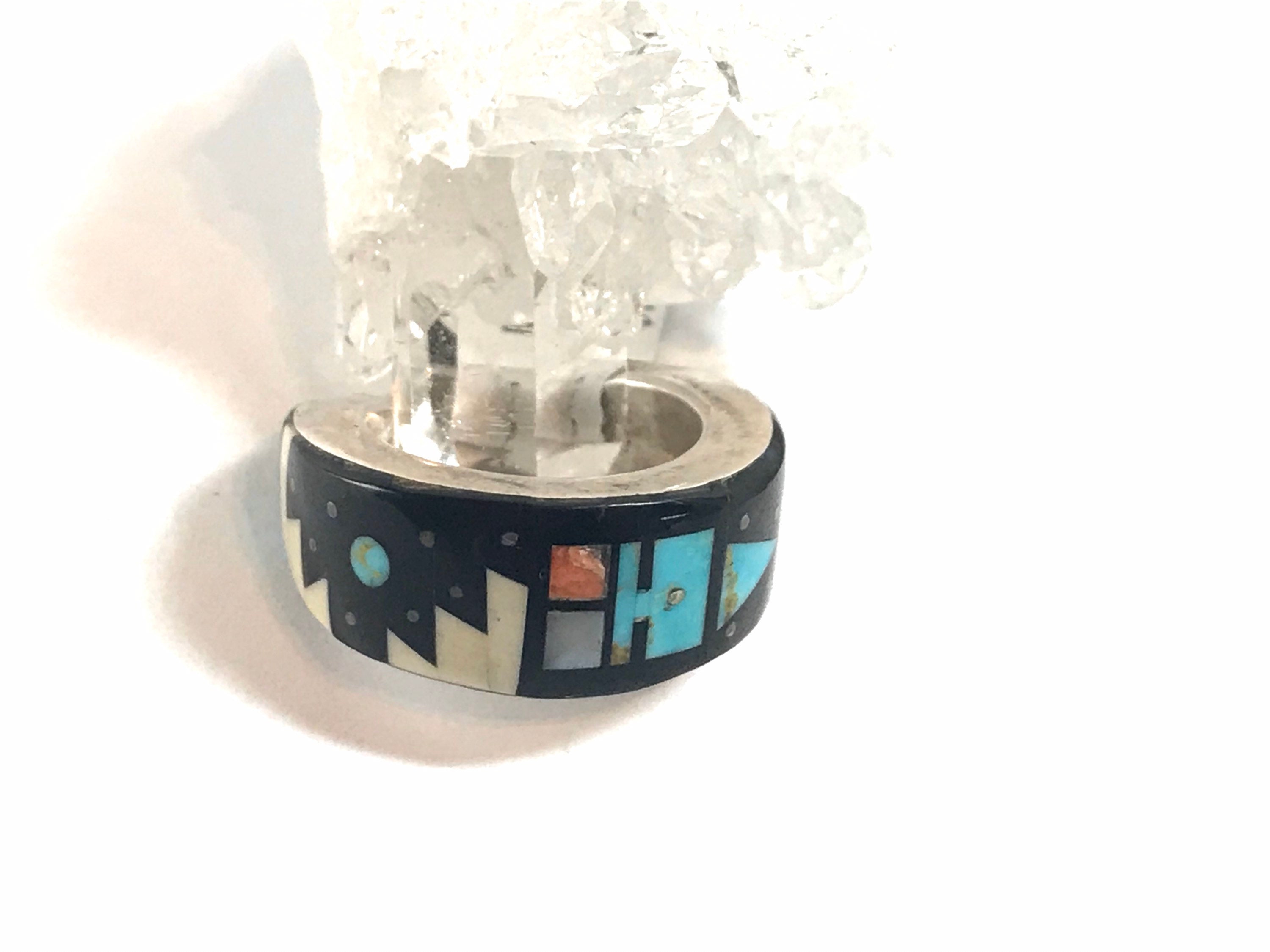 This is a gorgeous and intricate sterling silver inlay ring by renowned Navajo artist Merle House. This beautiful ring features a multistone traditional inlay design made with genuine turquoise, onyx, mother of pearl, opal and various other stone chips. This is a one of a kind ring.