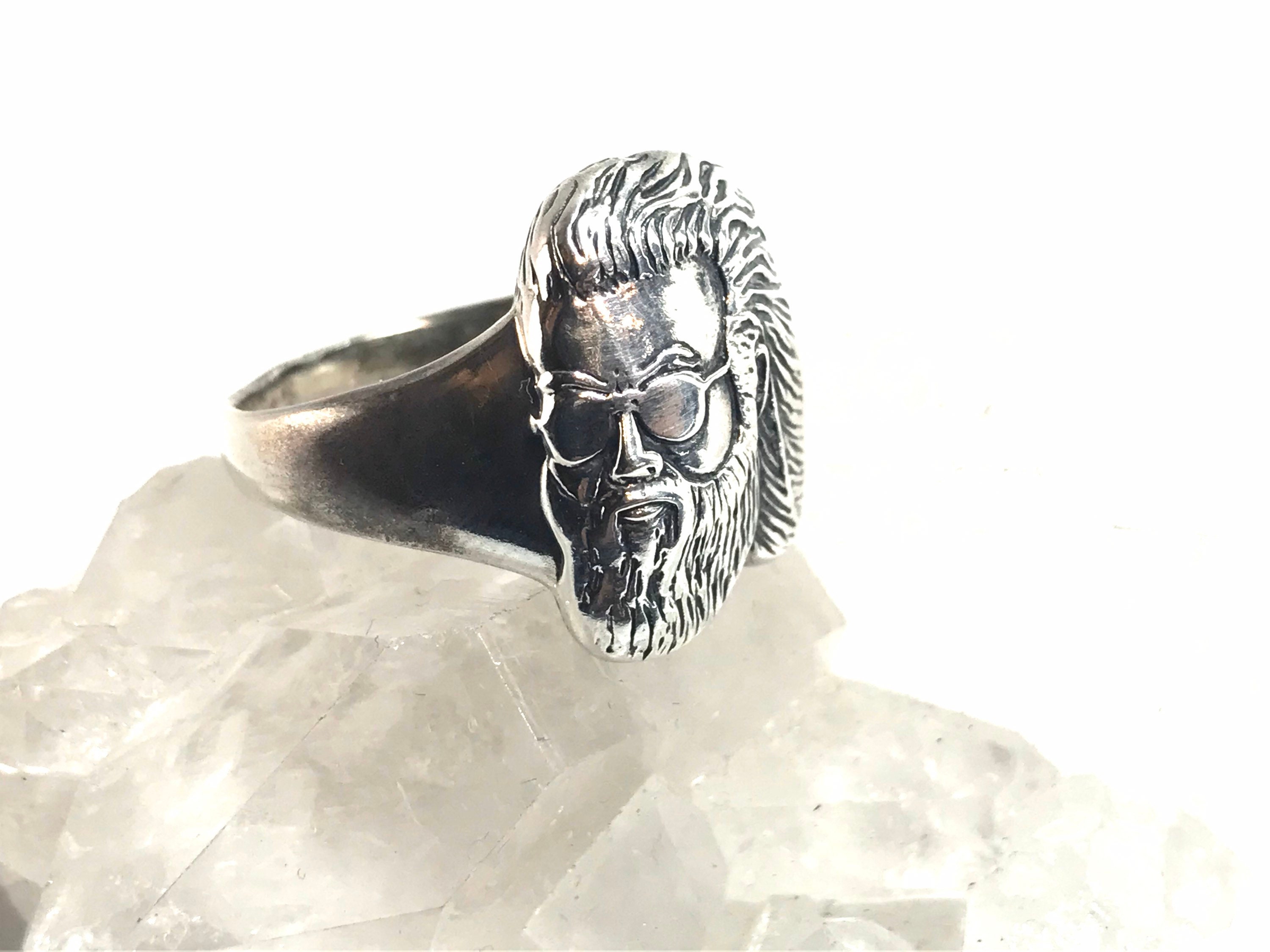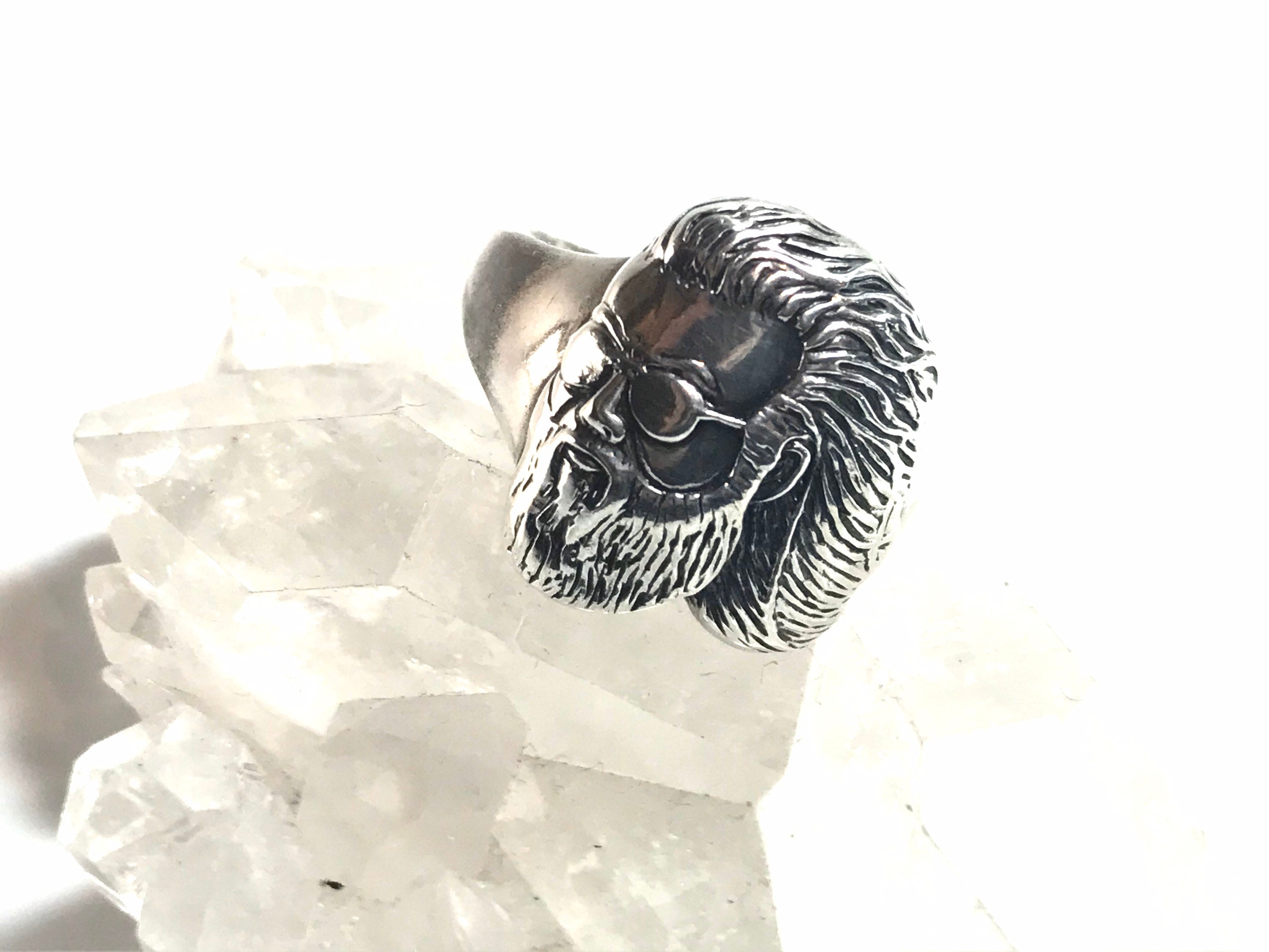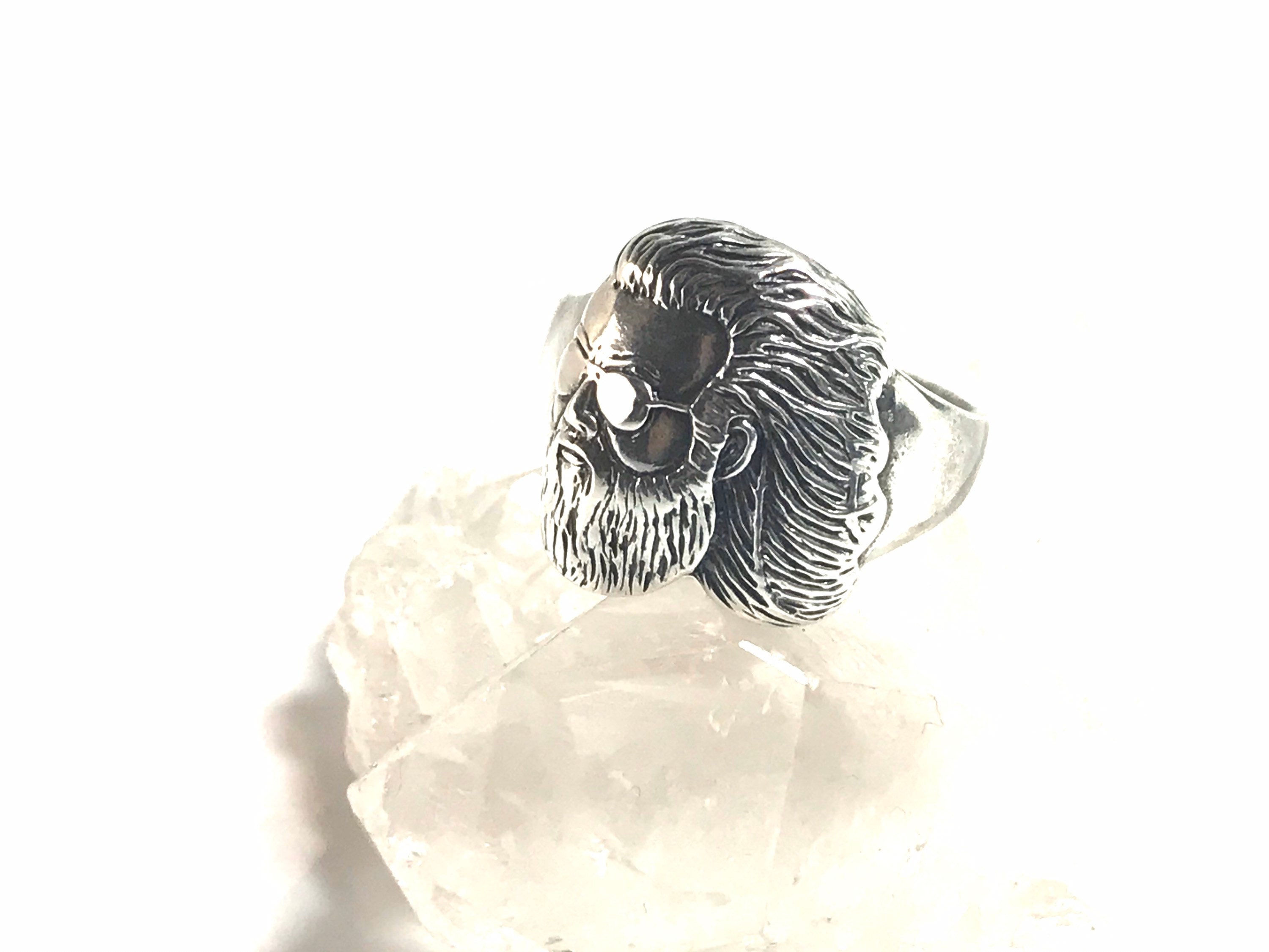 Here we have a lovely hand-cast ring which features the image of Jerry Garcia's face. The design of this ring is based on the famous photo of Jerry gazing at the pyramids while in Egypt with the Grateful Dead. This ring boasts very fine and detailed craftsmanship.