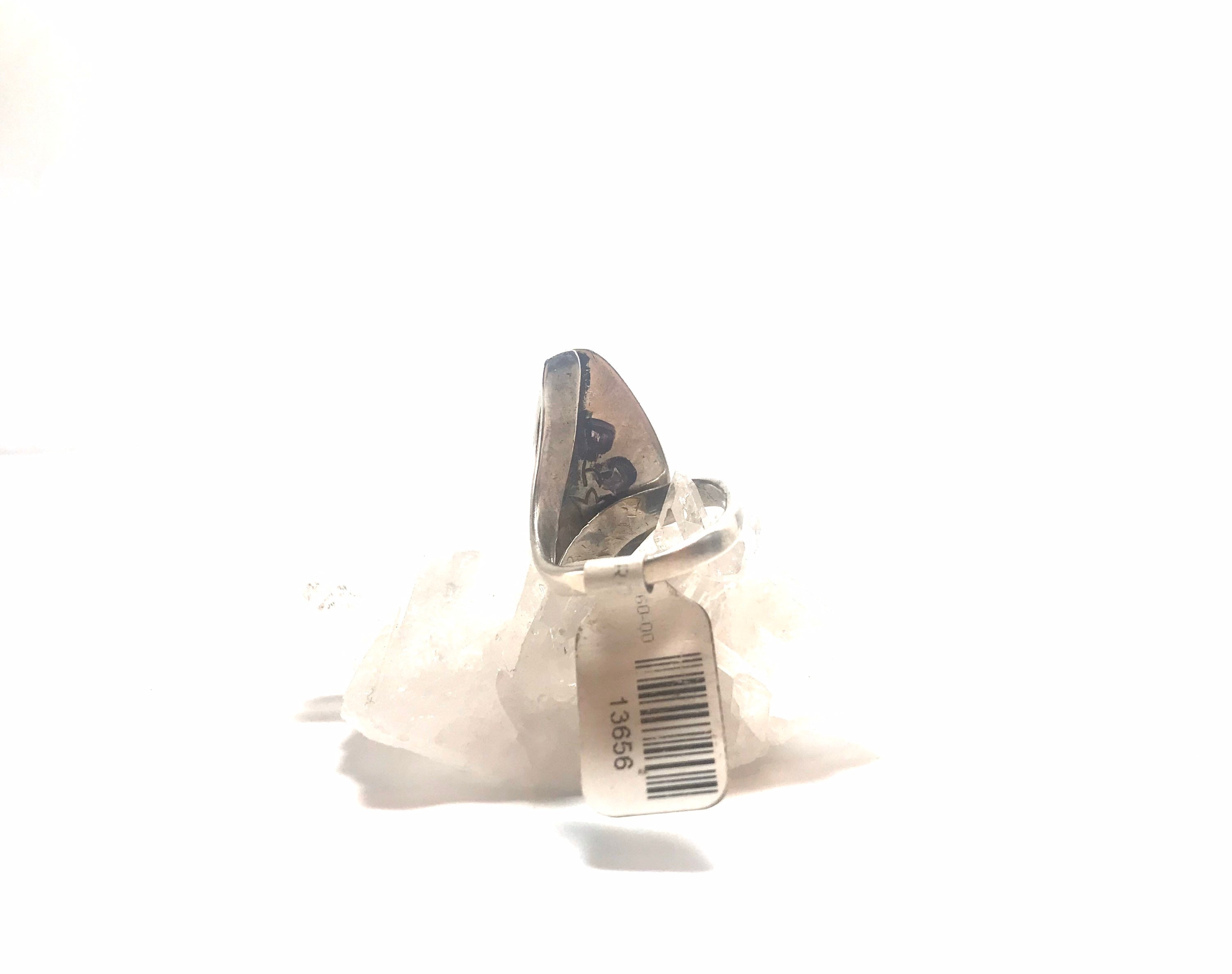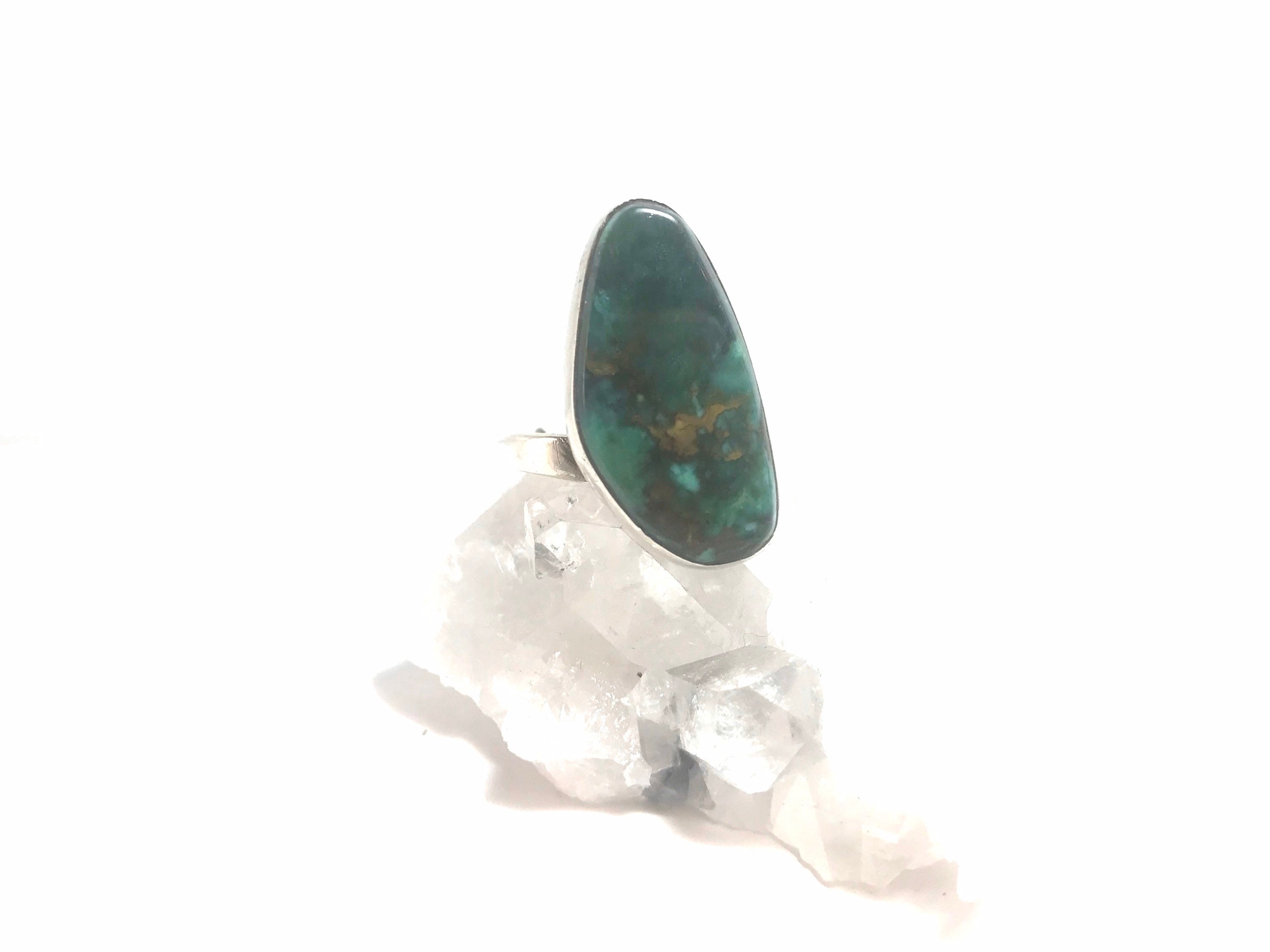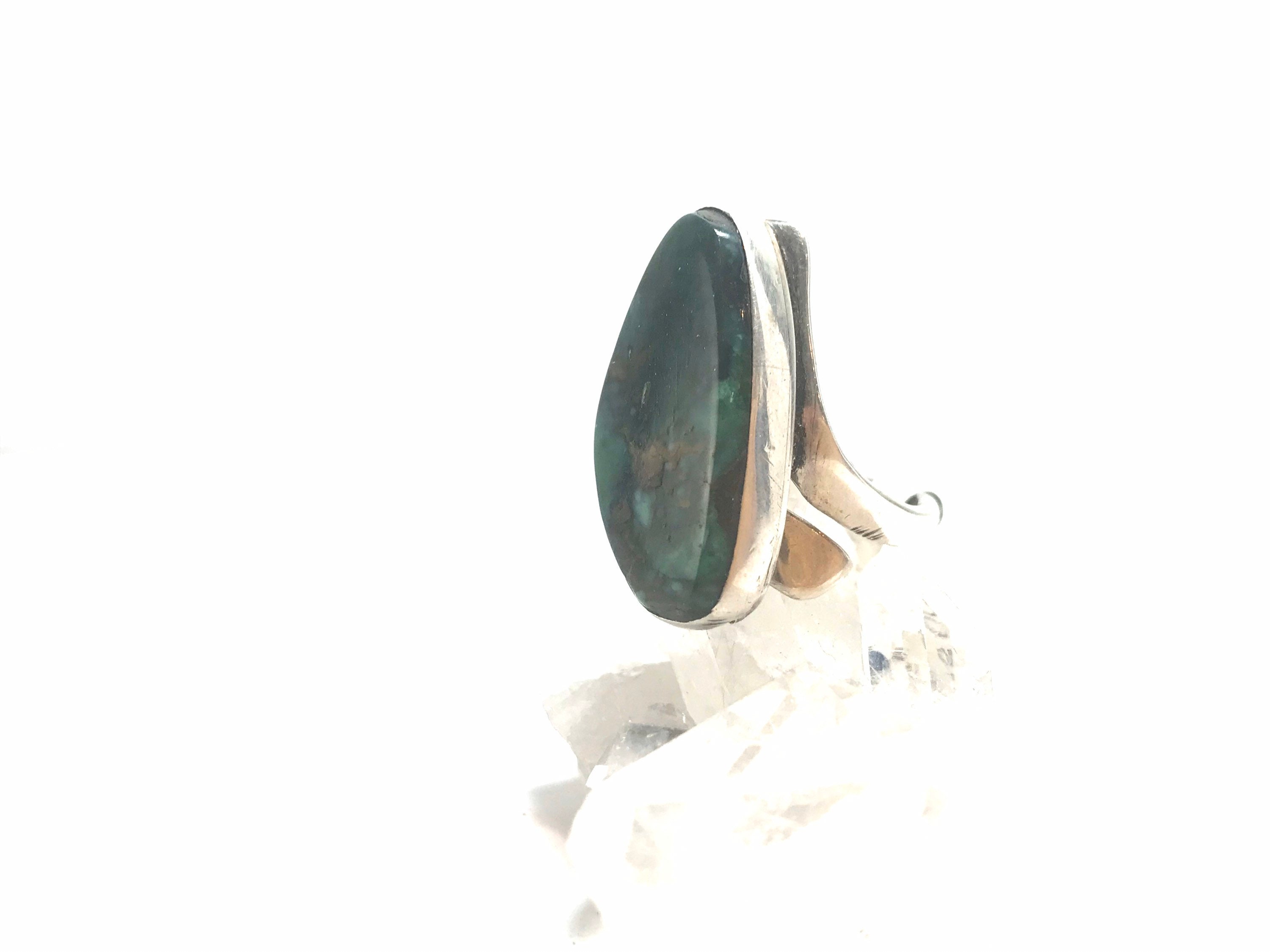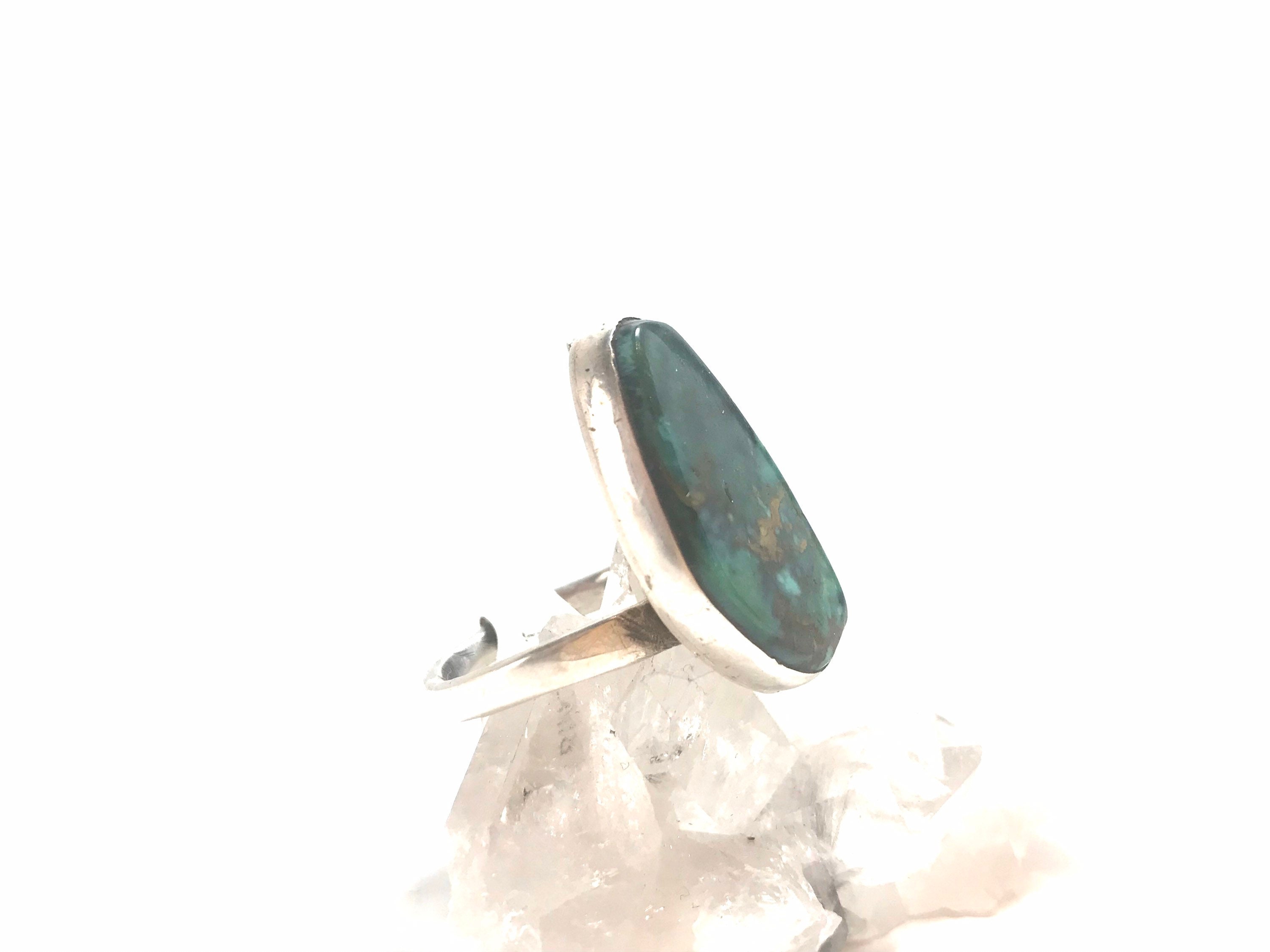 This is a Navajo handmade sterling silver ring that is currently at a size 8, but is adjustable. This ring features a gorgeous piece of green turquoise.