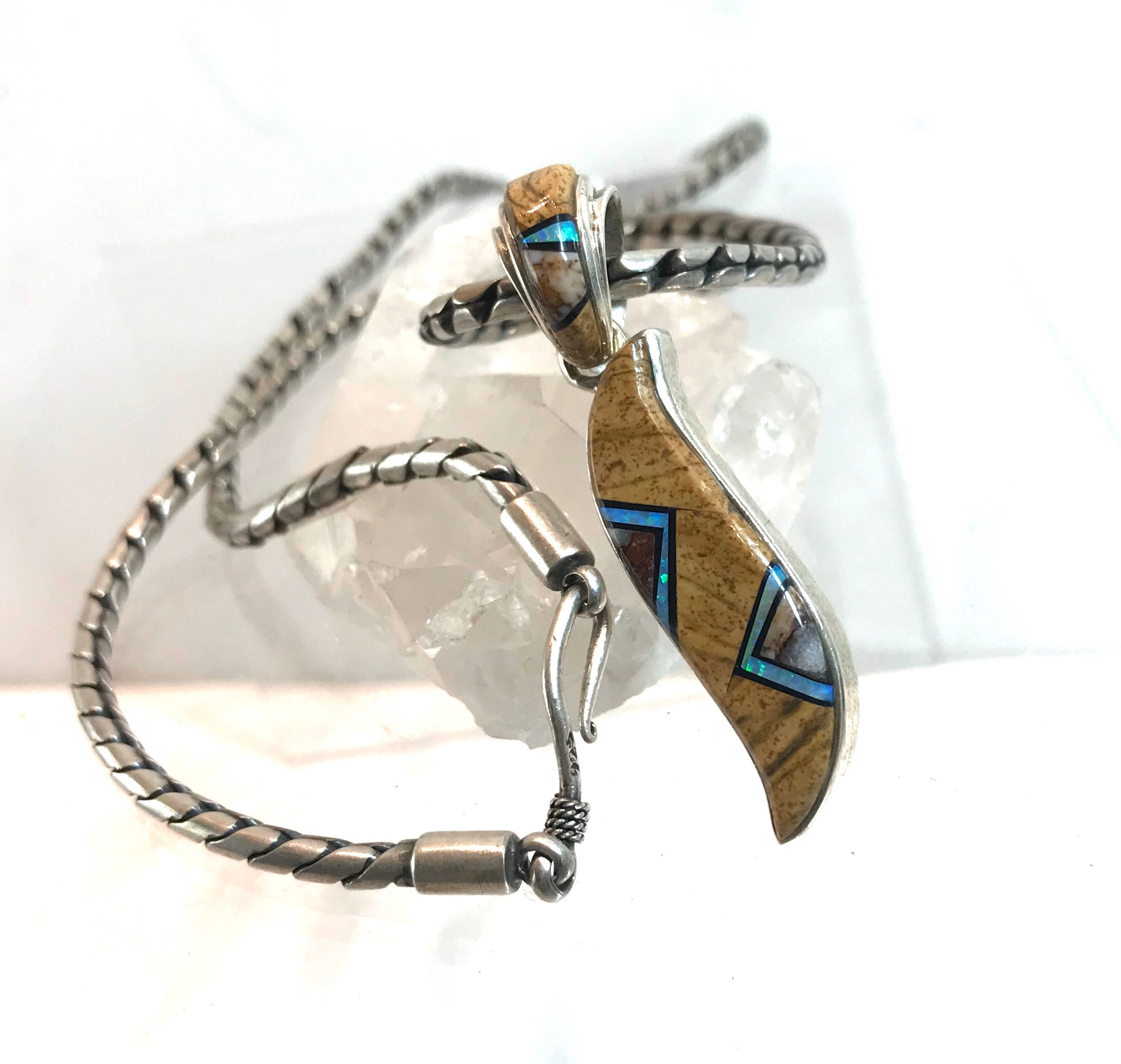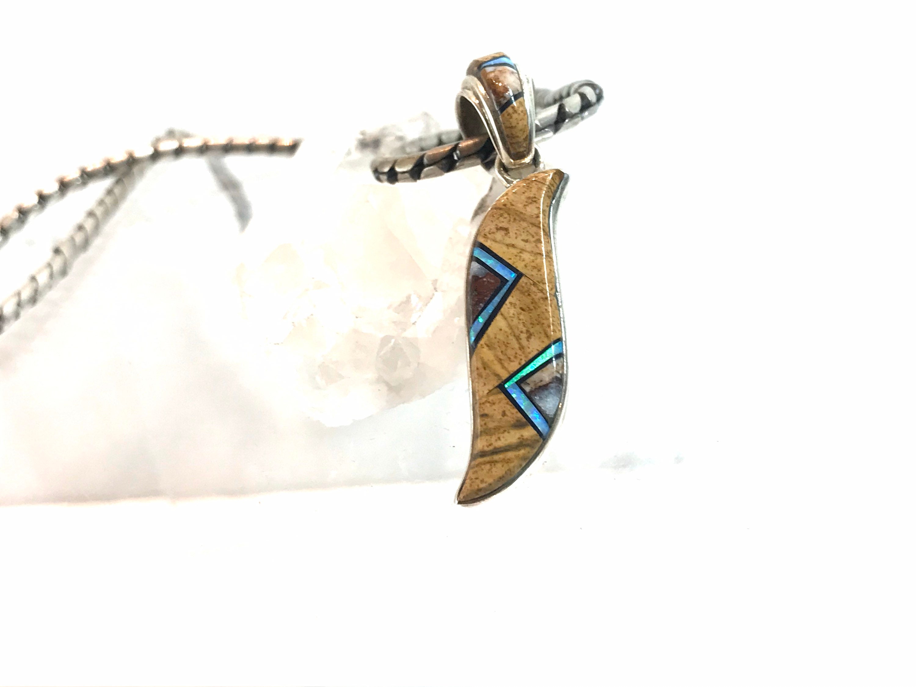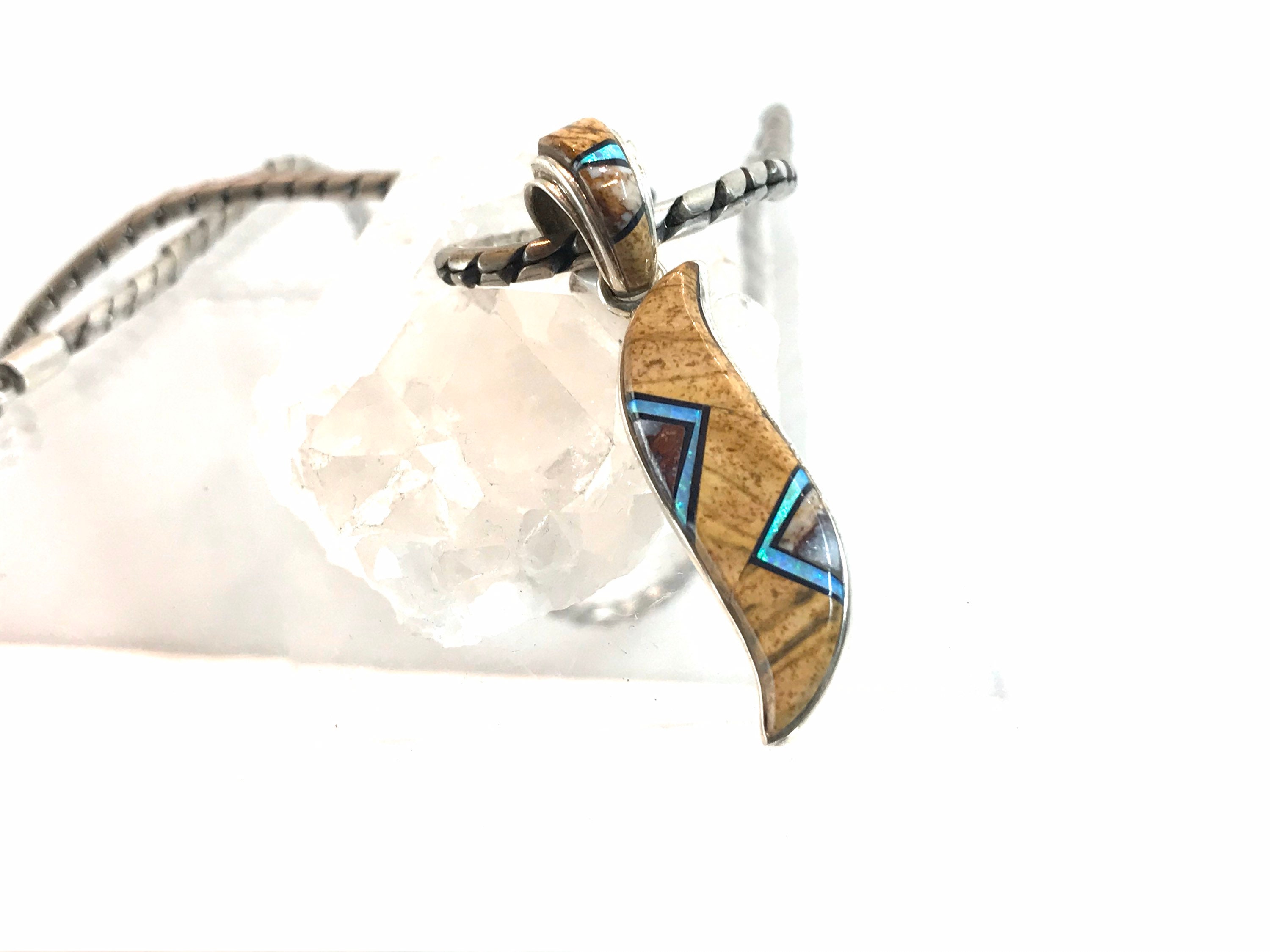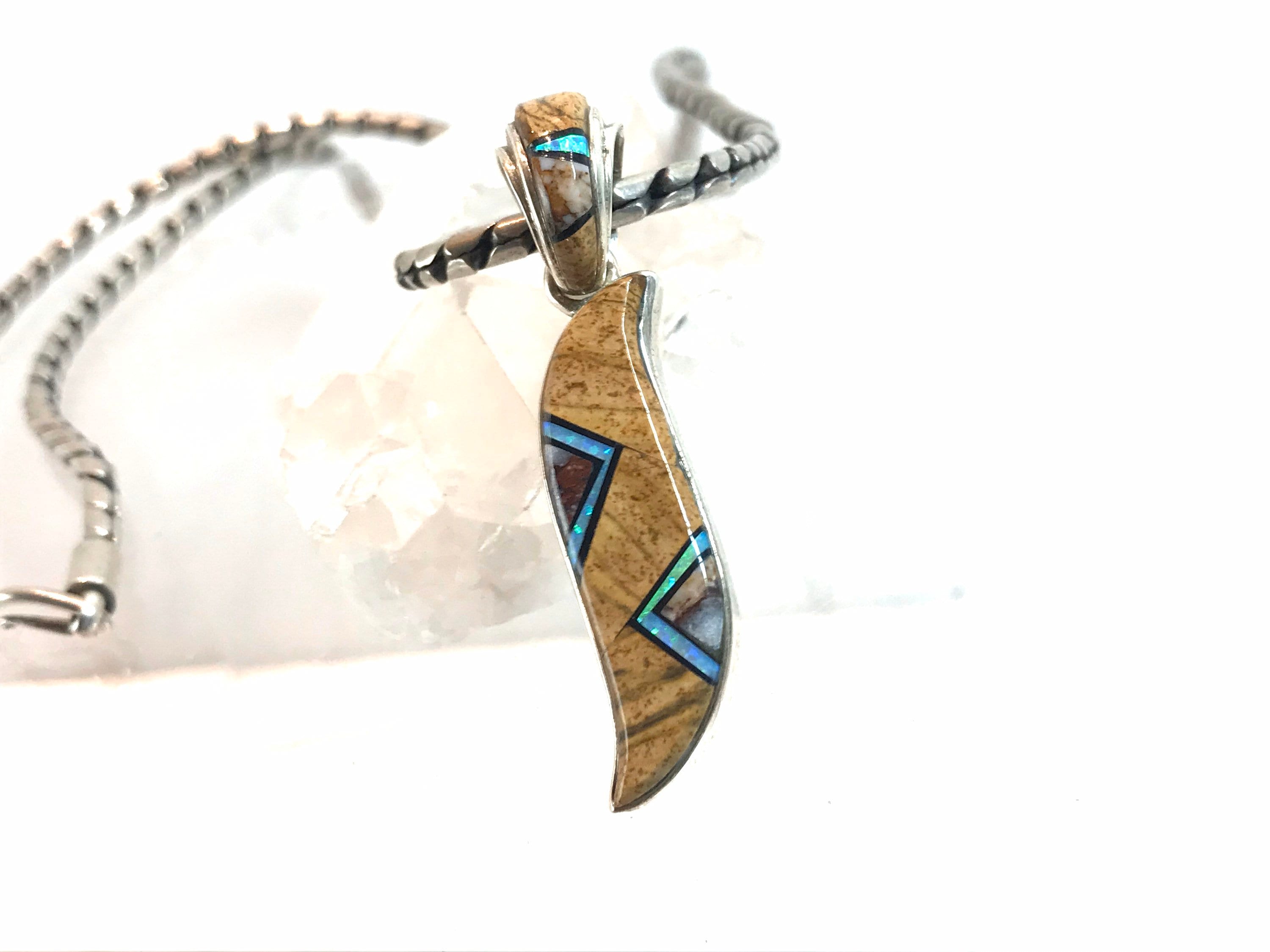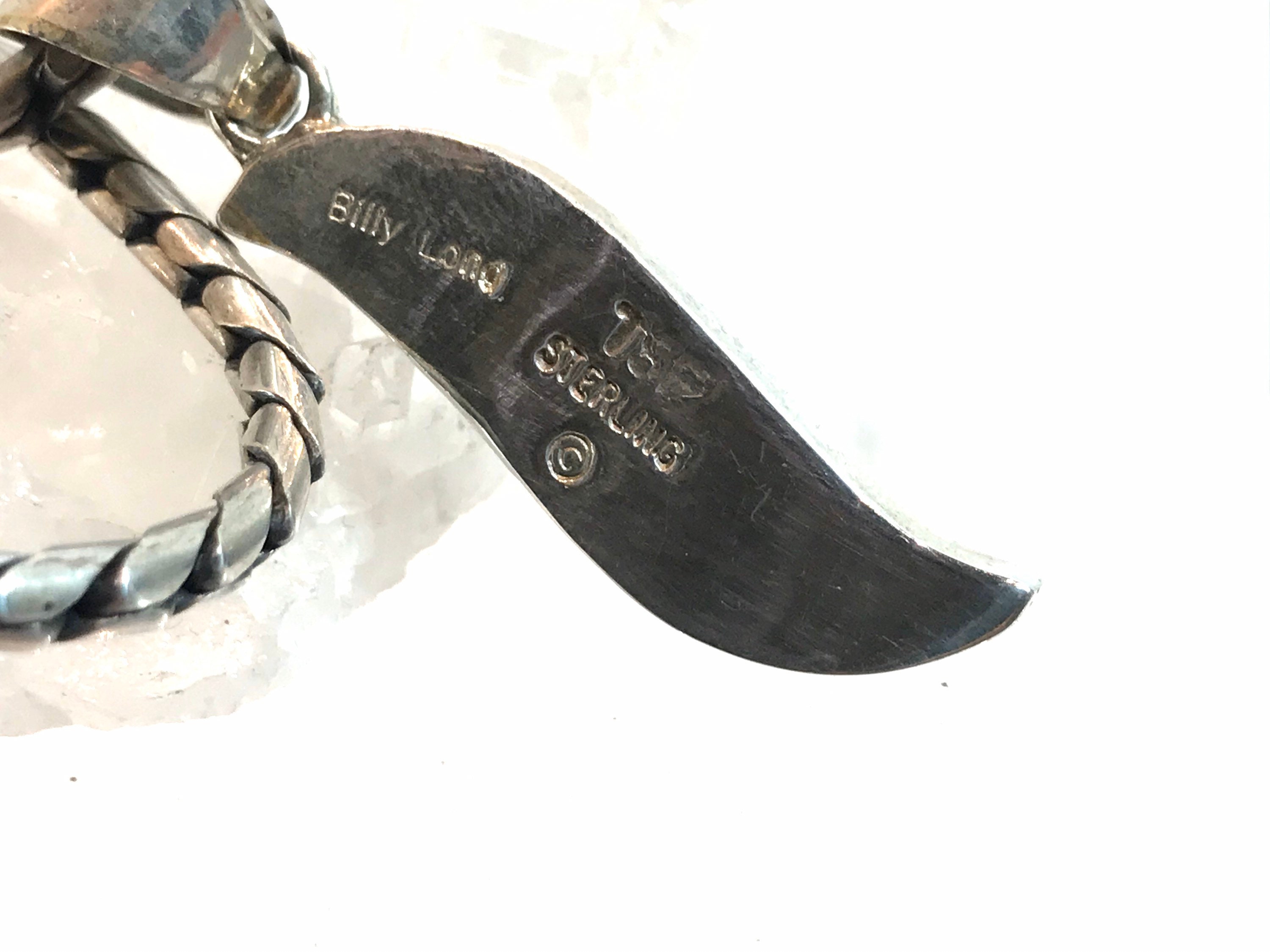 This is a truly stunning vintage one of a kind pendant by renowned Navajo artist Billy Long. Set in sterling silver, this pendant features an intricate inlay of opal and rhyolite. Pendant is signed by the artist.
