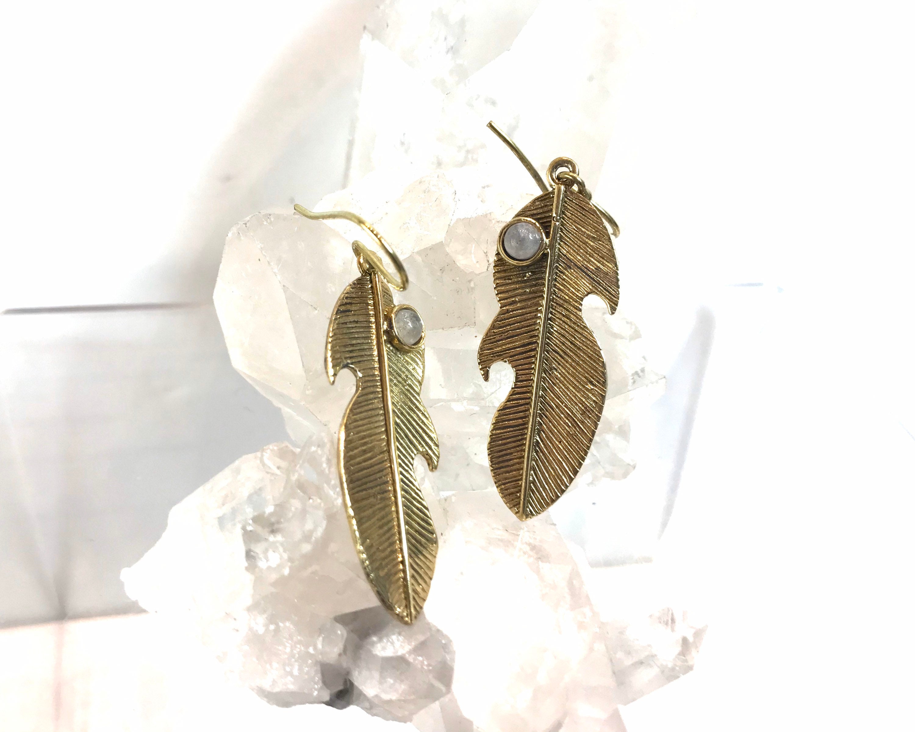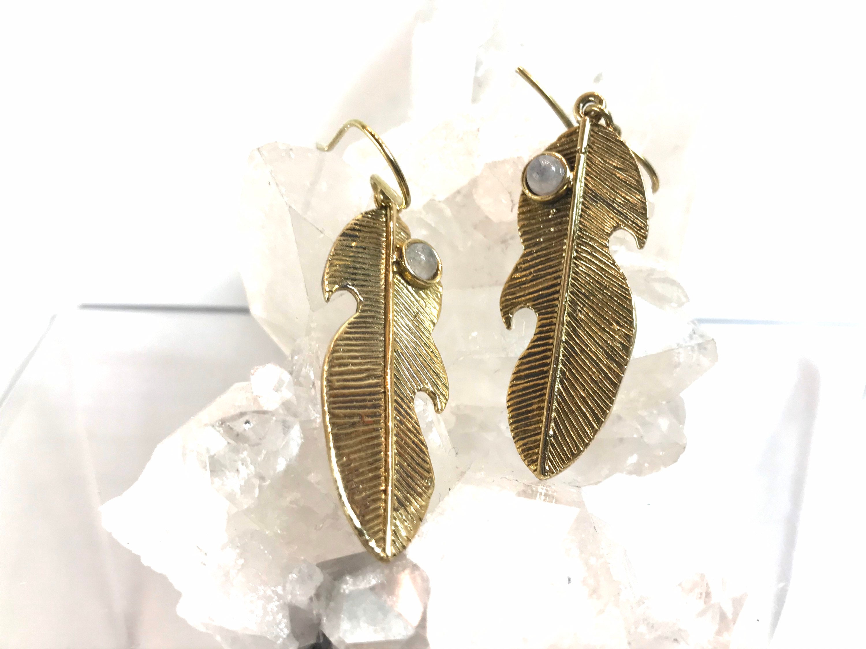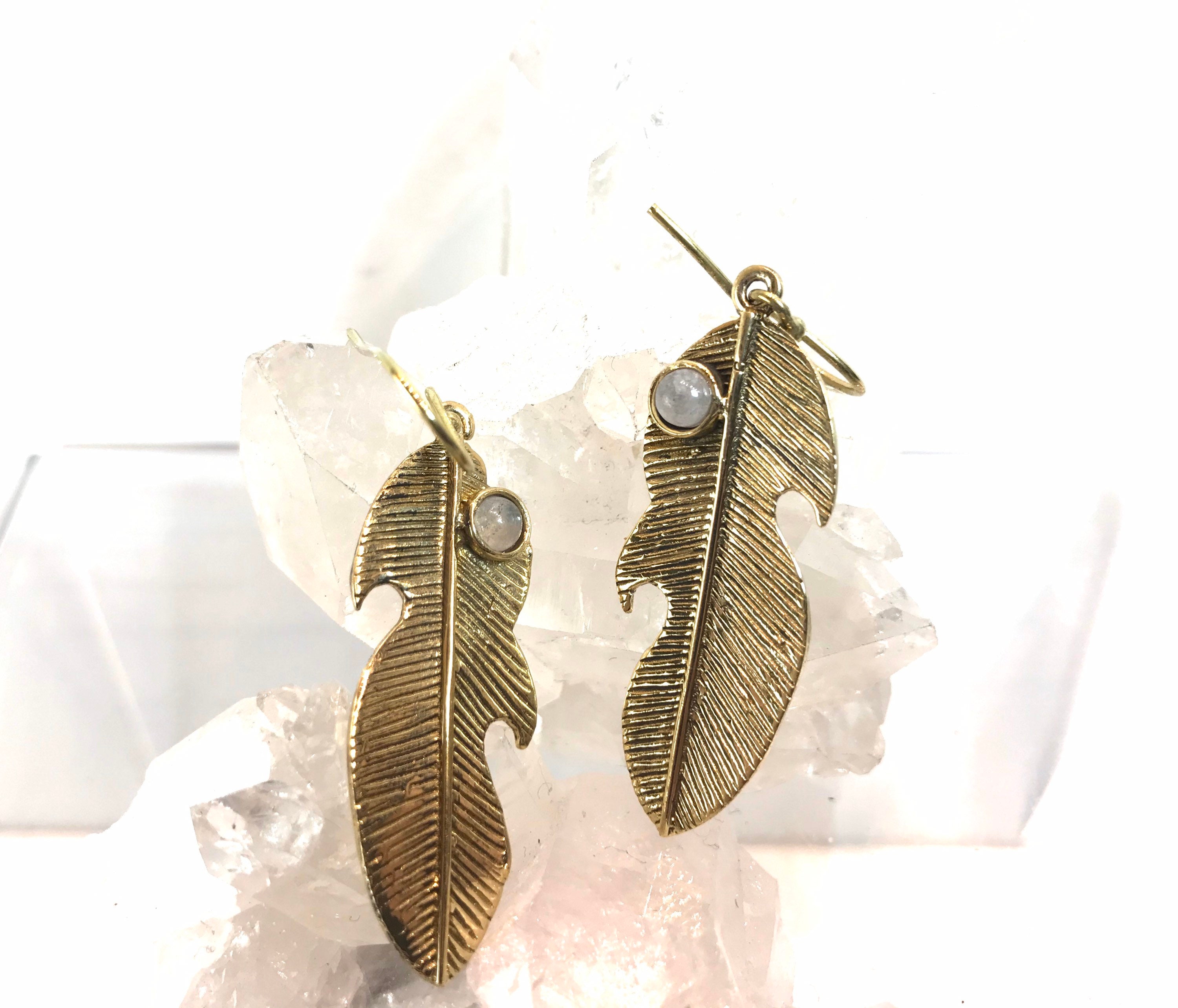 Simple and detailed feather design earrings featuring genuine moonstone cabochons made with pewter in gold color with patina.