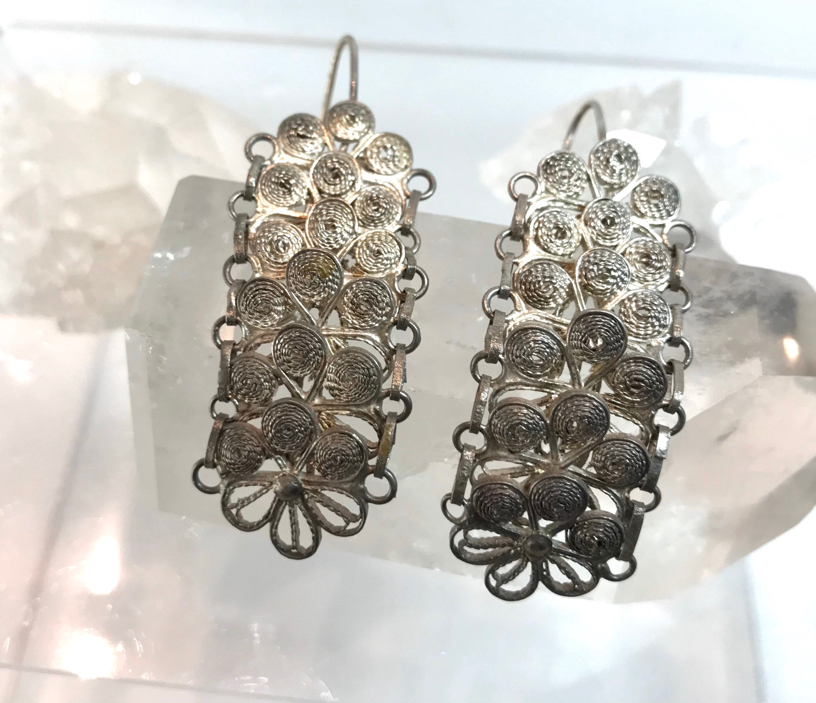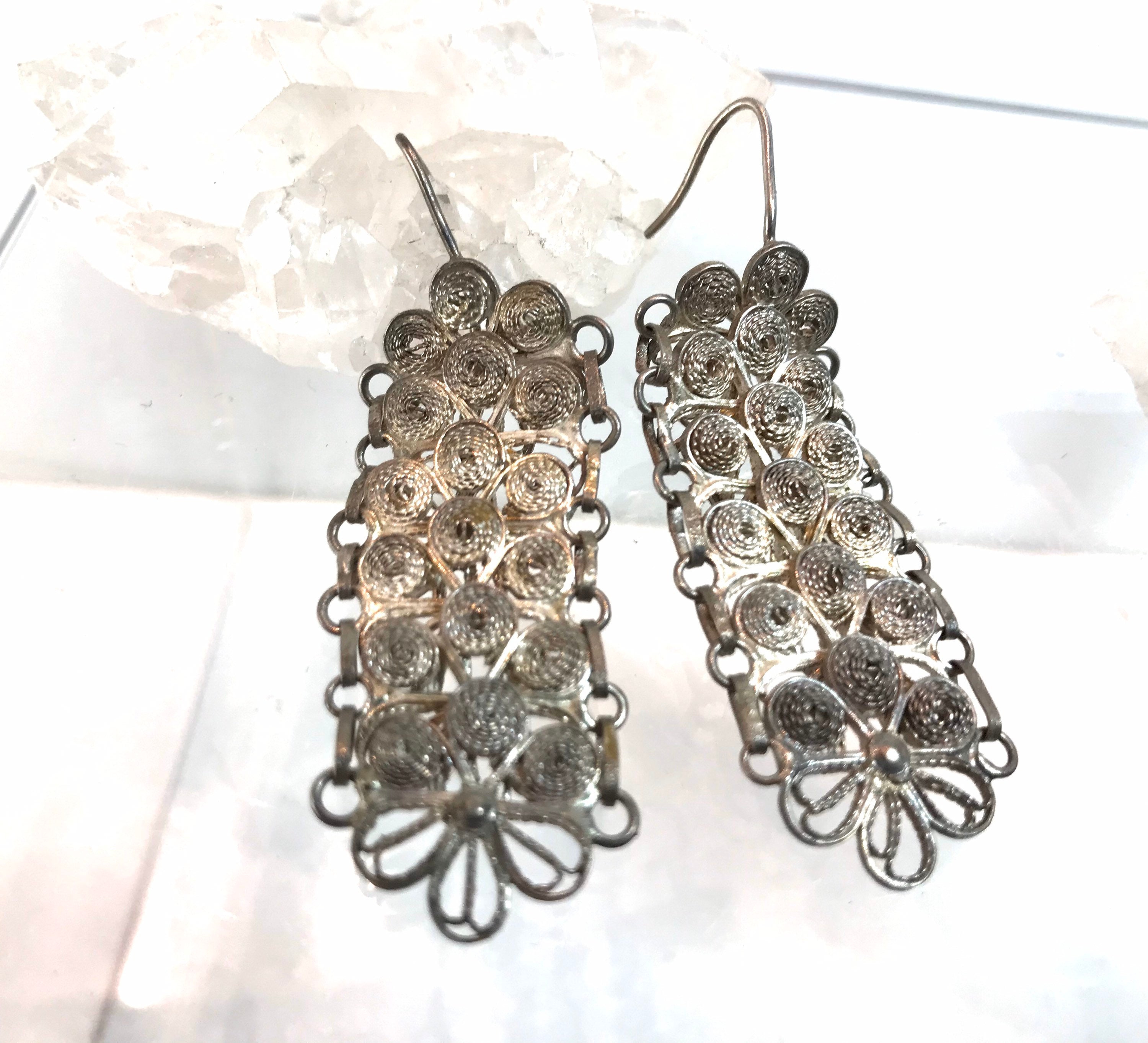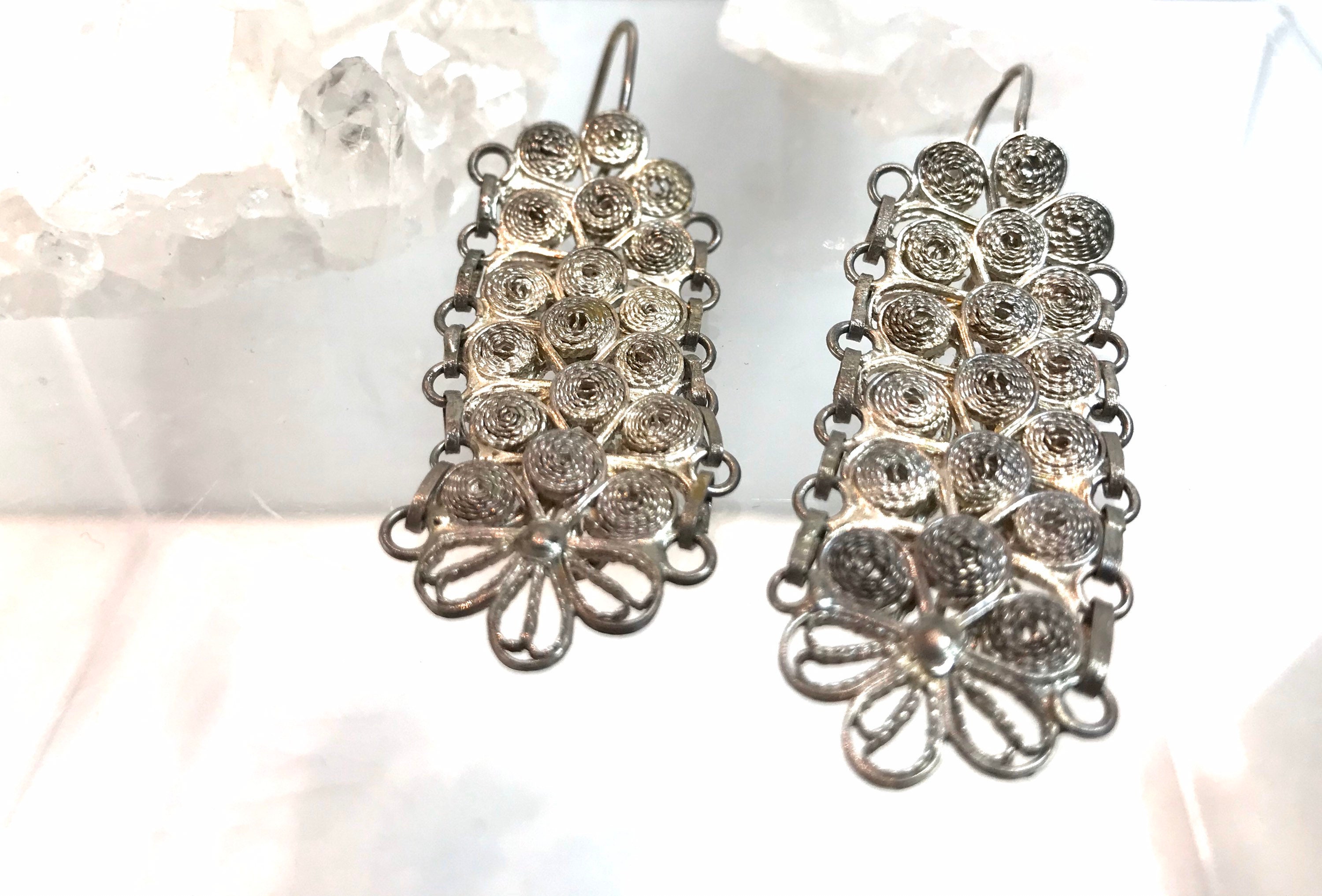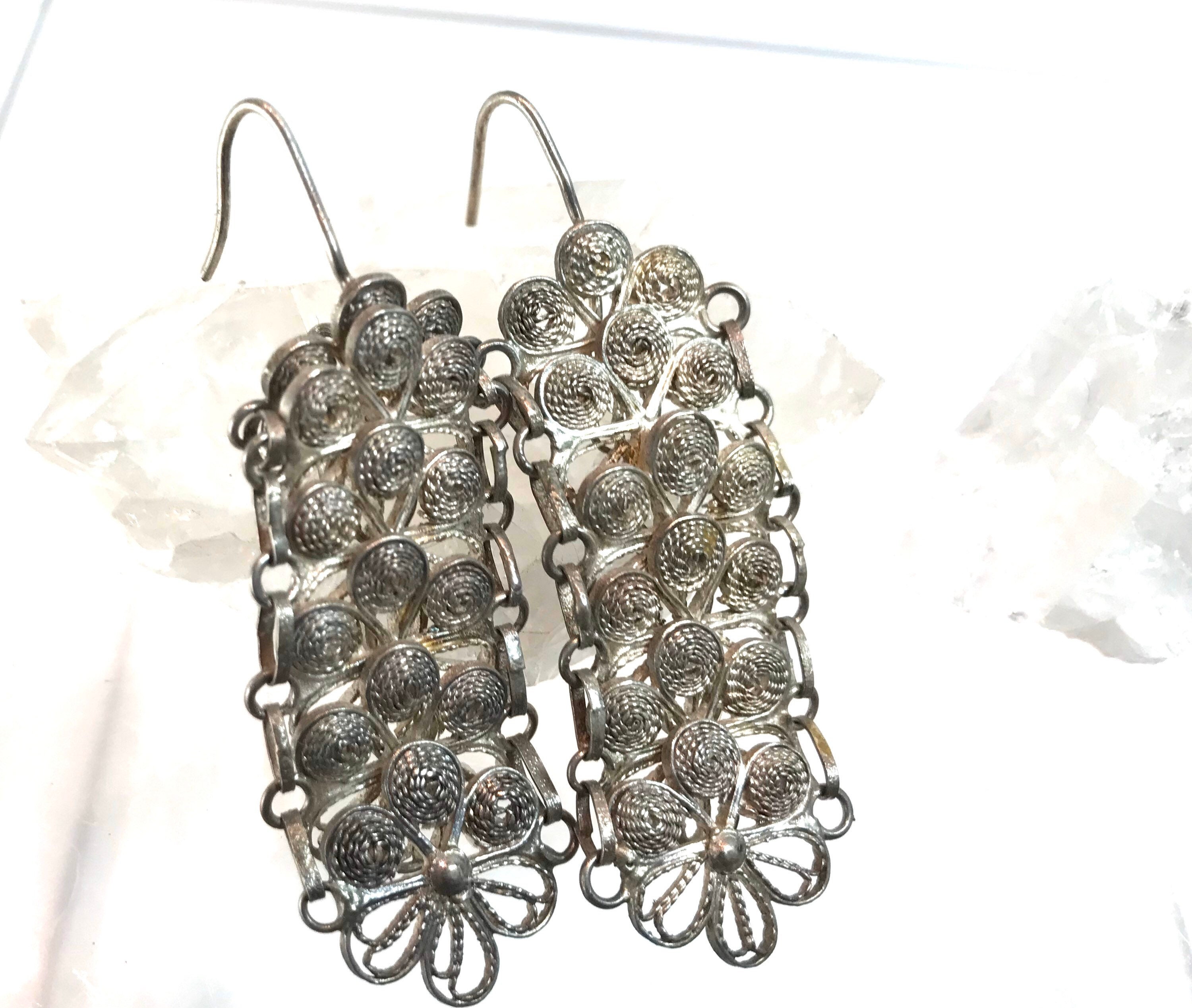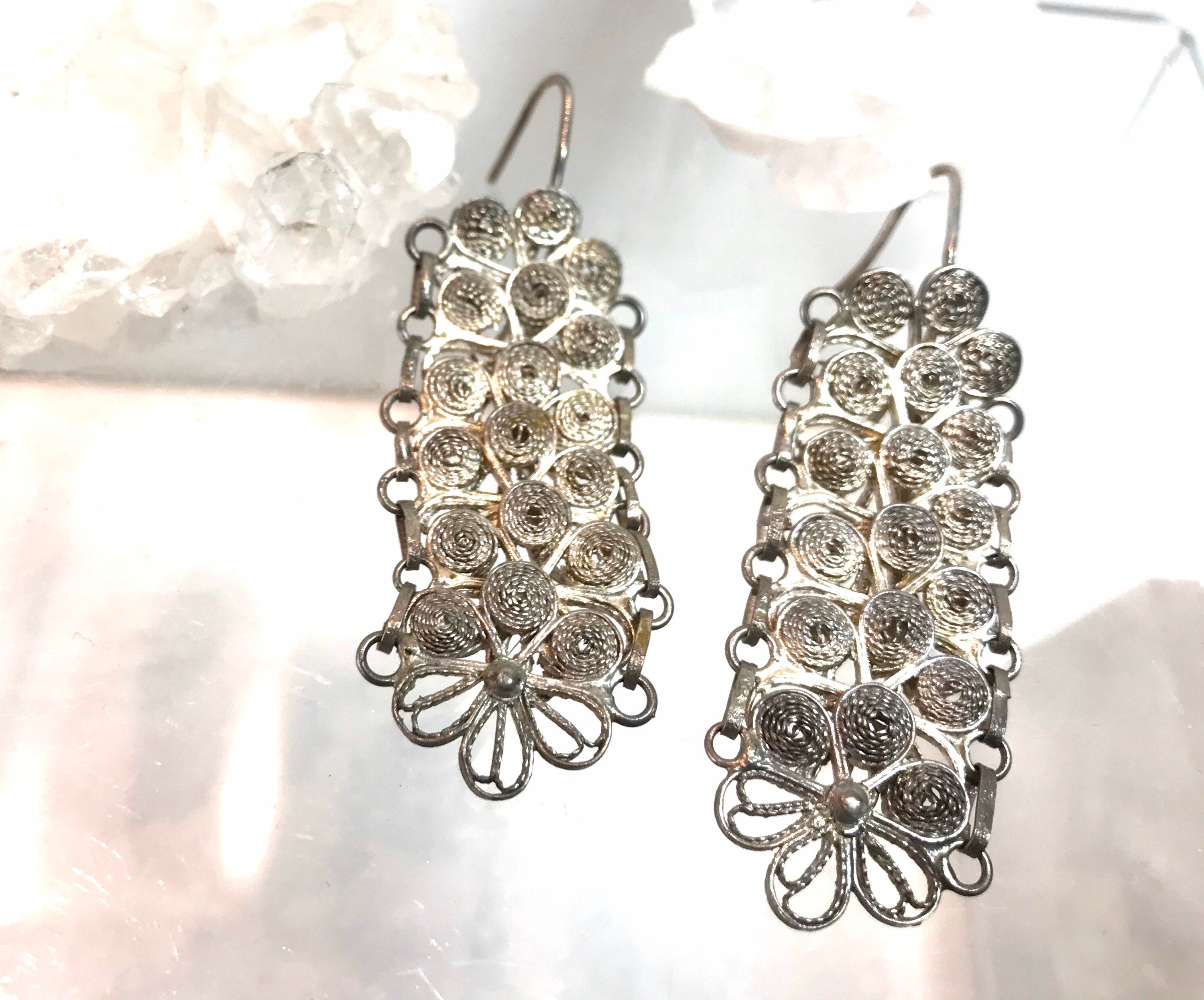 Big and beautiful one of a kind pair of vintage sterling silver earrings featuring a unique floral chain design.